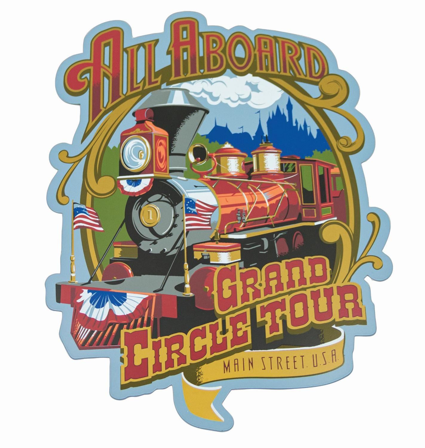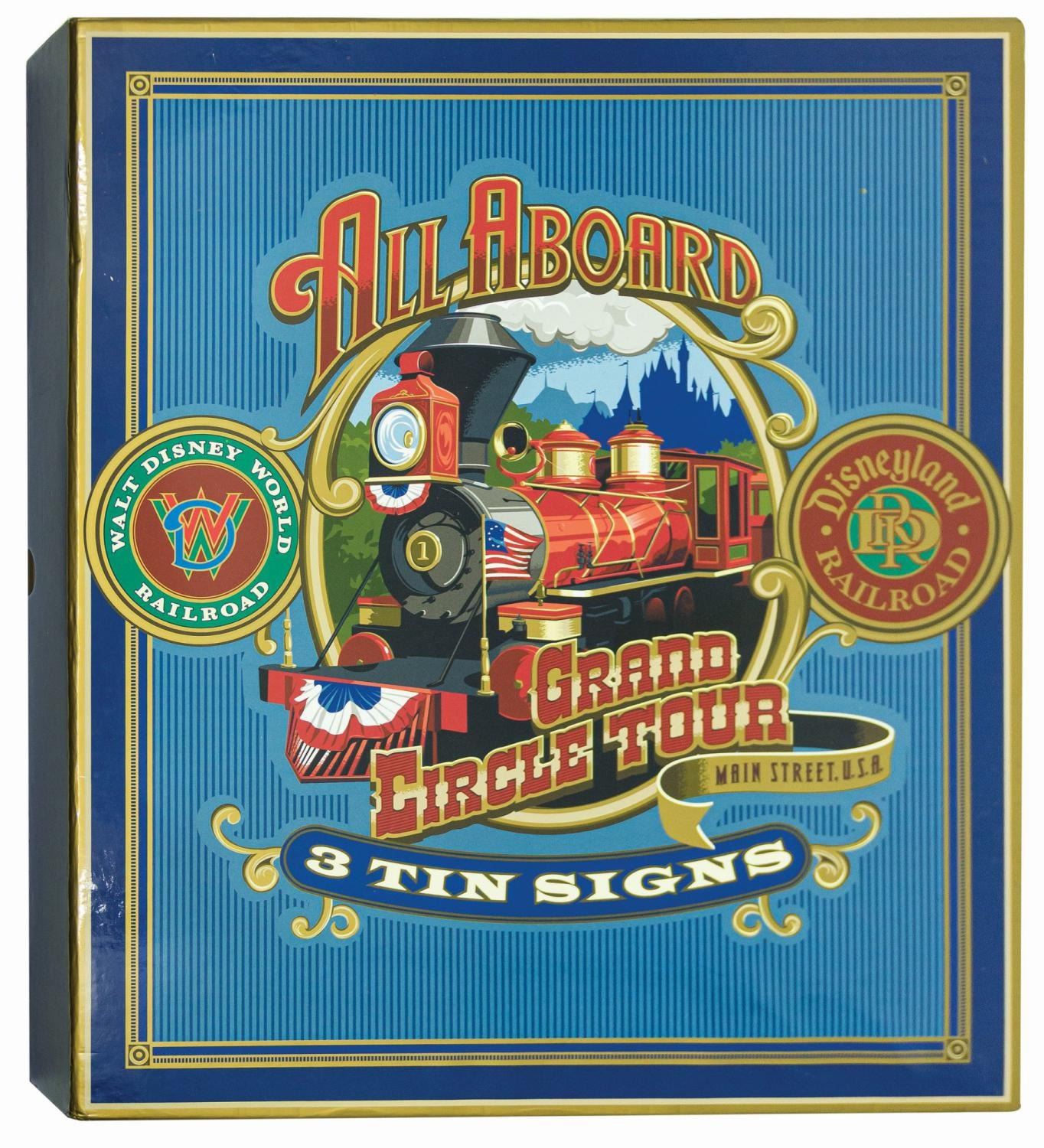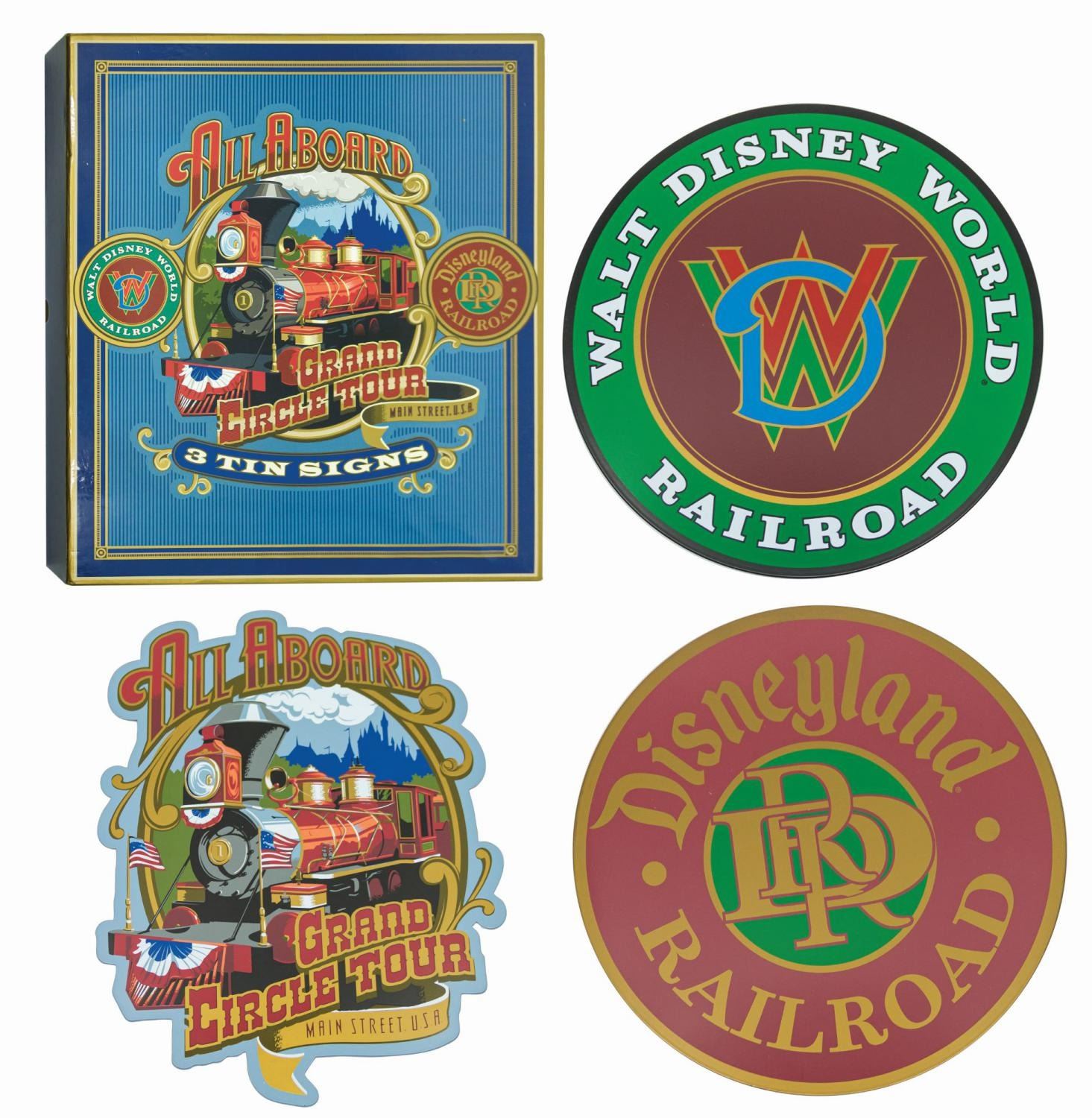(Disneyland, c.2000s) A collection of (3) tin signs created as part of the Grand Circle Tour series, based on the railroads of the Disney Parks. Included are signs based on the logos for the Disneyland and Walt Disney World railroads, as well as the Grand Circle Tour logo. The signs come in their original box measuring 15.75"x13.5" and 1.75" deep. The condition of the signs is very good with minimal wear to the box.