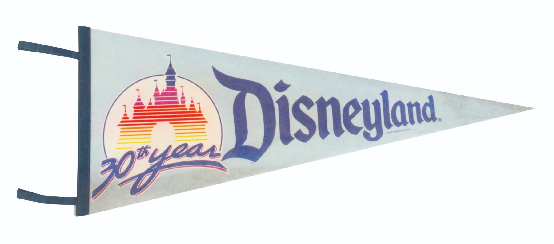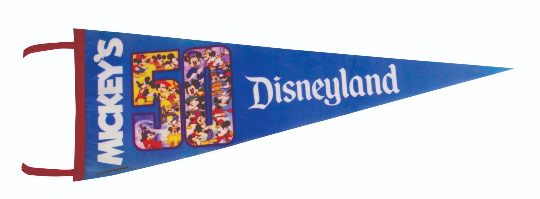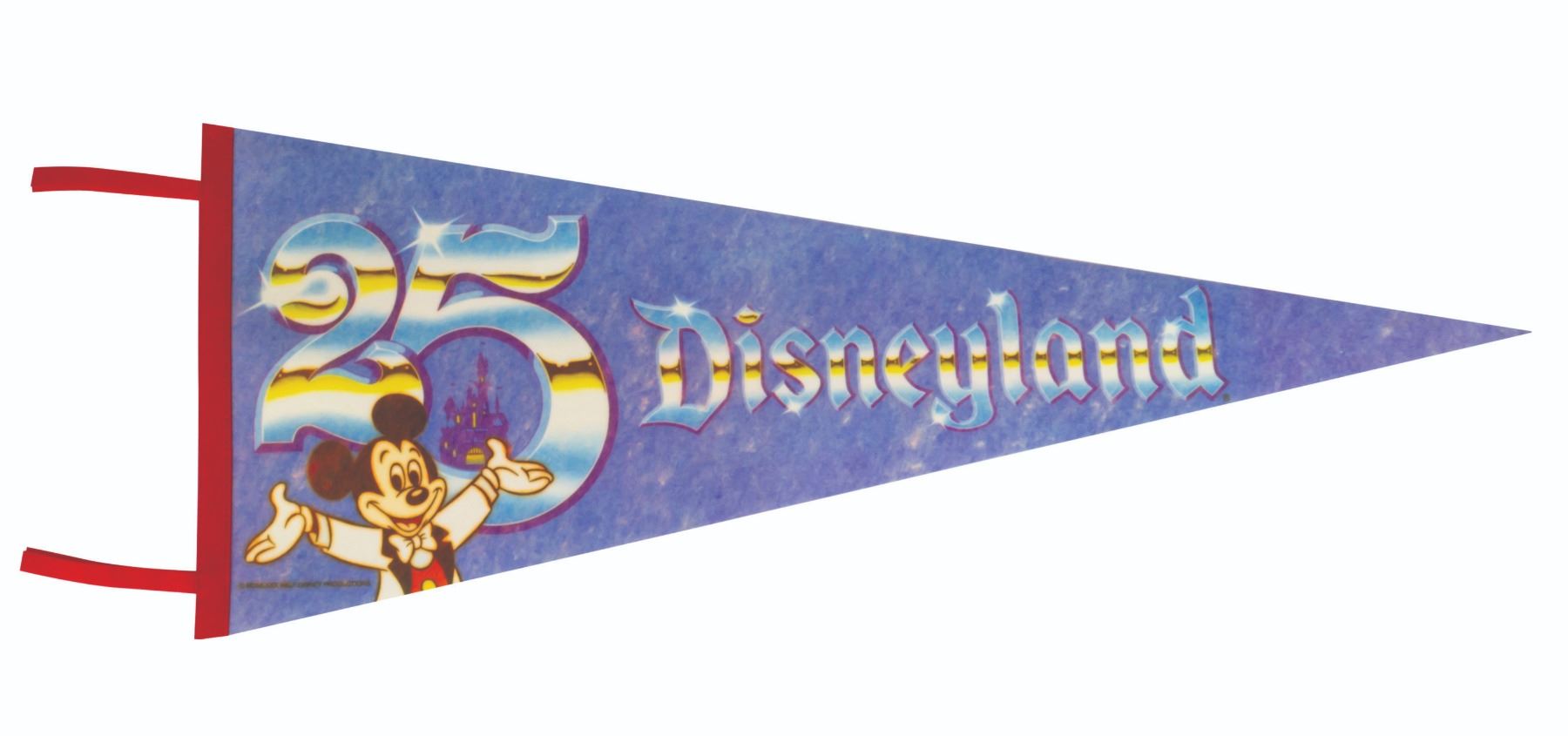 (Disneyland, 1978-85) A wonderful set of (3) commemorative pennants created to celebrate the 25th and 30th anniversaries of Disneyland, as well as Mickey Mouse's 50th birthday in 1978. These stylish pennants feature imagery of Sleeping Beauty Castle and Mickey Mouse with beautiful decorative lettering. Each pennant measures 11.75"x29.75" and the set is in good condition with some creasing and wear throughout from use and display, including some discoloration to the reverse of the Mickey's 50th pennant.