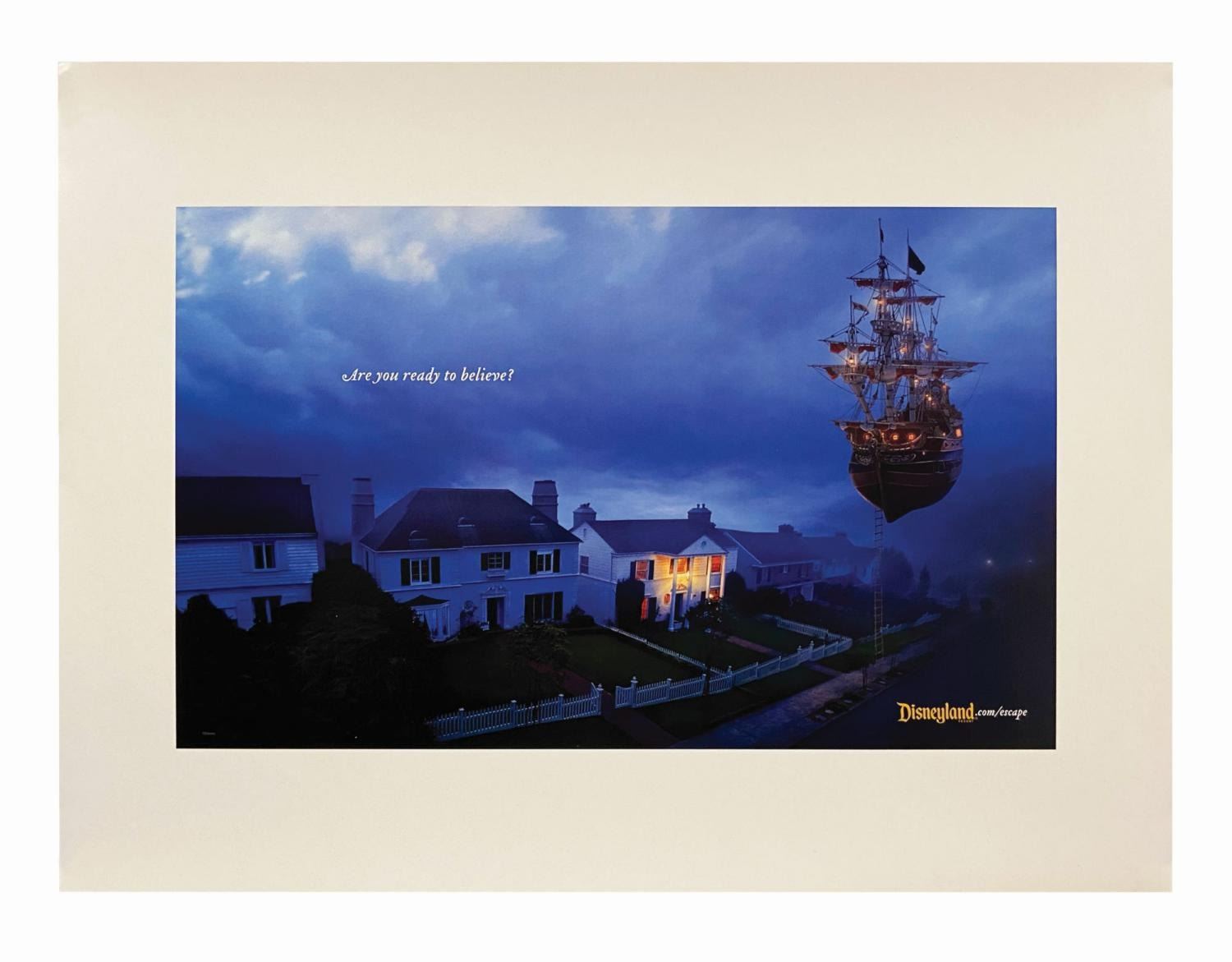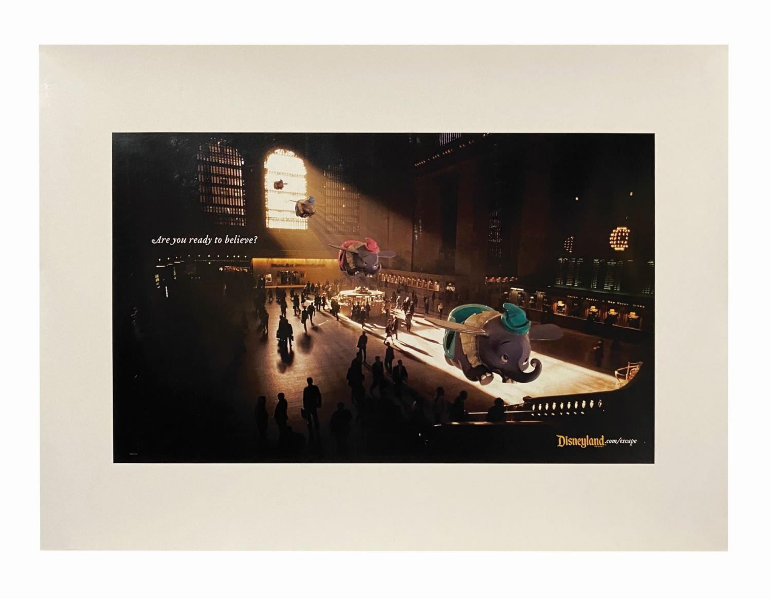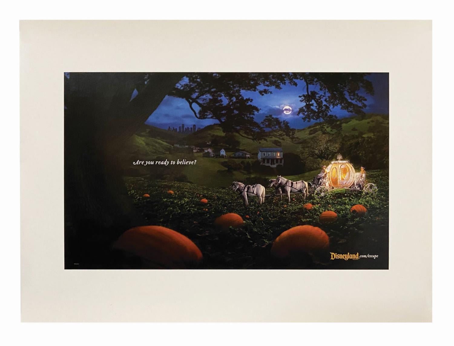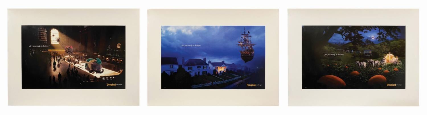 (Disneyland, c.2010s) A set of (3) print ad proofs for Disneyland's imaginative "Are you ready to believe?" campaign. The inkjet prints include Captain Hook's Jolly Roger on a suburban street, Dumbo ride vehicles in Grand Central Terminal, and Cinderella's carriage in a rural backyard pumpkin patch. Measuring 17"x23", the proofs are in very good condition with minimal wear.