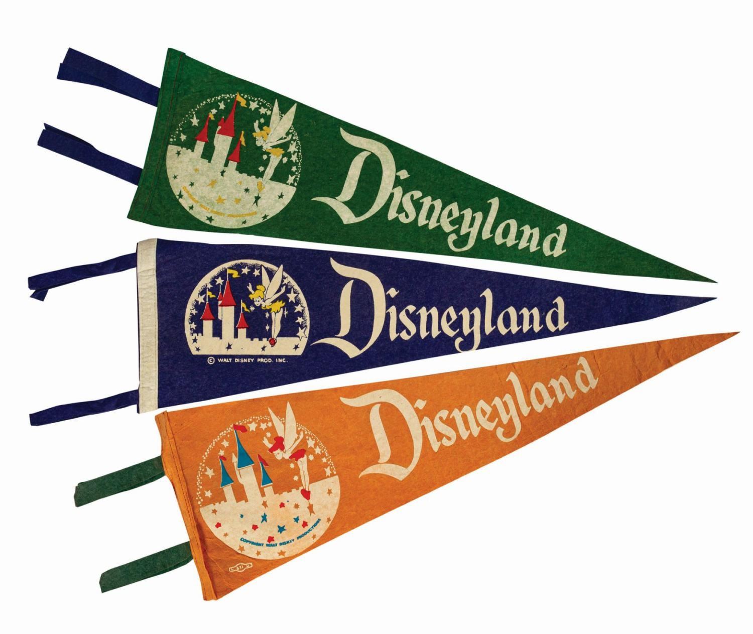 (Disneyland, c.1955) A set of (3) early Disneyland souvenir pennants. The set includes an orange, a green, and a blue felt pennant. All feature screened graphics of the classic Disneyland text logo and Tinker Bell flying over Sleeping Beauty Castle. The orange and green pennants measure 8.5"x27" and the blue version is 8"x26". Free from pinholes, all are in good condition with some minor color softening from age, wrinkling, and creasing.