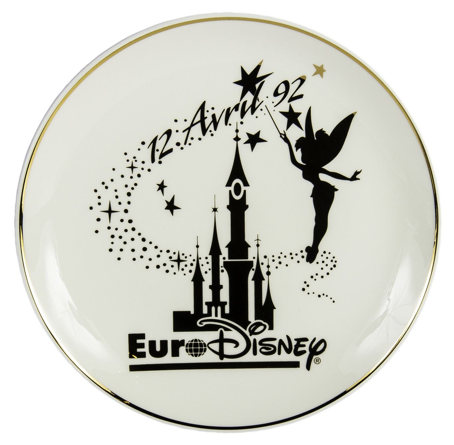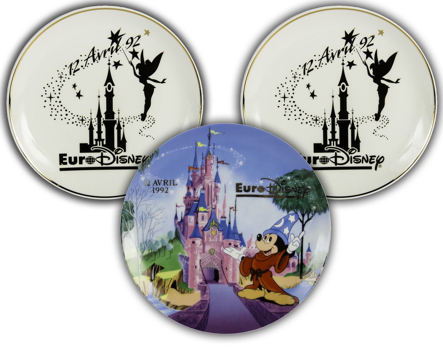 (Euro Disney, 1992) A set of (3) commemorative plates celebrating the Grand Opening of Euro Disney on April 12, 1992. This set includes (2) matching plates with gold-tone Tinker Bell and Castle imagery, and (1) colorful plate with Mickey and Castle imagery. The Mickey plate is hand numbered 4726/5000 on the base, and all three plates come with their original boxes. The plates measure 8.5" and 9.5" in diameter, respectively. The set is in very good condition with little wear.
