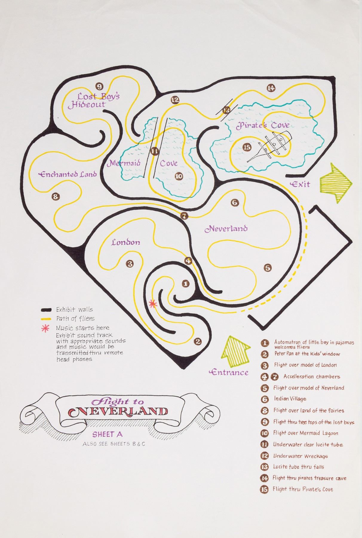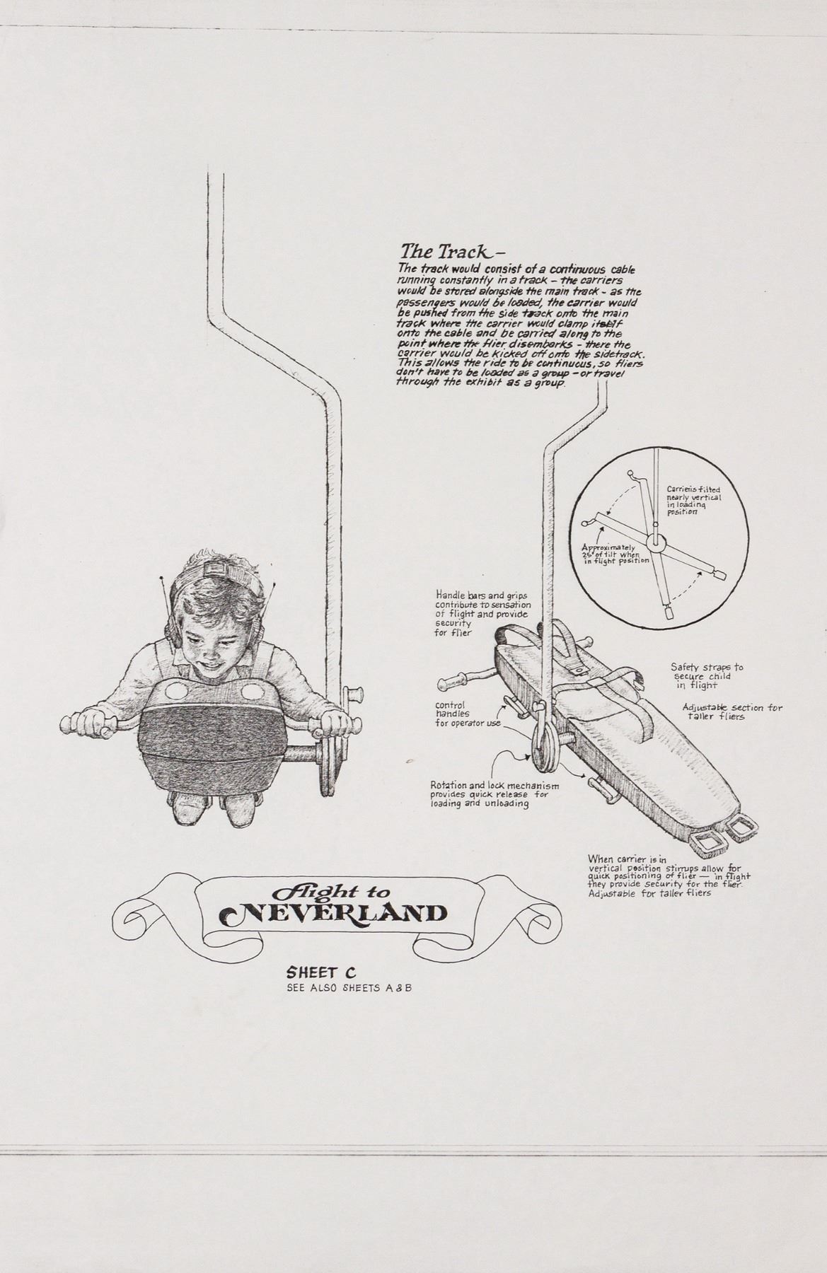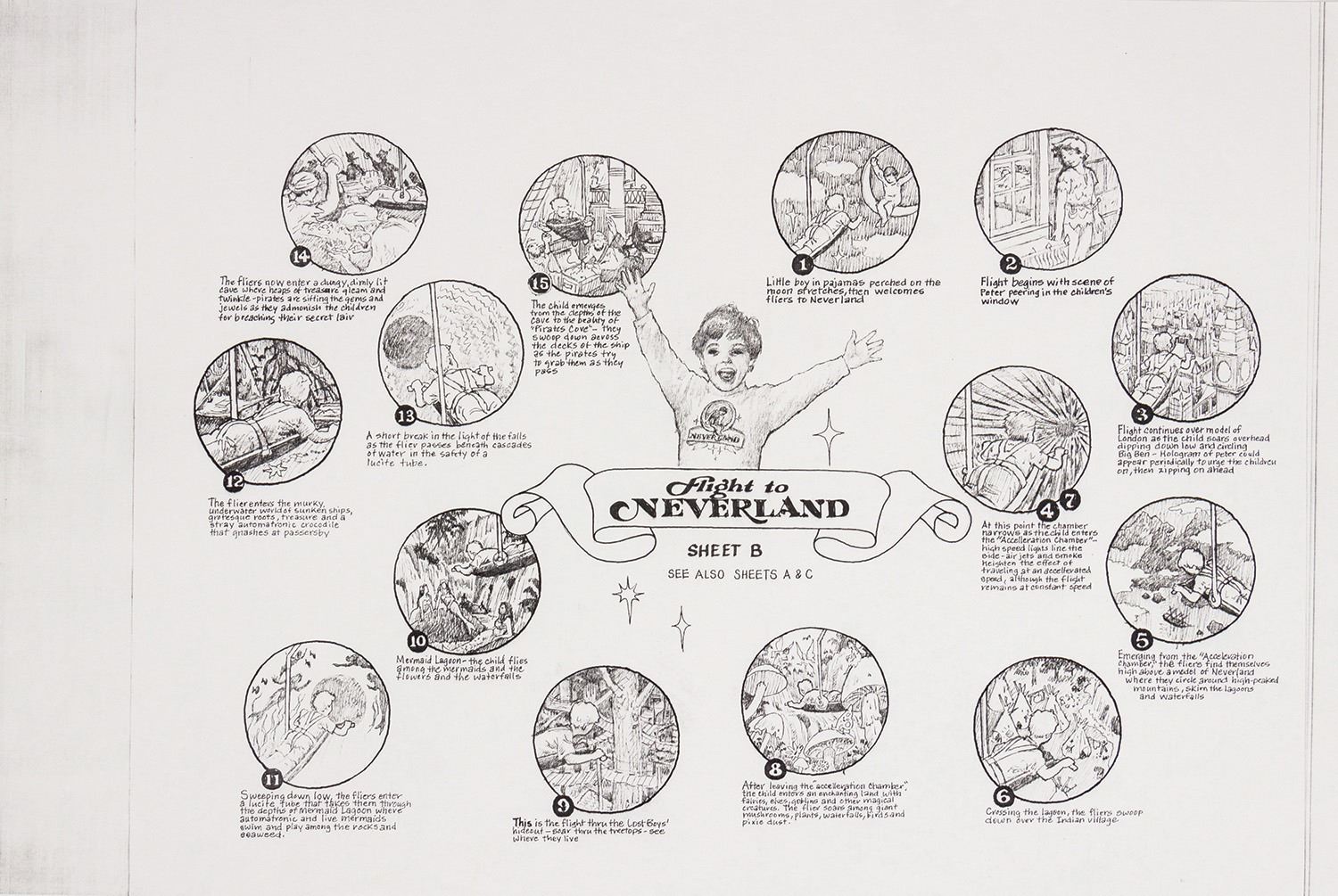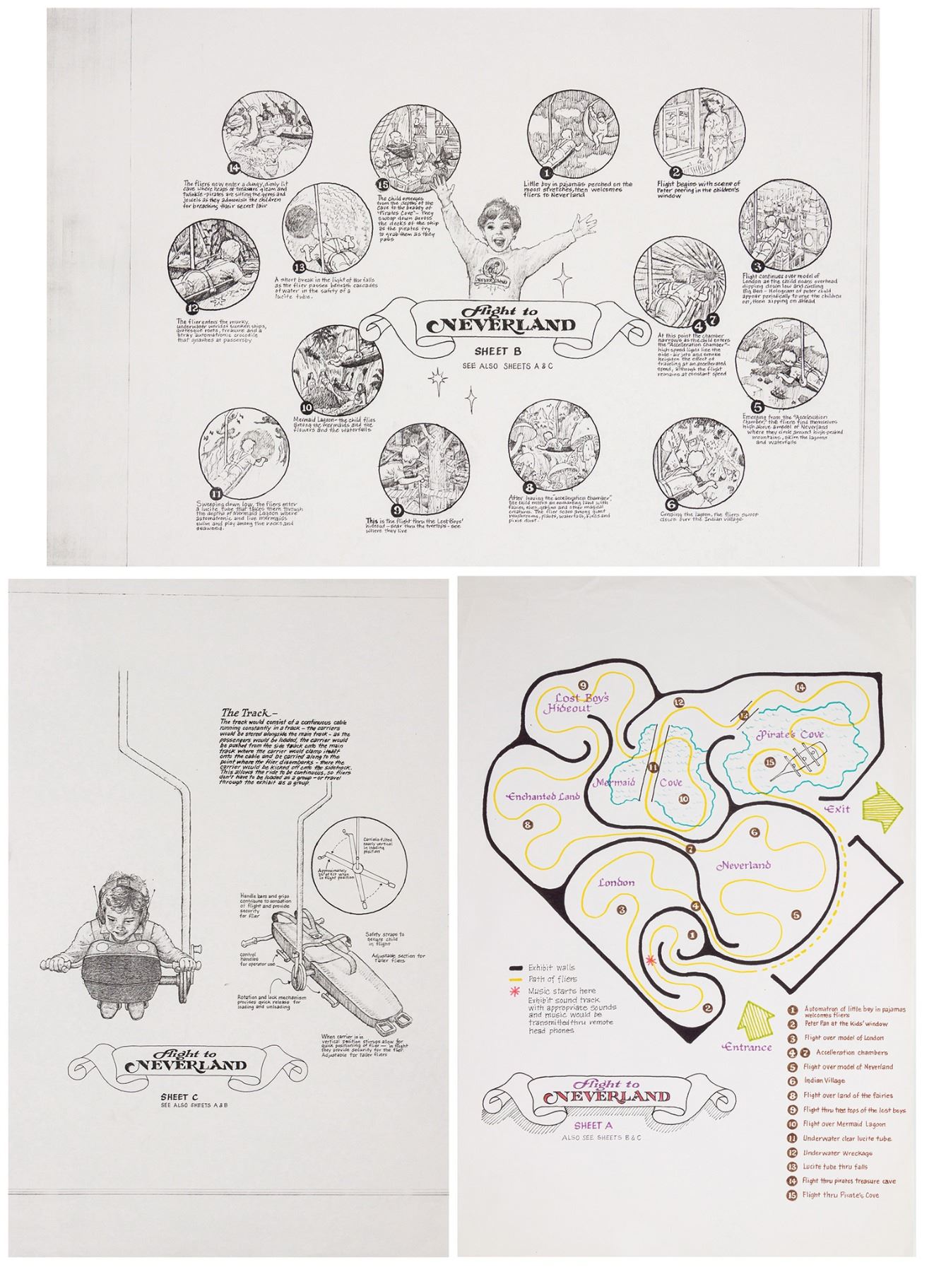 (Landmark Entertainment, c.1990s) A collection of (3) concepts for a proposed Flight to Neverland attraction for Michael Jackson's "Peter Pan's Neverland" Park. In the late 1990s, Jackson had Landmark Entertainment design him a Peter Pan themed park, similar to Disneyland, although the project was ultimately canceled. The collection includes a pair of xerox sheets with ride details and an original layout map of the attraction accomplished in marker. While such attractions were never ultimately installed within Jackson's park, this masterplan provides an incredible look into what could have been for Neverland Ranch. The xeroxes measure 30"x18.75" and the map measures 35.75"x24". All are in very good condition with expected edge-wear, including some creasing.
