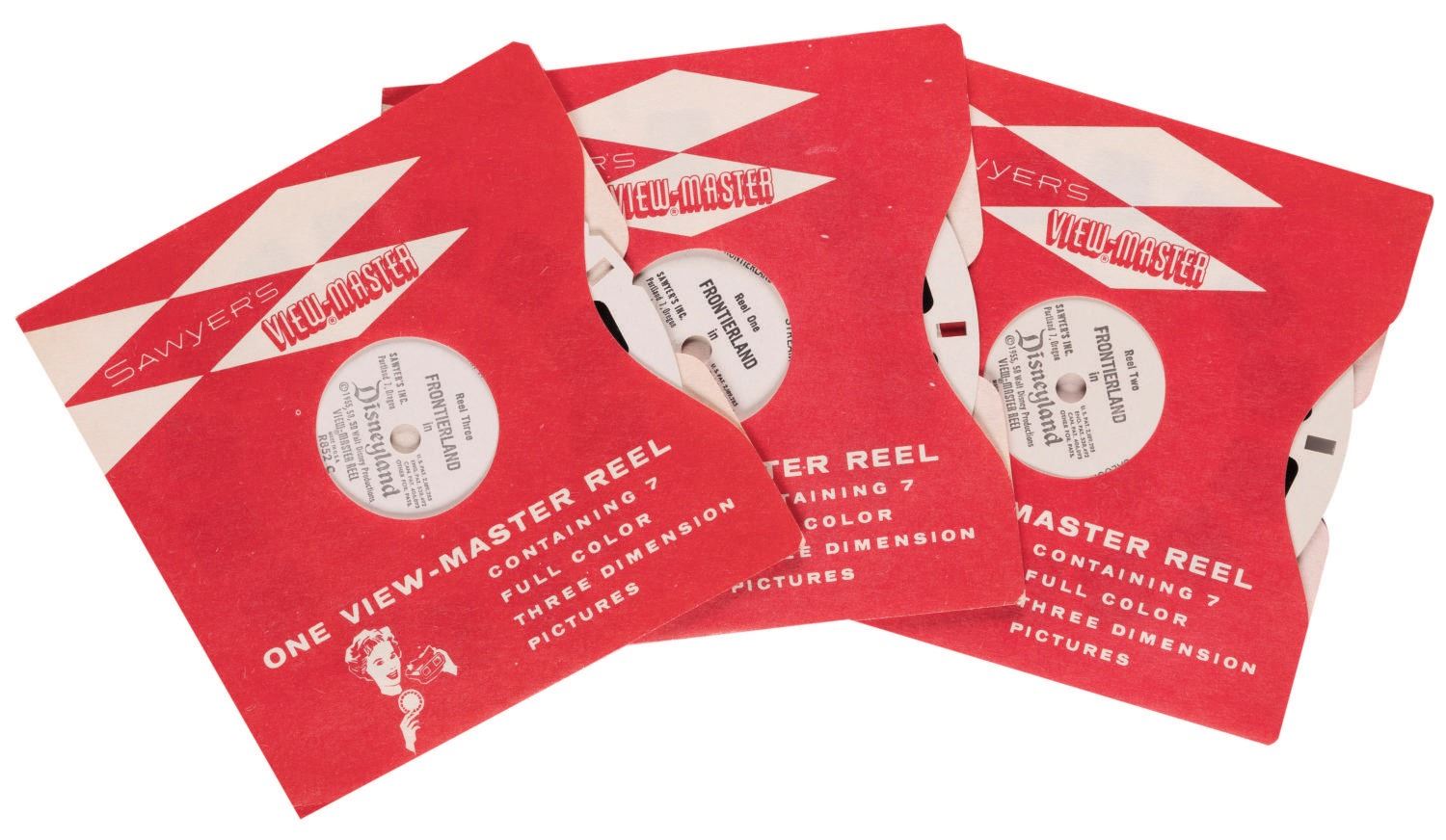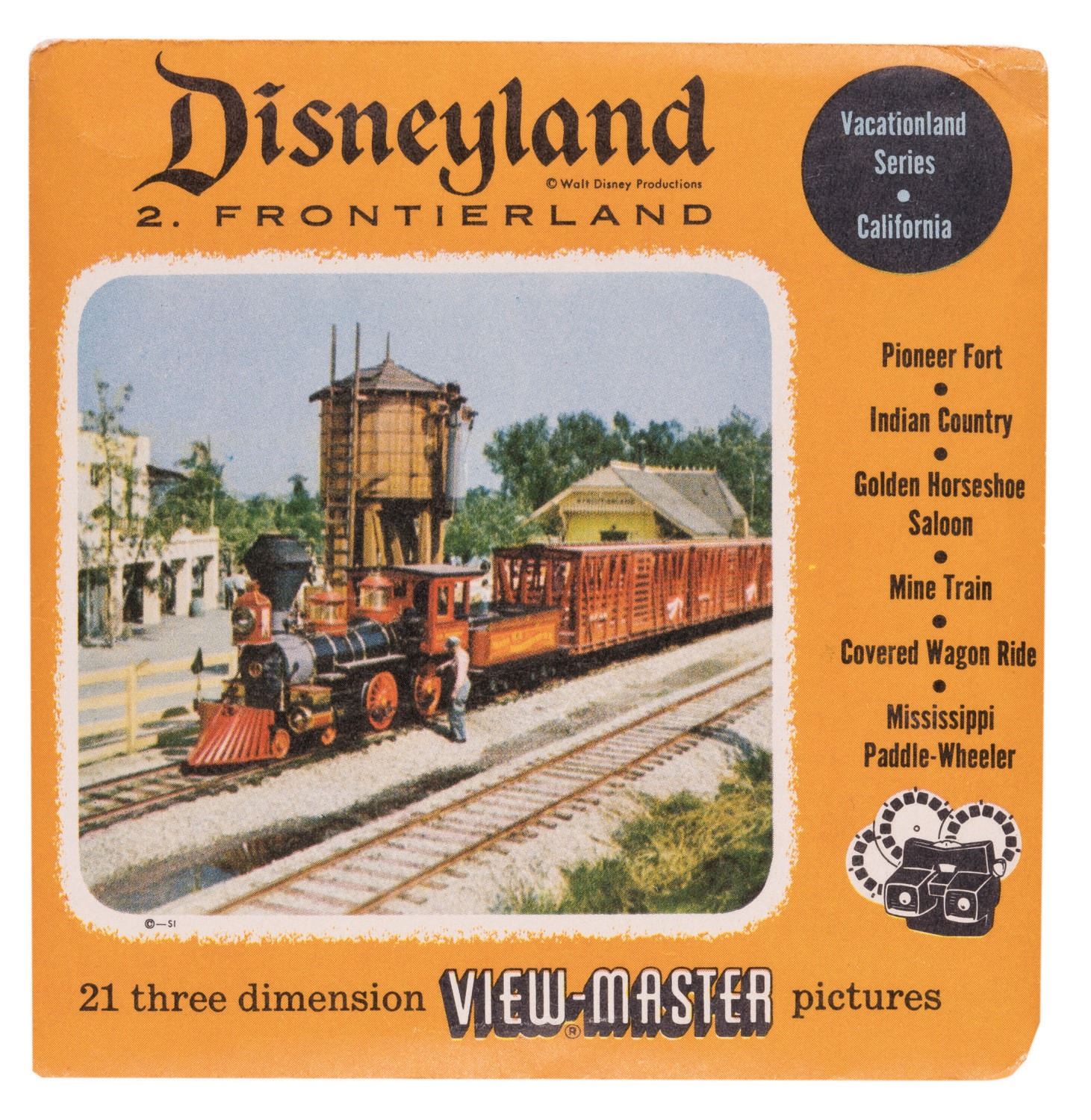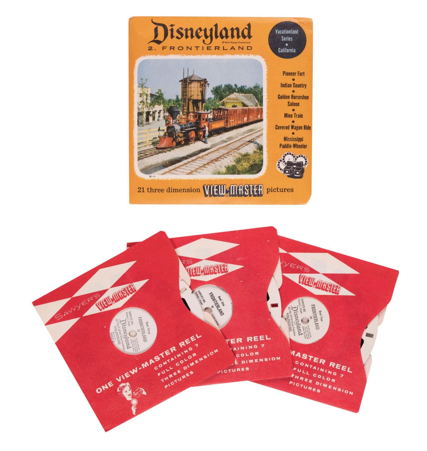 (Sawyer's Inc., 1959) A full set of (3) View-Master reels of Disneyland's Frontierland. Measuring 4.5"x4.5" overall, the reels and catalog are in fine unused condition, with light wear from handling only to the outer envelope.