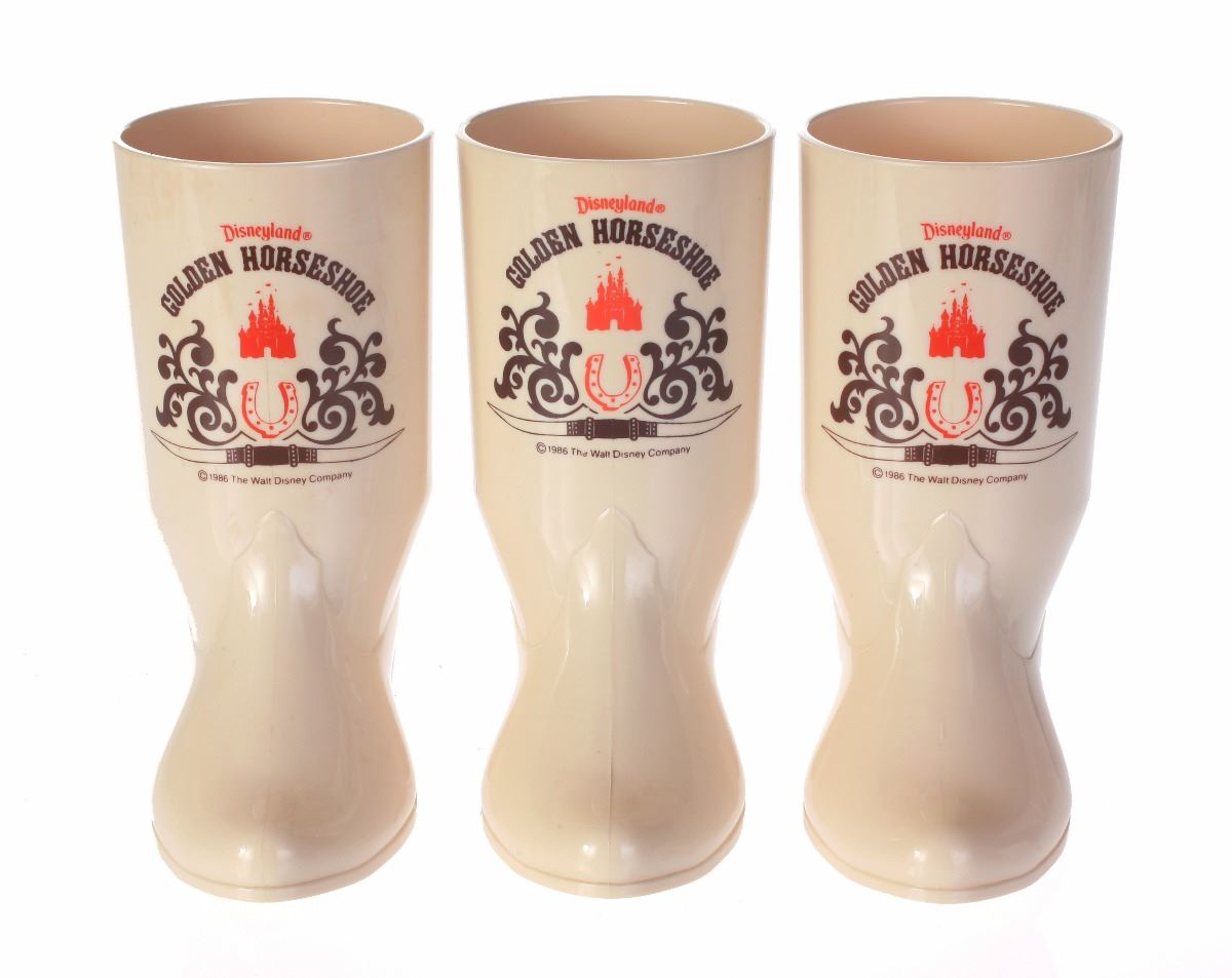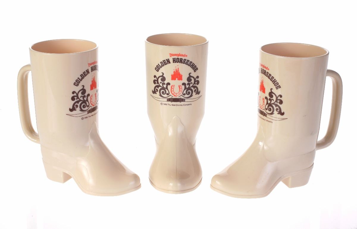 (Disneyland, 1986) Collection of (3) souvenir plastic boot-shaped mugs from the "Golden Horseshoe". Each mug measures 6"x3" and 6" tall. Set is in good condition with minor scuffing.