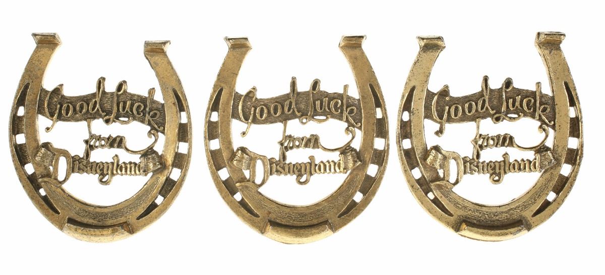 (Disneyland, 1950s) Collection of (3) metal horseshoe souvenirs that read "Good Luck from Disneyland". Measure 3.5"x3" each. Set is in good condition.