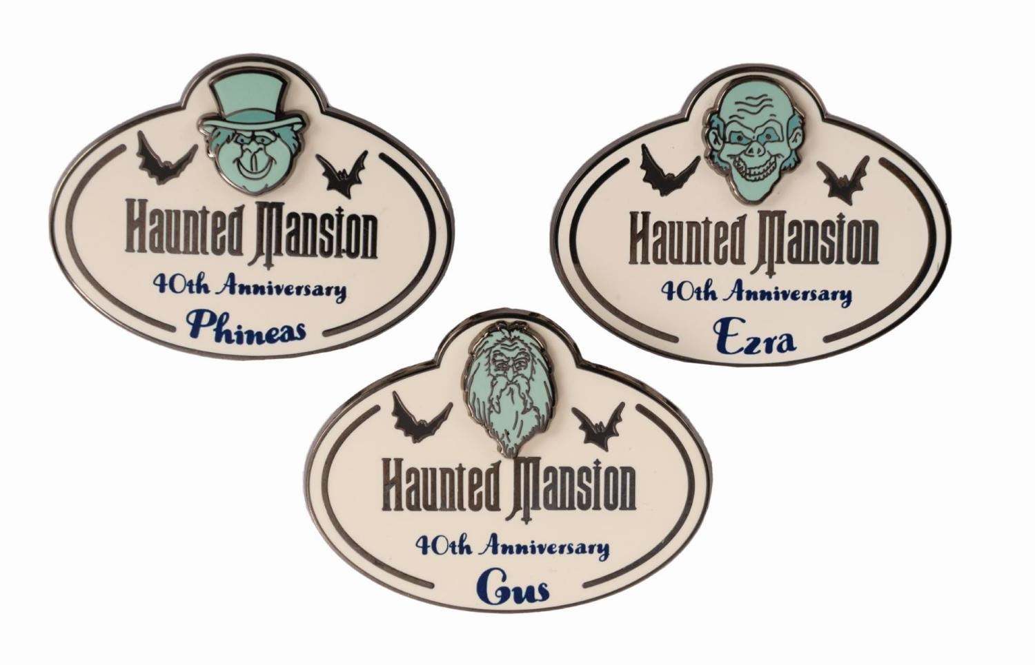 (Disneyland, 2009) A rare set of (3) cast member exclusive pins depicting the Hitchhiking Ghosts of the Haunted Mansion. The pins were released in an edition of 500, and proudly display the depictions and names of Ezra, Gus, and Phineas in the style of the park's cast member name badges. Each measures just over 1.25"x1.75" and the set is in very fine condition.