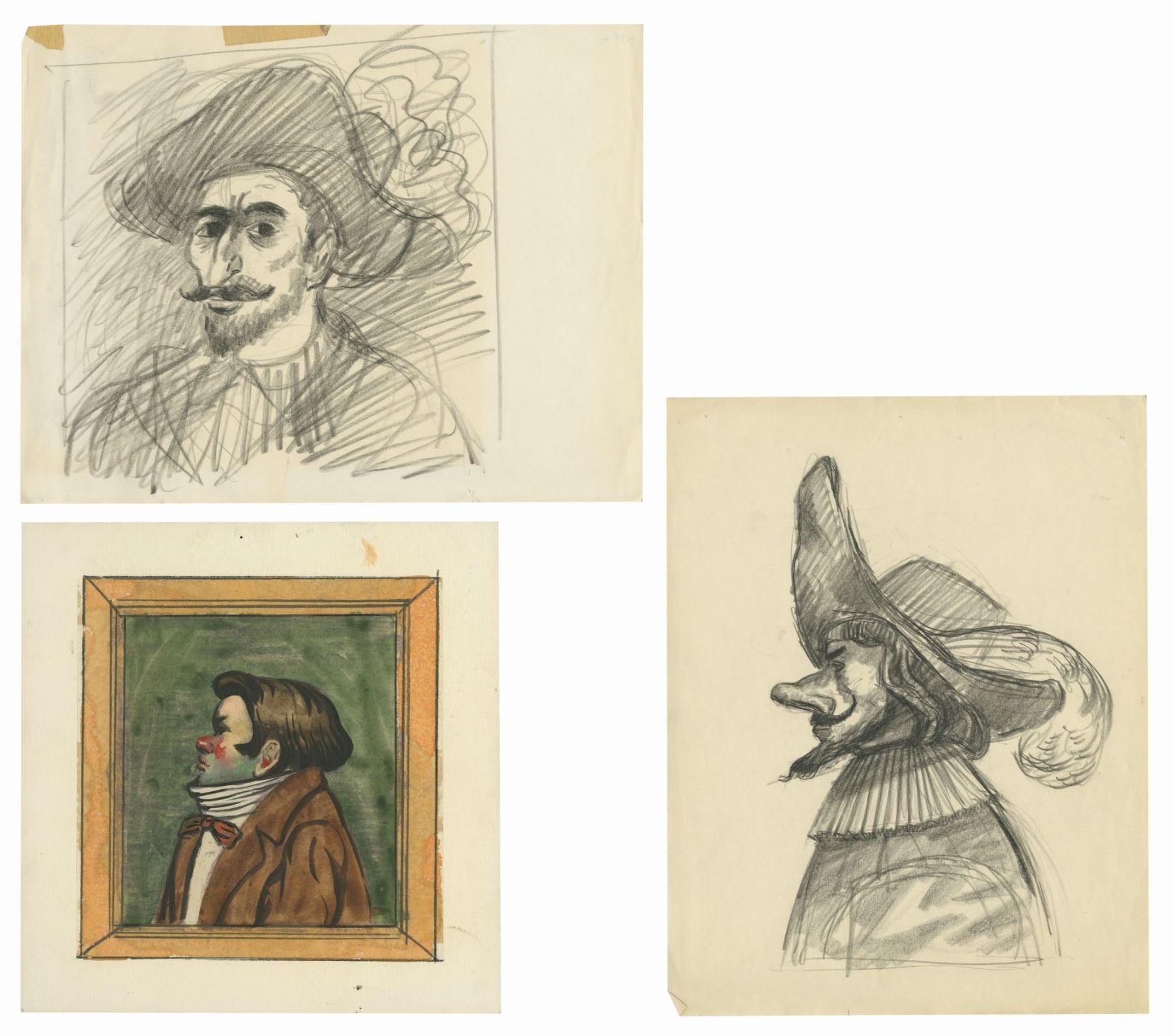 (Disneyland, c.1960s) A set of original concepts by Imagineer Ed Kohn for a series of changing portraits to be used within Disneyland's Haunted Mansion. The set includes an original painting in acrylic and marker on art board, and two pencil drawings on art paper. The two drawings appear to be early renderings for Guy Fawkes, who was originally planned to be included as a talking portrait rather than a changing portrait. These concepts range in size from the smallest 8.75"x8.5" painting to the largest 11"x8.75" drawing. The set is in overall very good condition with minor surface wear from use, and one drawing has tape residue on the top edge.