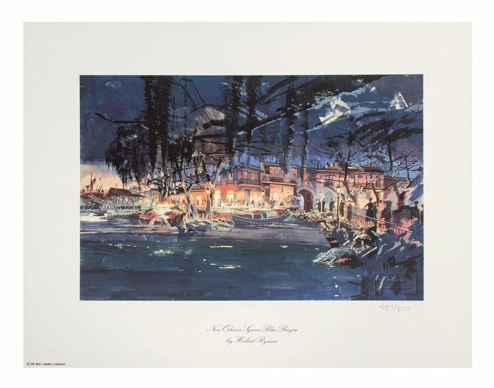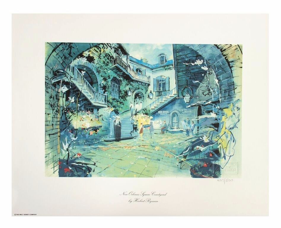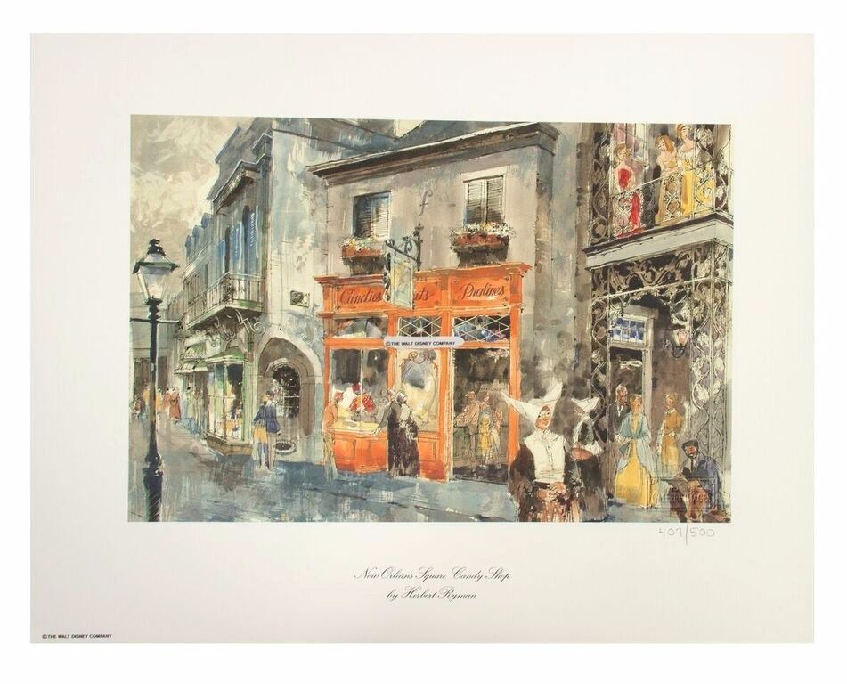 (Disneyland, 1994) A set of (3) lithographs featuring Herb Ryman's concept art for areas of New Orleans Square. These lithographs include artwork for the Candy Shop, Courtyard, and Blue Bayou, and are all hand-numbered 407/500. These lithographs are embossed with the Disney Gallery logo and come with their Disney Gallery certificates of authenticity and original black portfolio containing a large biography card on Ryman. Each lithograph measures 13"x16.5" and the set is in overall very good condition with minor wear to the portfolio.