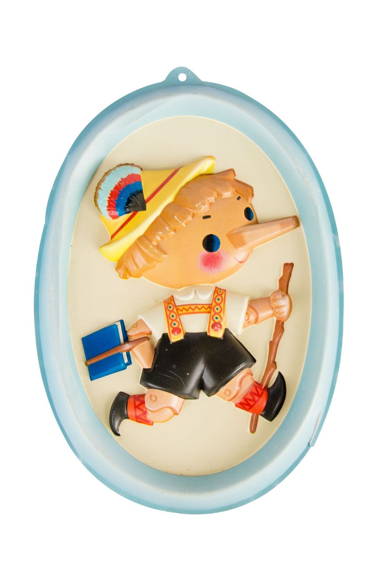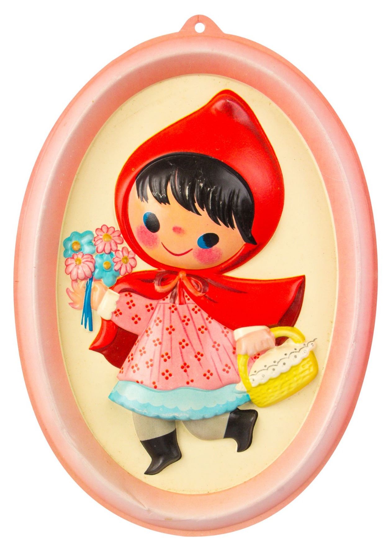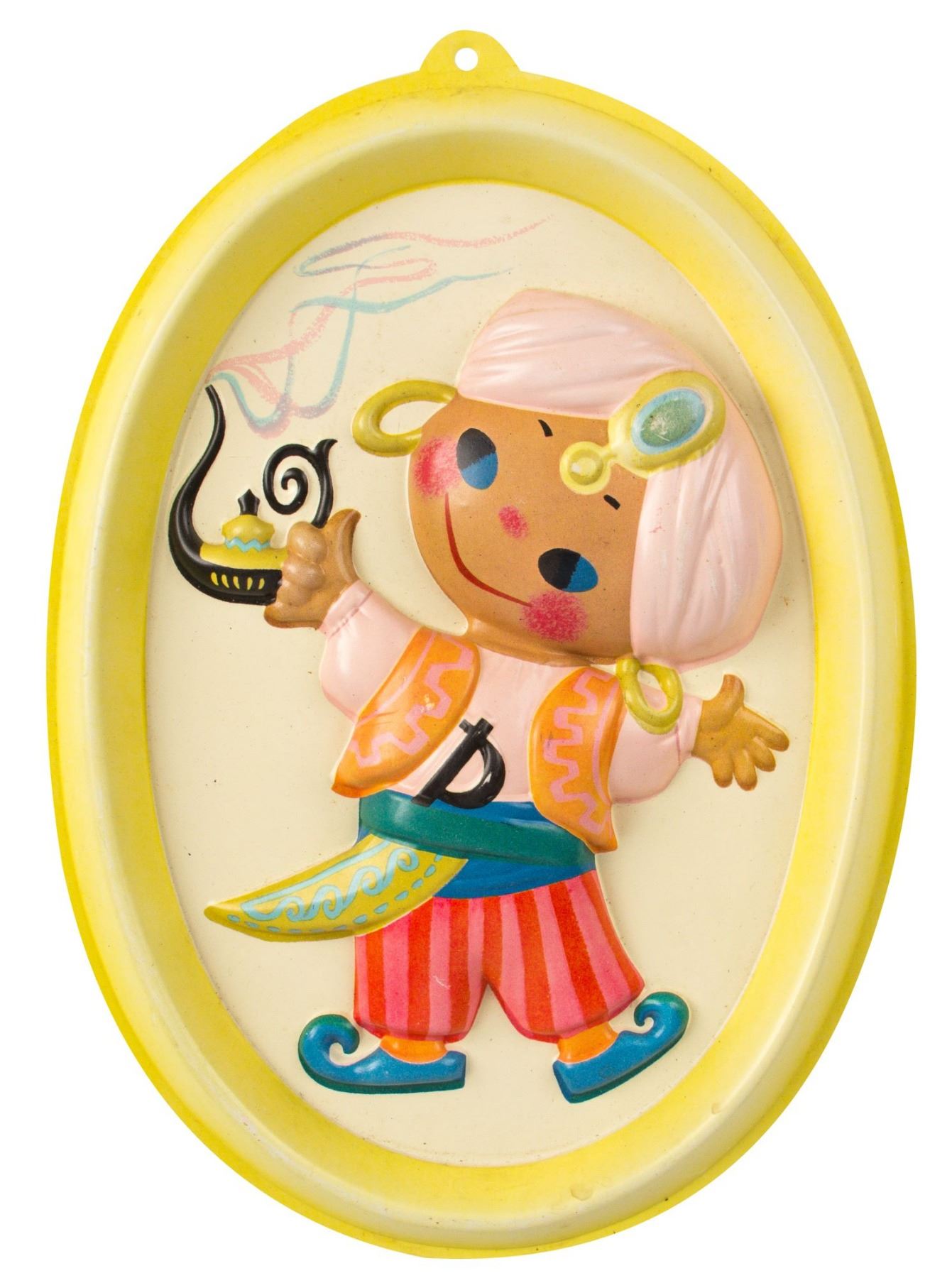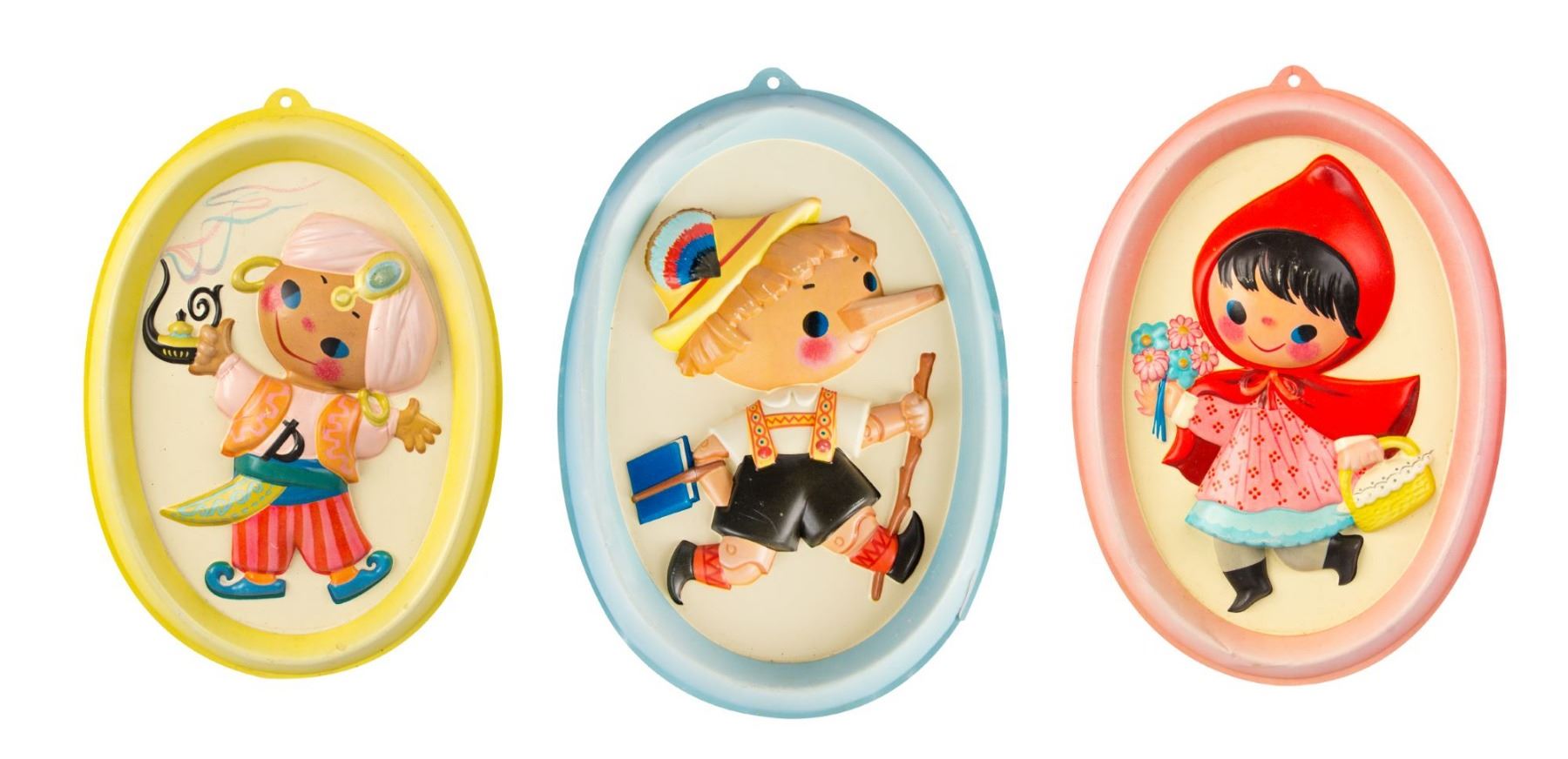 (Disney, c.1970s) A set of three wall decorations styled after Mary Blair's "It's a Small World" designs. These wall decorations feature molded printed artwork so that the designs have a 3-d effect. Each light-weight decoration measures 11"x8" and the set is in good condition with some edge-wear including a thin crack to the bottom of the blue frame.