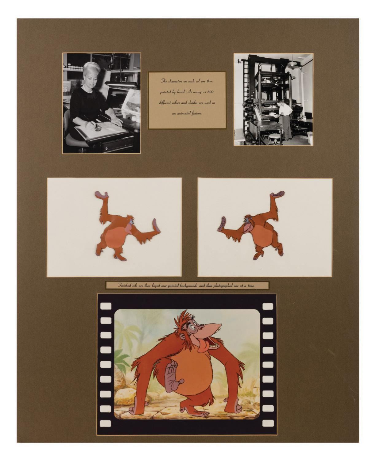 (Disney, 1967) An amazing Studio set of (3) public presentation boards. The work was created by the Walt Disney Studios to showcase how their animated films were made, and was likely used at a theatre premiere or at Disneyland. Each panel is created from large 32"x40" crescent board. The boards use King Louie to showcase how the animation process begins and ends. Board one features a hand-painted "Steps in Making of a Walt Disney Production Animated Feature." The first board also has vintage images of Milt Kahl animating and Woolie Reitherman in a meeting with Ollie Johnston, Milt Kahl, and Frank Thomas. A print of actual animation drawings of King Louie are shown with two unpainted cels of King Louie. The second board is about story development and shows a picture of Ken Anderson, with prints of original storyboards, model sheets, and two hand-painted story pieces in the setup. The third board has photos of the famous multiplane camera, and a woman from Ink and Paint working on a cel. Two actual King Louie hand-painted cels are in this setup. One is reversed to show the paint on the back of the cel, the other shows what the finished product looks like. Each cel image is about 7" tall. A Jungle Book lobby card of King Louie is also in the setup. This is a very unique Studio display piece that presents in very good condition with minor handling and edge wear from use.