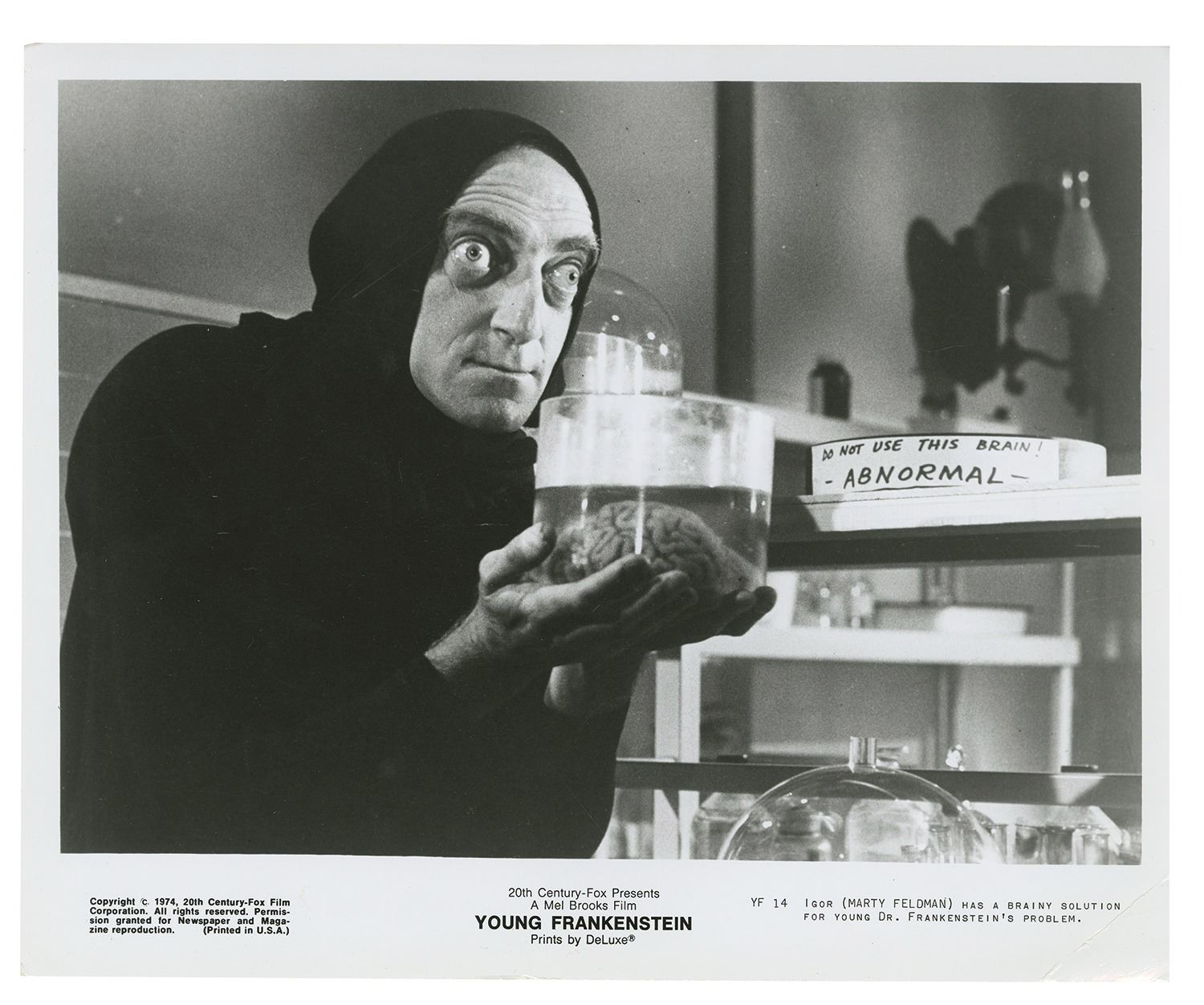 (20th Century Fox, c.1970s) A set of (3) wonderful publicity photos of Marty Feldman. These photos feature Feldman in his iconic role of Igor in Young Frankenstein, as well as an additional color photo and black and white photo. The photos measure approximately 8"x10" and are in good overall condition with some surface and edge wear from use.
