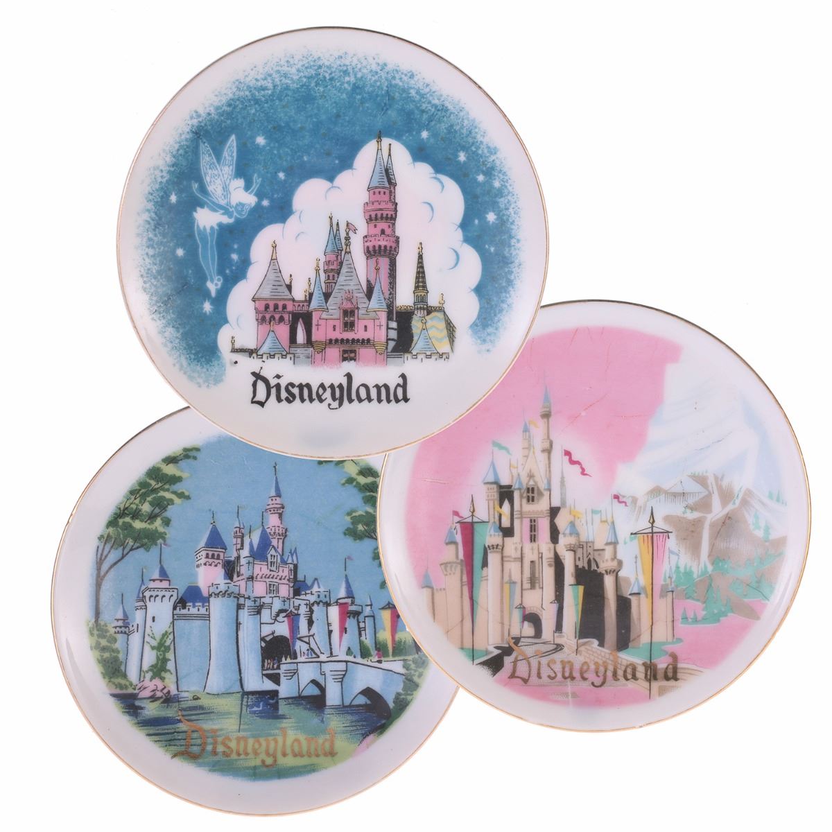 (Disneyland, 1950s) Beautiful set of (3) miniature hanging wall plates from Main Street. Features three stylistic renditions of Sleeping Beauty Castle in green, blue, and pink. Each plate measures 4" in diameter, and 0.75" tall. Set is in good condition.