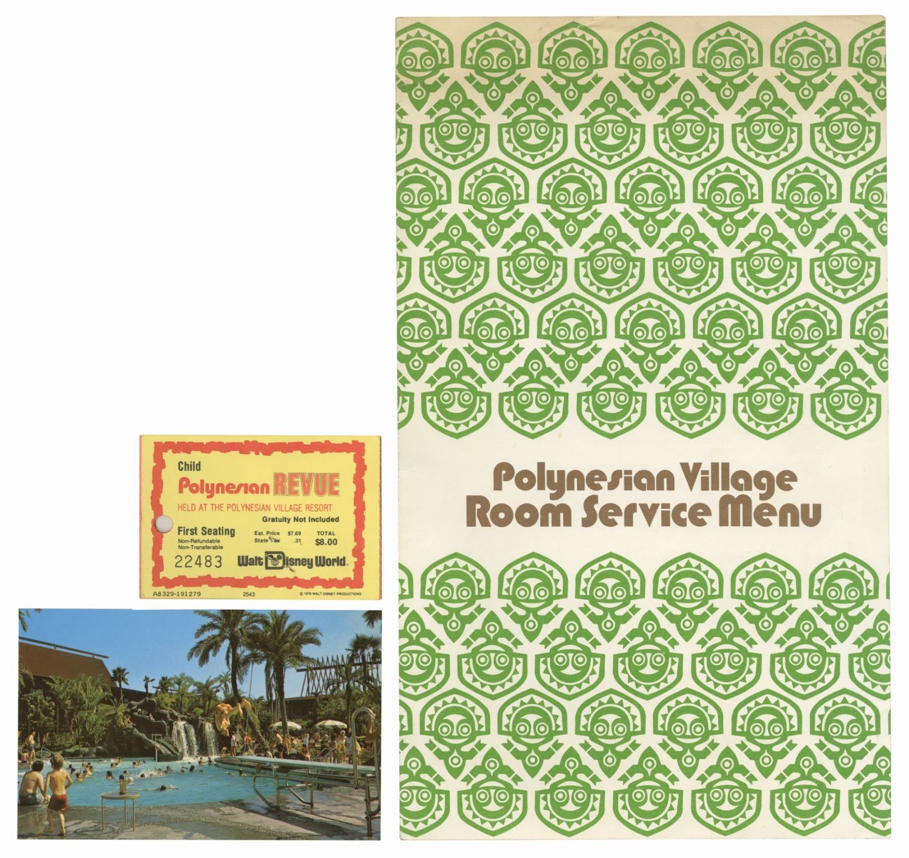 (Polynesian Village, 1979-80) A set of (3) paper souvenirs from the Polynesian Village Resort Hotel. This charming collection includes: one Room Service Menu, one unused souvenir postcard, and a group of (4) Polynesian Revue tickets. The tickets are hole punched and stapled together with the date of use stamped on the reverse. These items measure between 2.5"x3.75" and 12.5"x7.5" and are in overall good condition with some discoloration and creasing to the menu, particularly on the top half.