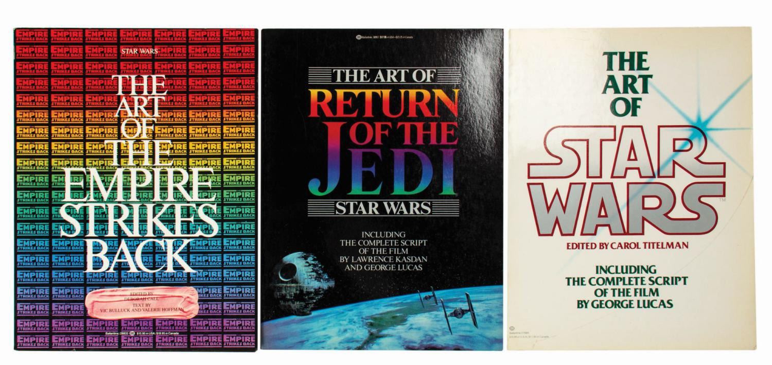 (Ballantine, 1978-83) A set of (3) paperback coffee table books including The Art of Star Wars, The Art of the Empire Strikes Back, and The Art of Return of the Jedi published by Ballantine, New York. The series chronicles the development of the seminal sci-fi franchise, tracing inspirations for characters, settings, and props from the earliest concept sketches by visionary artists like Ralph McQuarrie and Joe Johnston to the finished screen-used product. From costumes to filming miniatures, matte paintings to poster art, these vintage books provide exclusive insight into the creation of the Star Wars aesthetic. Ranging from 151 to 176 pages, each of the three books measures 12"x9" and are in good overall condition. The Empire and Jedi books exhibit some complete separation of text block from the spine. The Star Wars book is intact with minor wear.