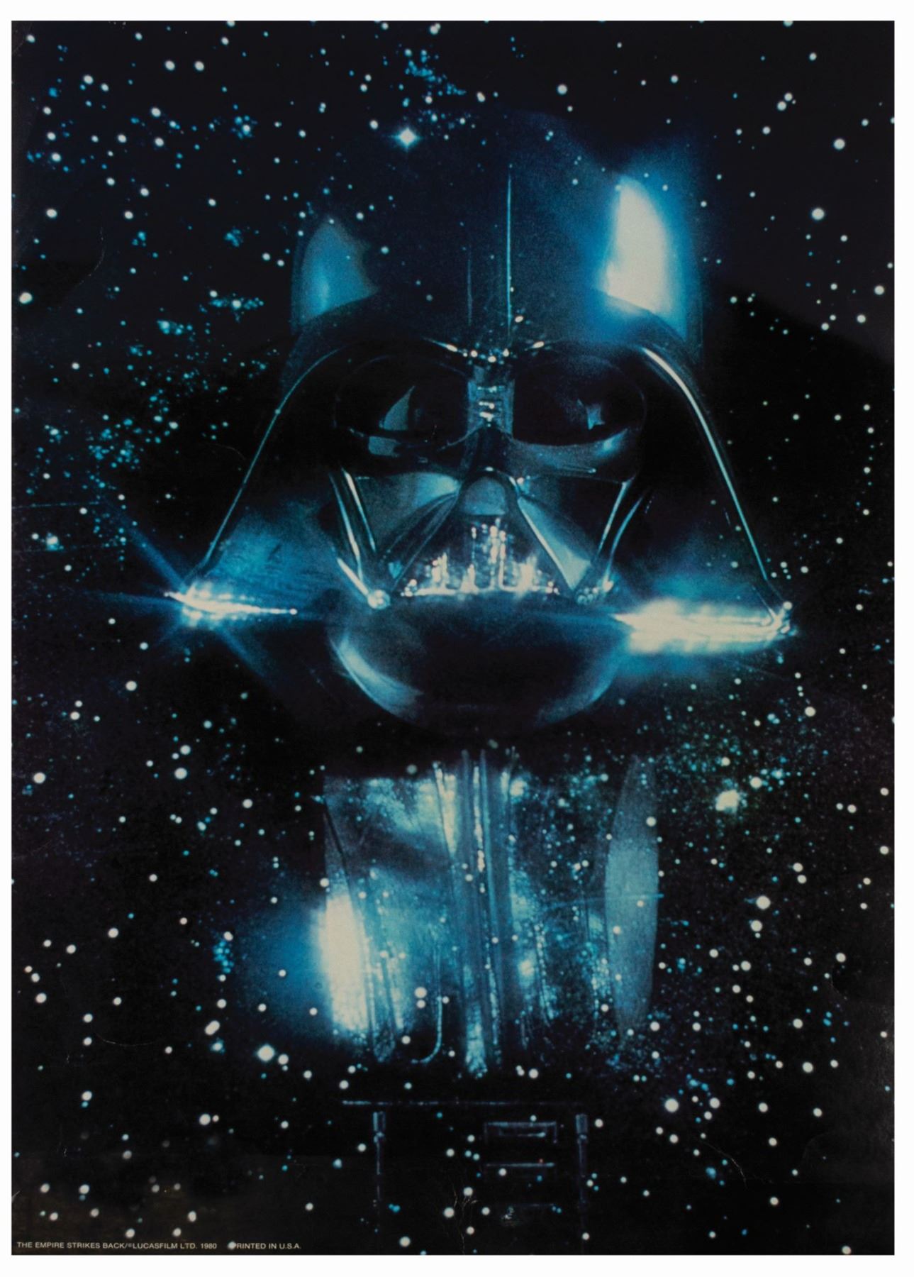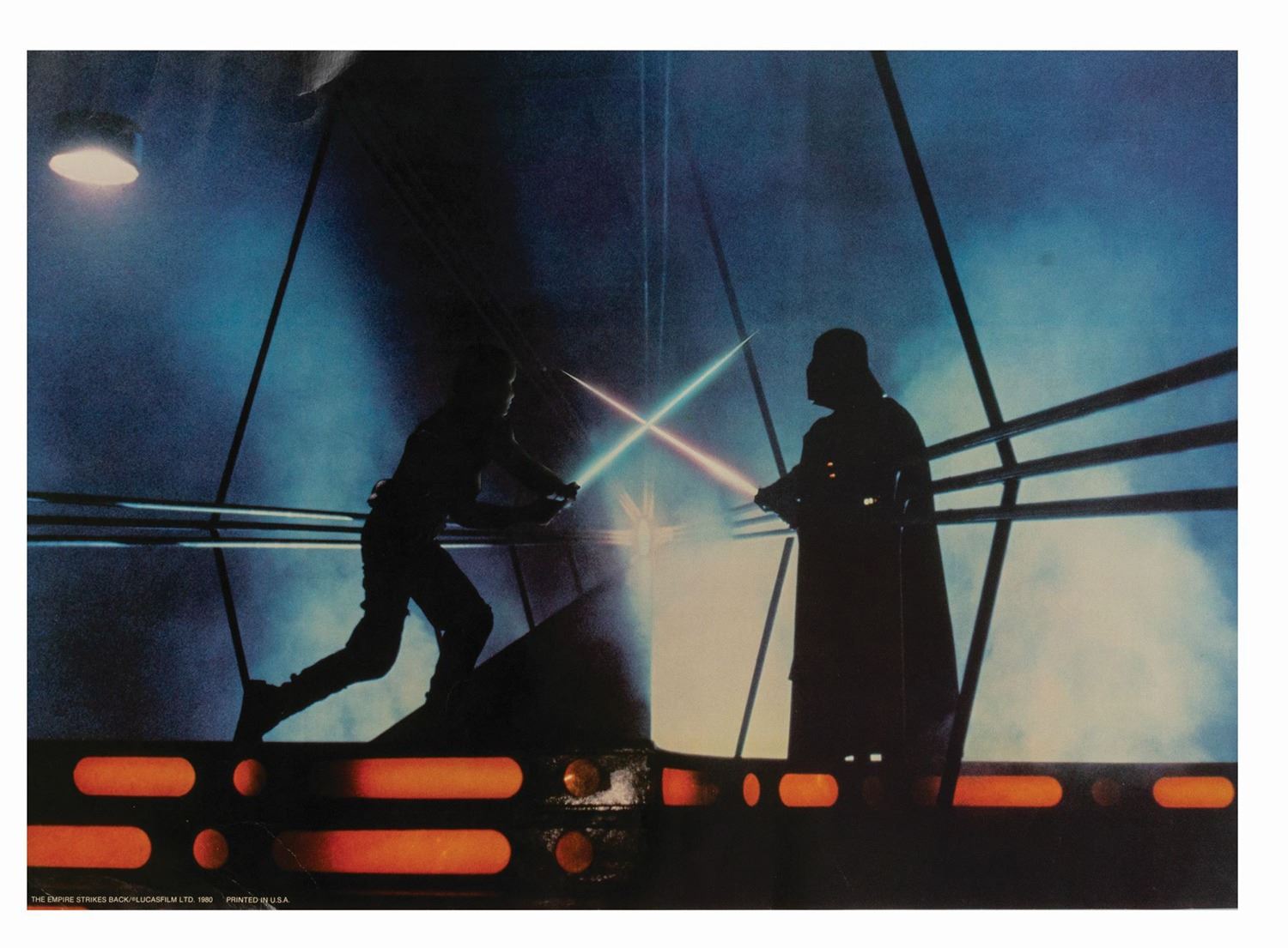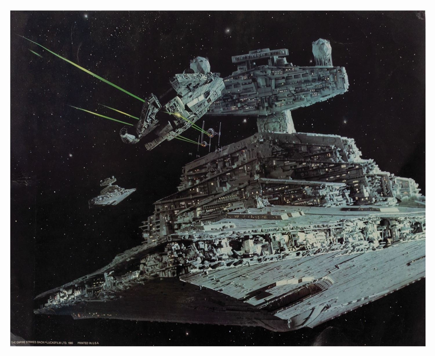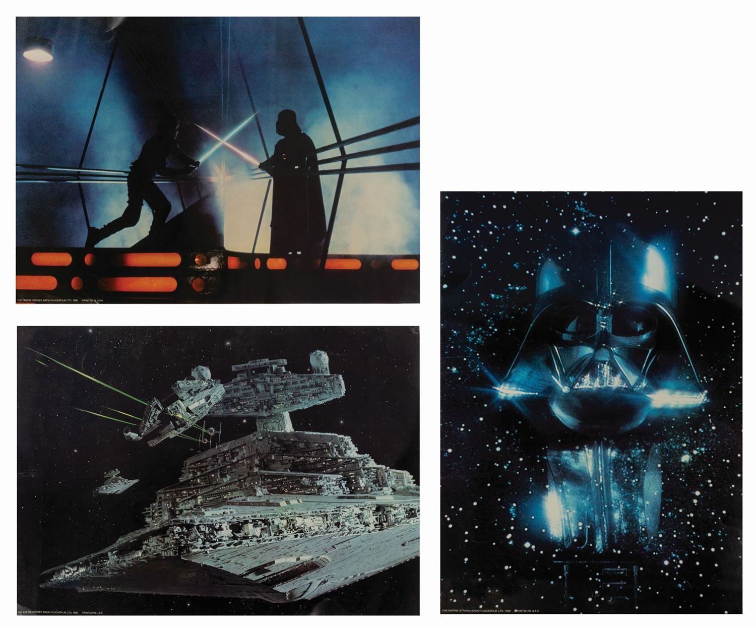 (Lucasfilm, 1980) A set of (3) very rare large-format 20"x30" lobby cards for The Empire Strikes Back. These oversized cards are significantly more rare than the standard lobby cards, and include imagery of the Star Destroyer, Darth Vader, and Luke battling Vader. The lobby cards are in fair condition overall with wear and creases throughout from use.