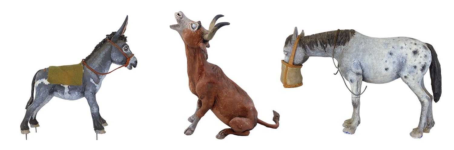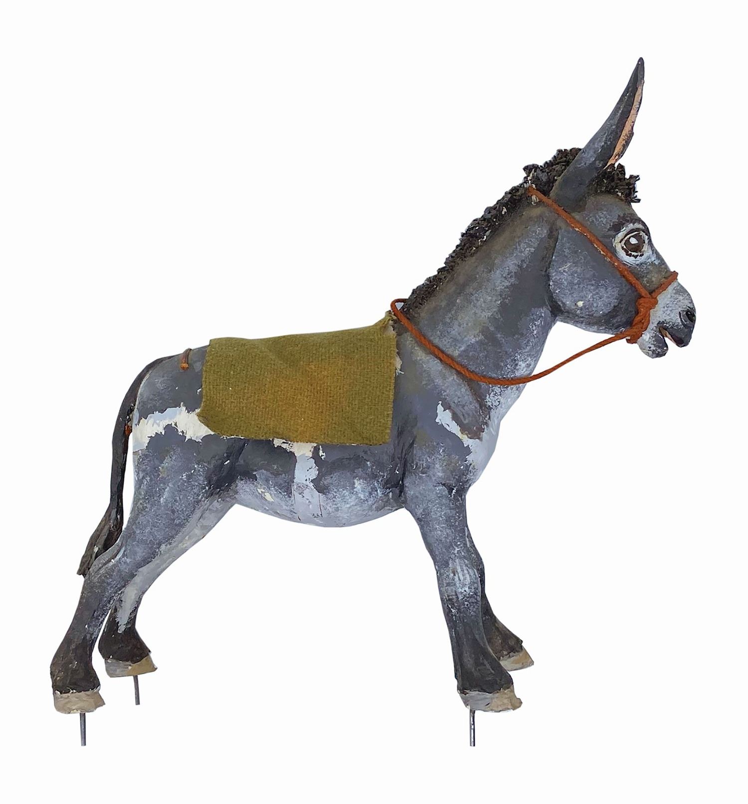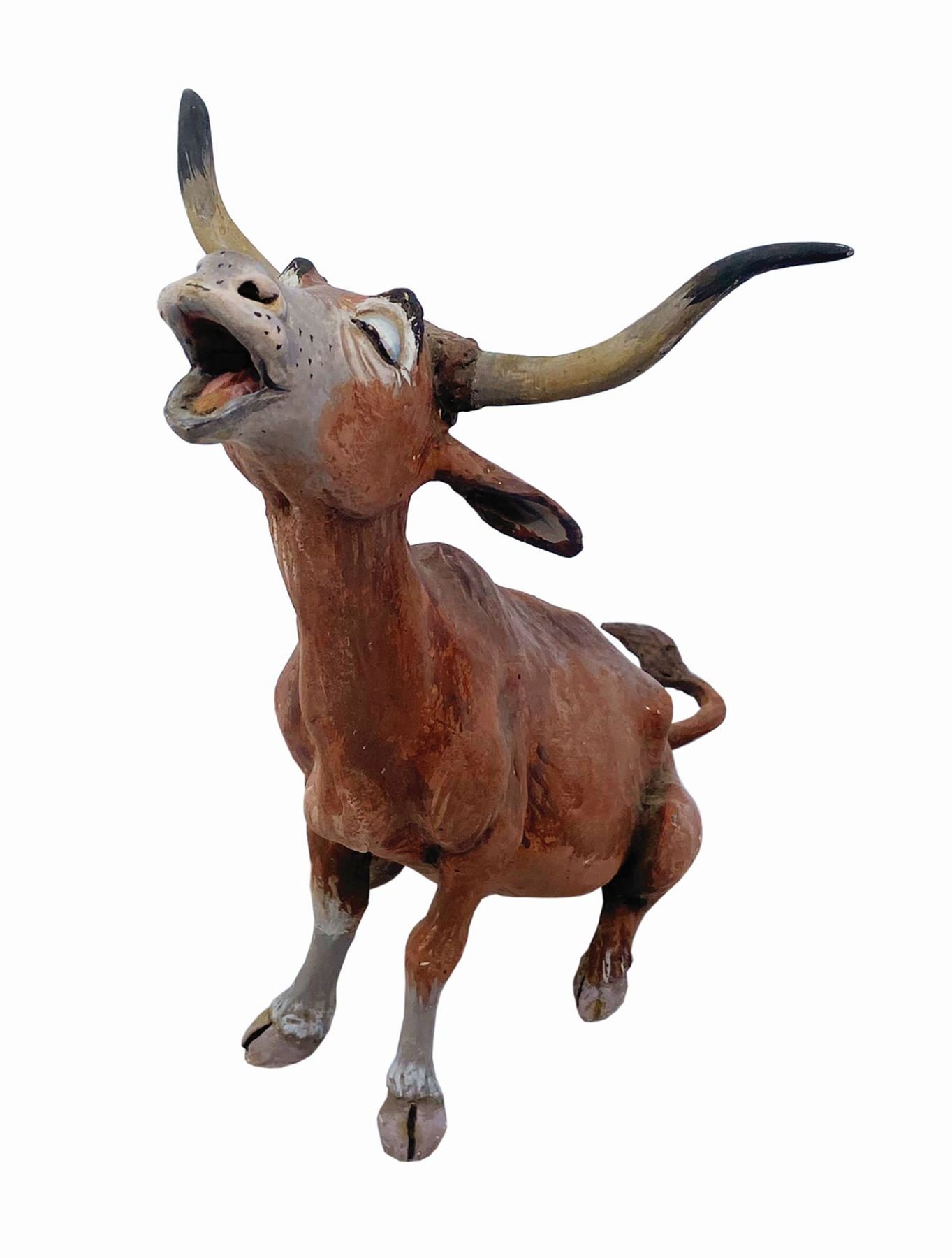 (Walt Disney World, c.1970s) A set of (3) character concept models from the unrealized Western River Expedition attraction at Walt Disney World. The donkey is from the vignette wherein bandits hold up a stagecoach, the extraordinary singing bull is from the Cowboy Serenade, and the Appaloosa horse with feed bag appears outside the stable in the burning town. Designed by legendary Imagineer Marc Davis, these original figures were created for the attraction model built by WDI. Constructed of meticulously hand-sculpted clay over cast components (or a metal armature in the case of the donkey,) the wonderfully expressive character concept models are expertly hand-painted and finished in minute detail. At 1.5”:1’ scale, the Western River Expedition model was the largest that Disney had created up to that point, with costs running into the hundreds of thousands of dollars. Called the greatest attraction that never was, the Western River Expedition was to be Marc Davis’s chance to improve upon and surpass his wildly successful Pirates of the Caribbean in both size and imagination. Given that Florida is located so close to the actual Caribbean, it was thought that Pirates of the Caribbean wouldn’t hold the same romantic pull that it did to people more geographically distant. Enter the Western River Expedition, bringing the size and grandeur of the Wild West to tourists in the East. It was to be the signature attraction within the planned Thunder Mesa complex, which was to house multiple rides including a log flume and a runaway mining train rollercoaster. While elements of the River Expedition were eventually repurposed for other attractions, these excessively rare character concept models are the best representation of Marc Davis’s original vision to survive. Ranging in size from 7.25" to 8.75” tall, the figures are in generally very good condition. Bear in mind that these are hand-made concept models used for scenic design and blocking purposes in a working model of the attraction. They may exhibit a stray drip of paint from an element being worked on around them or a chip or crack from hurried rearrangement in a surge of inspiration. The donkey is missing an ear and the bridles on both the donkey and horse have come loose. The horse has a cracked foreleg. All exhibit some wear and handling.
