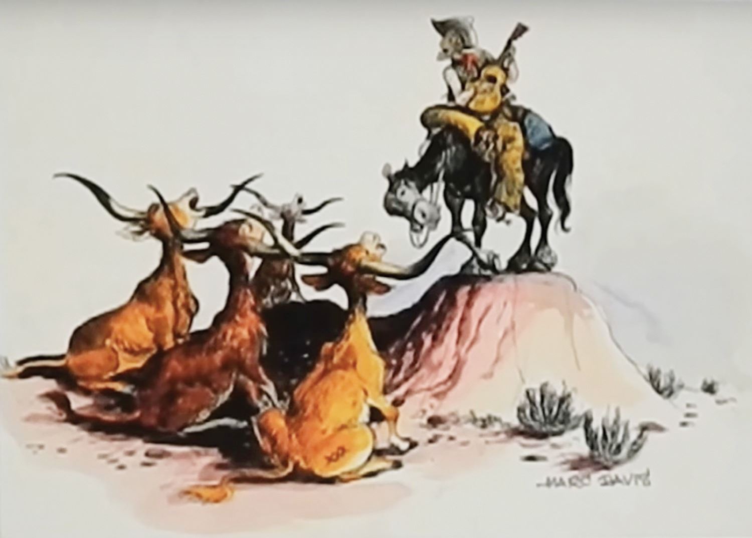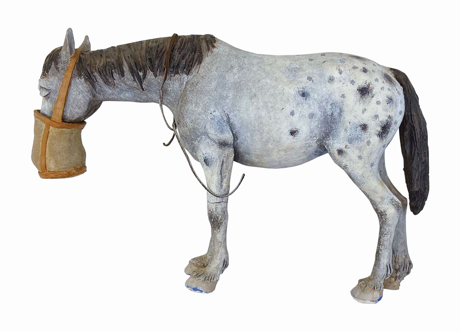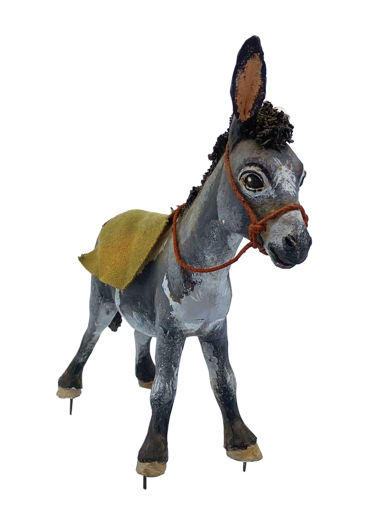 (Walt Disney World, c.1970s) A set of (3) character concept models from the unrealized Western River Expedition attraction at Walt Disney World. The donkey is from the vignette wherein bandits hold up a stagecoach, the extraordinary singing bull is from the Cowboy Serenade, and the Appaloosa horse with feed bag appears outside the stable in the burning town. Designed by legendary Imagineer Marc Davis, these original figures were created for the attraction model built by WDI. Constructed of meticulously hand-sculpted clay over cast components (or a metal armature in the case of the donkey,) the wonderfully expressive character concept models are expertly hand-painted and finished in minute detail. At 1.5”:1’ scale, the Western River Expedition model was the largest that Disney had created up to that point, with costs running into the hundreds of thousands of dollars. Called the greatest attraction that never was, the Western River Expedition was to be Marc Davis’s chance to improve upon and surpass his wildly successful Pirates of the Caribbean in both size and imagination. Given that Florida is located so close to the actual Caribbean, it was thought that Pirates of the Caribbean wouldn’t hold the same romantic pull that it did to people more geographically distant. Enter the Western River Expedition, bringing the size and grandeur of the Wild West to tourists in the East. It was to be the signature attraction within the planned Thunder Mesa complex, which was to house multiple rides including a log flume and a runaway mining train rollercoaster. While elements of the River Expedition were eventually repurposed for other attractions, these excessively rare character concept models are the best representation of Marc Davis’s original vision to survive. Ranging in size from 7.25" to 8.75” tall, the figures are in generally very good condition. Bear in mind that these are hand-made concept models used for scenic design and blocking purposes in a working model of the attraction. They may exhibit a stray drip of paint from an element being worked on around them or a chip or crack from hurried rearrangement in a surge of inspiration. The donkey is missing an ear and the bridles on both the donkey and horse have come loose. The horse has a cracked foreleg. All exhibit some wear and handling.
