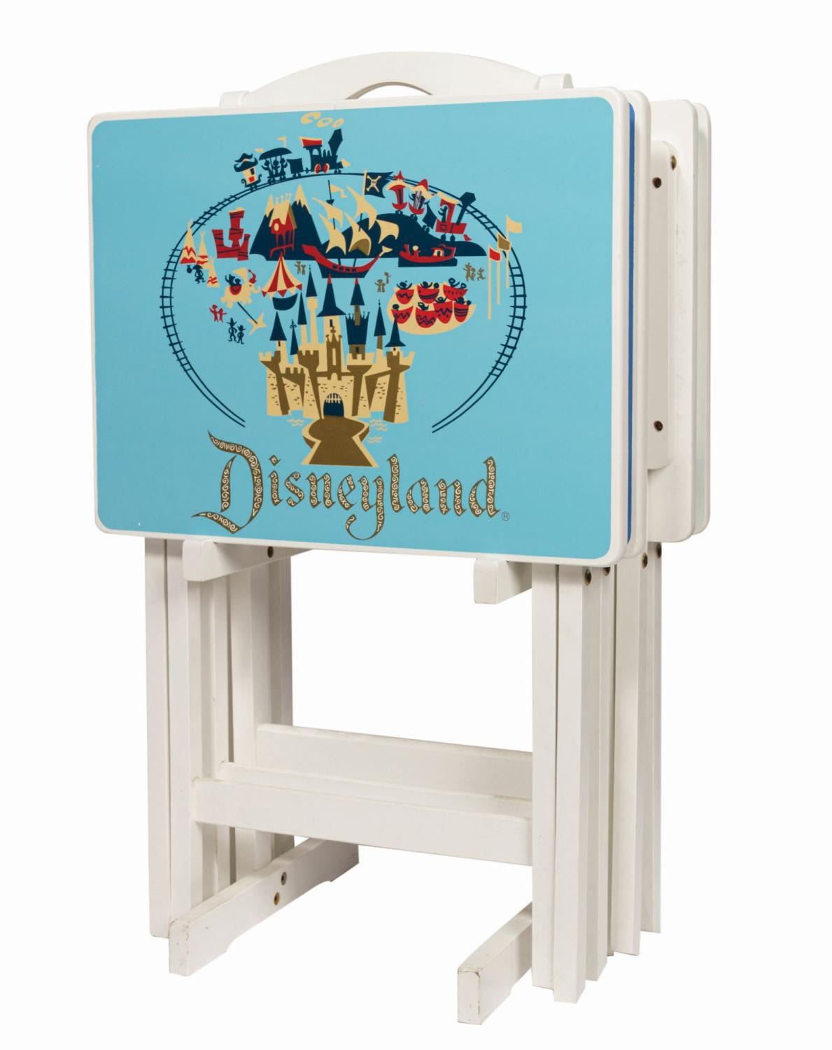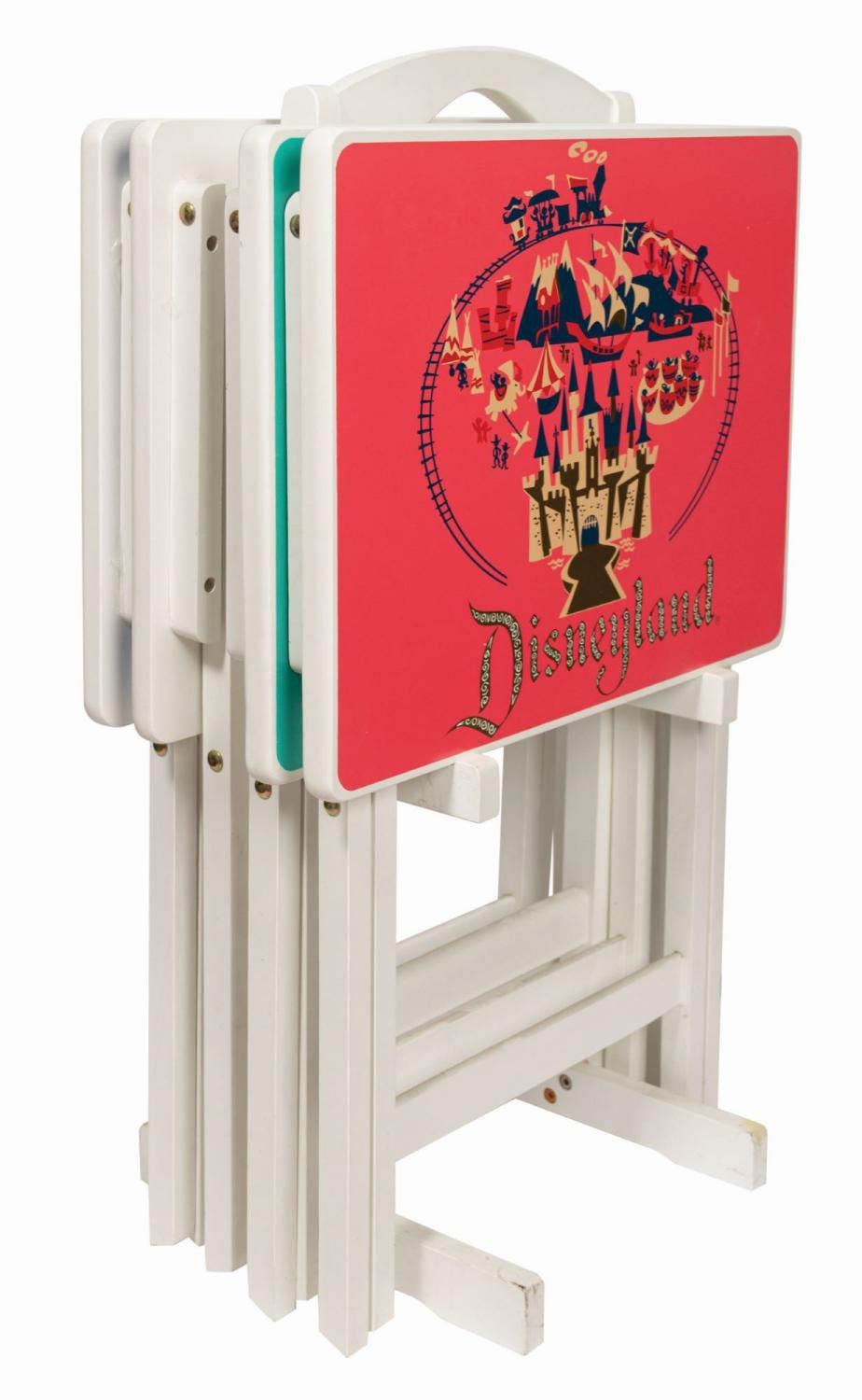 (Disneyland, 2005) A rare set of (4) TV trays created by Kevin Kidney, Jody Daily, and Robert Story in celebration of Disneyland's 50th Anniversary. This special set honors two touchstones of American culture first introduced in the 1950s, the spectacular Disneyland theme park and the humble TV tray. The white wooden collapsible trays feature a Mid-Century-inflected rendition of the Disneyland park map. The set is accompanied by a matching white wooden tray stand. Each tray is 14.5"x19" and 25.5" tall, and the stand measures 30.5"x12.75 and 10.5" deep. The set is in generally very good to fine condition with some scuffing and wear to the tray legs and the stand.