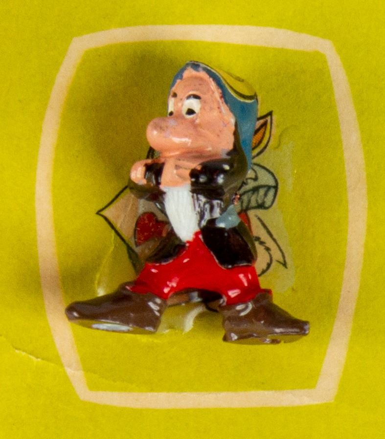 (Marx, 1960s-70s) A set of (4) hand-painted Disneykins by Marx displayed for sale on a paper backing. These types of display cards were used within capsule machines around the early 1970s. Promoted as "Hand Decorated in Full Color" for 10 cents, this set includes Grumpy, Bashful, one of Donald's nephews, and Minnie. The figures are glued in place on the card, with one empty section. Measuring 4.5"x5", the set is in good condition with some minor creasing to the card.