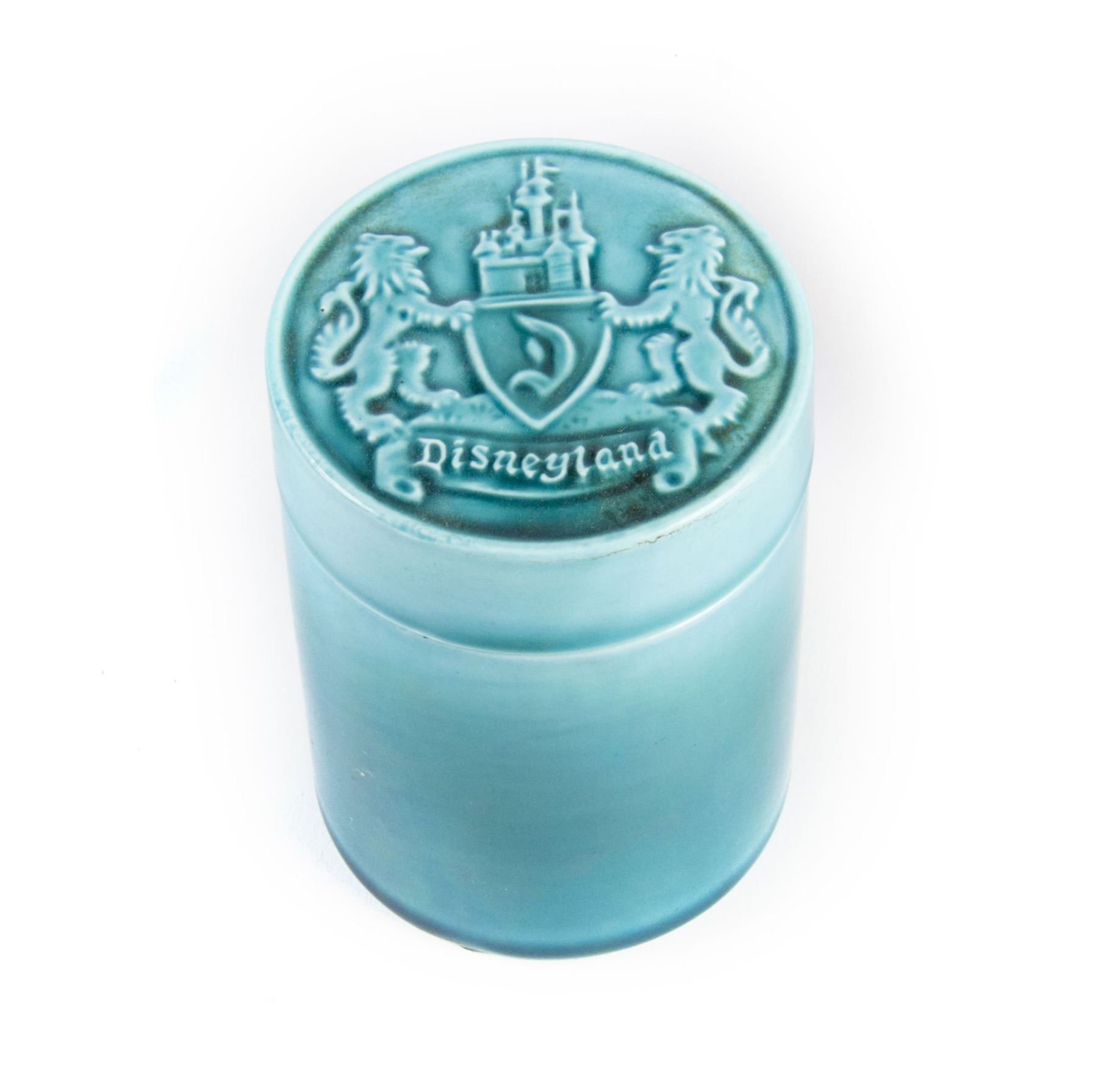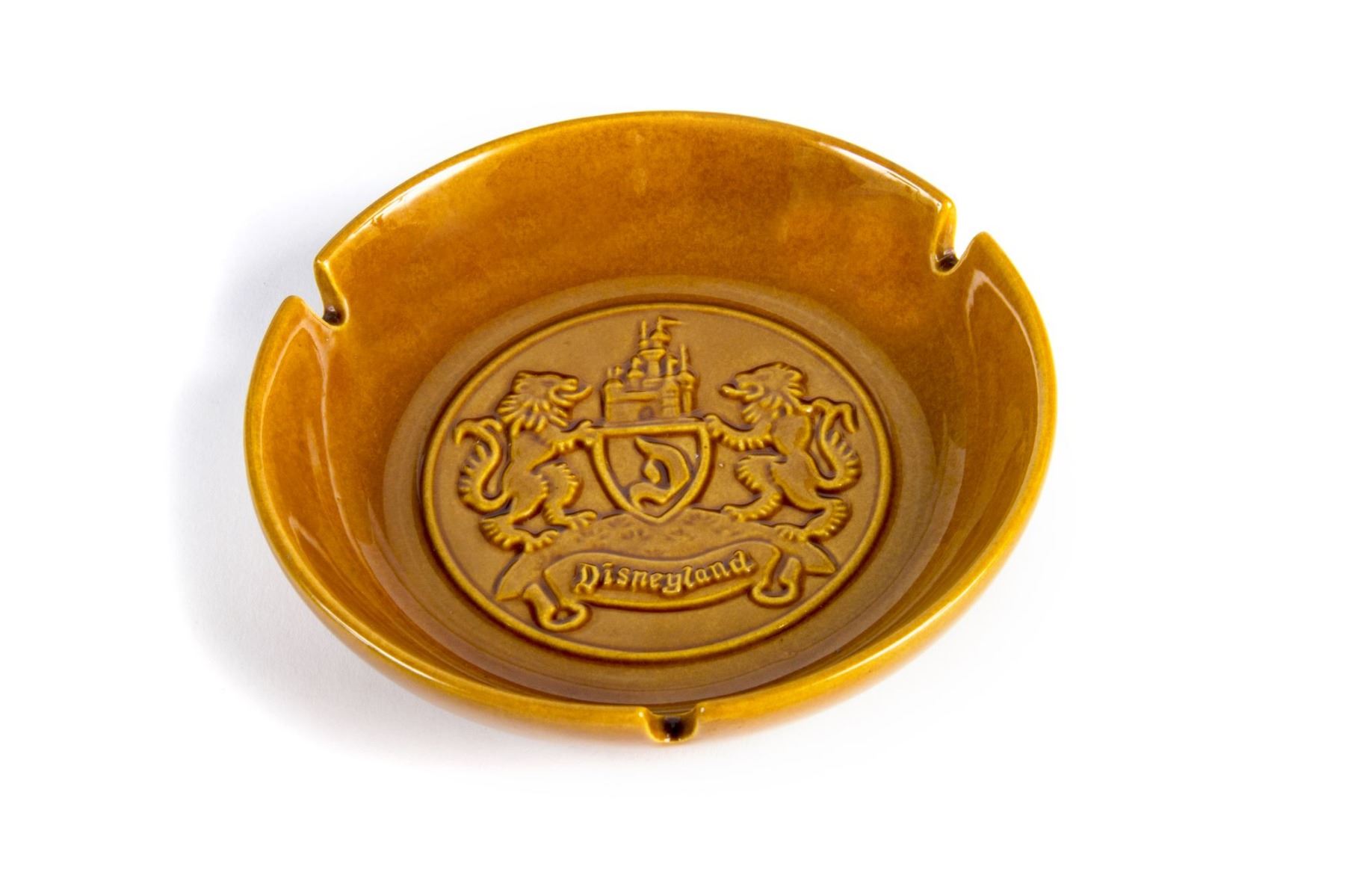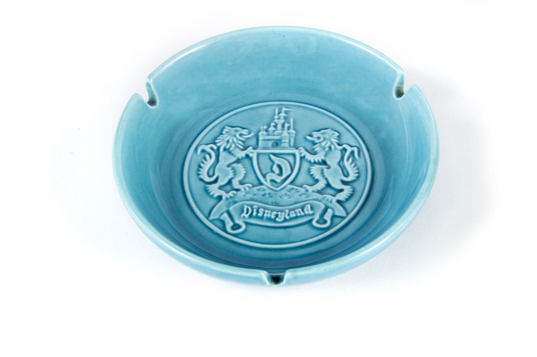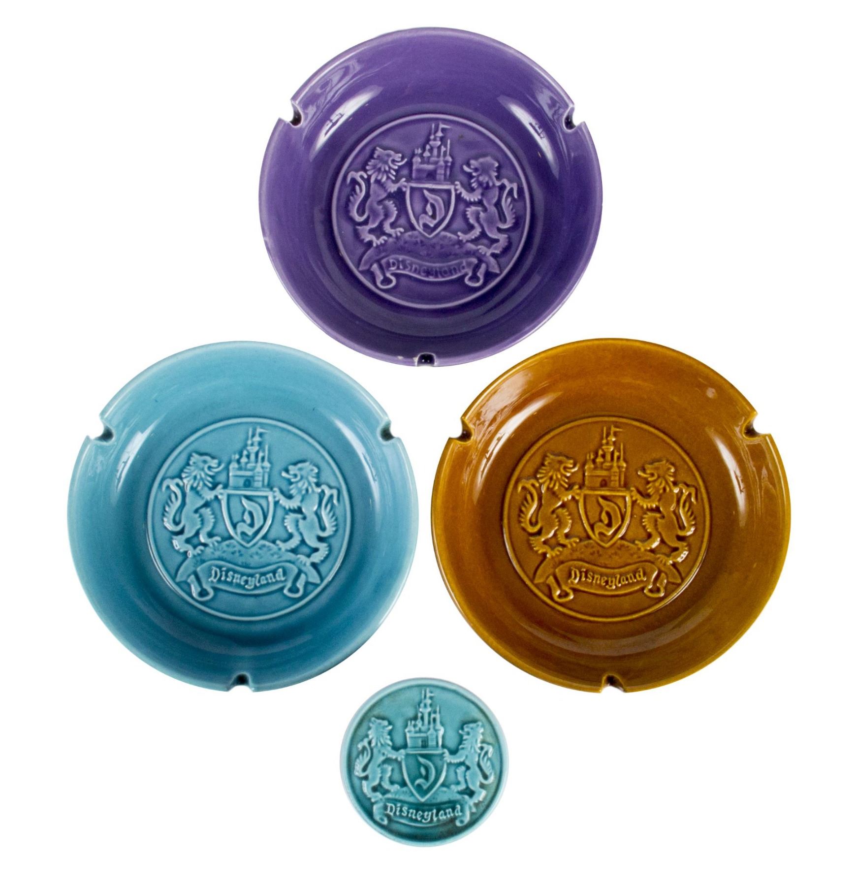(Disneyland, c.1956) A collection of ceramic smoking items from Disneyland. The set includes (3) matching ashtrays in different colors and a cigarette holder, all with the same Disneyland crest logo. Each ashtray measures 6.5" in diameter and 1.5" tall and the cigarette holder measures 2.75" in diameter and 3.75" tall. The set is in very good condition overall with a few small spots of paint wear from use.