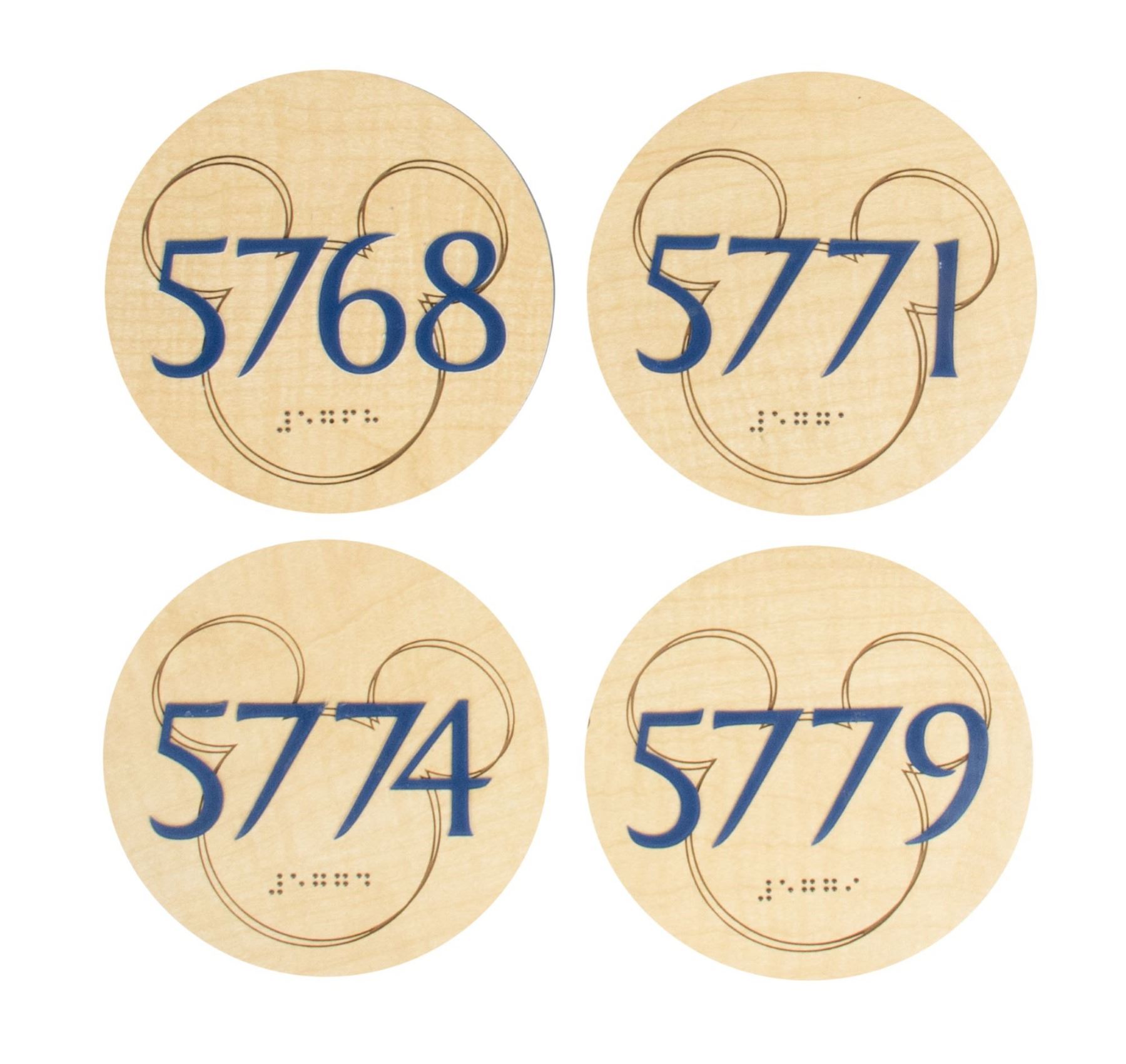 (Disneyland, c.2001) A very rare set of (4) room number wall plaques from the Disneyland Hotel. There is a stylish Mickey-head logo behind the numbering, and the room number is also written in braille along the bottom. The plaques measure 5" in diameter and the set is in good condition with some wear from use and some surface wear and minor areas of adhesive residue on the backs from their original display.