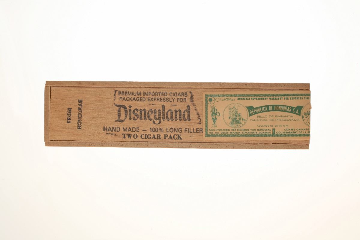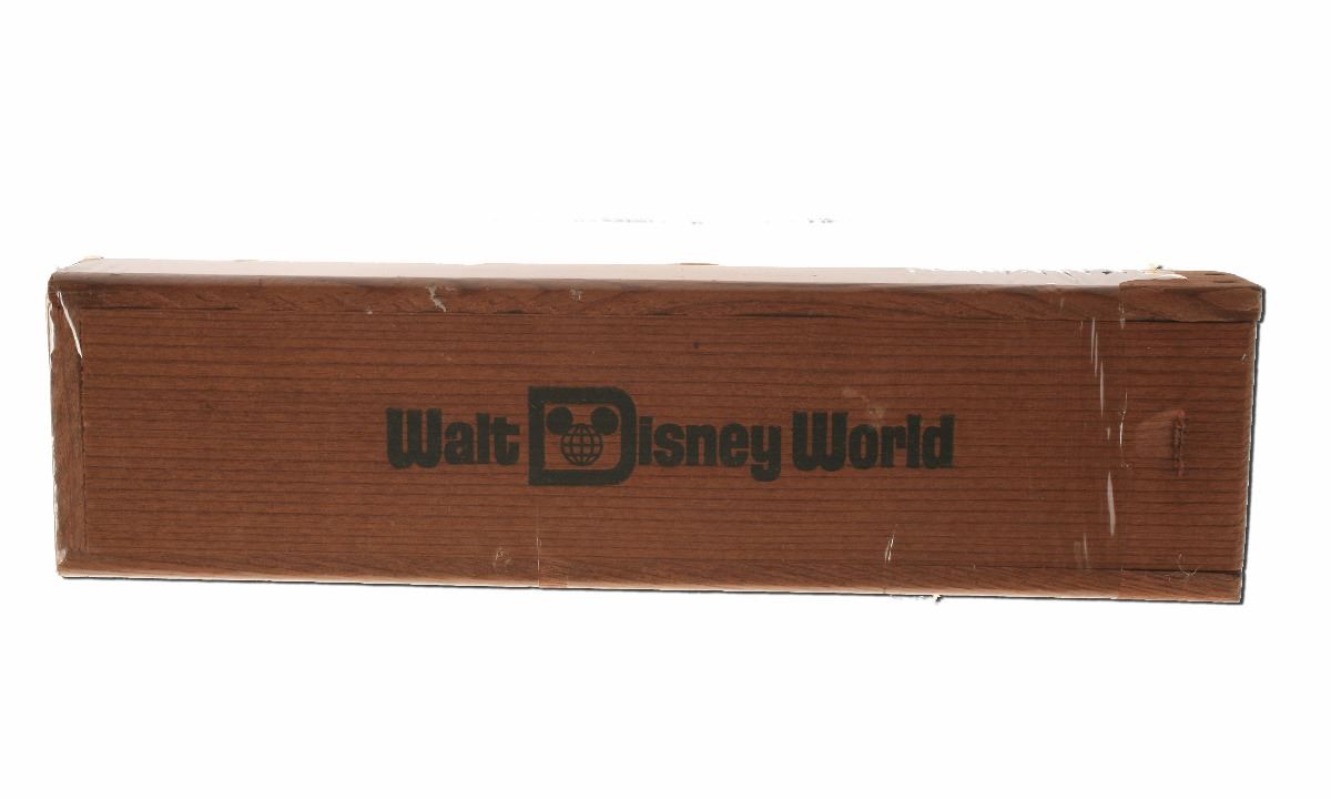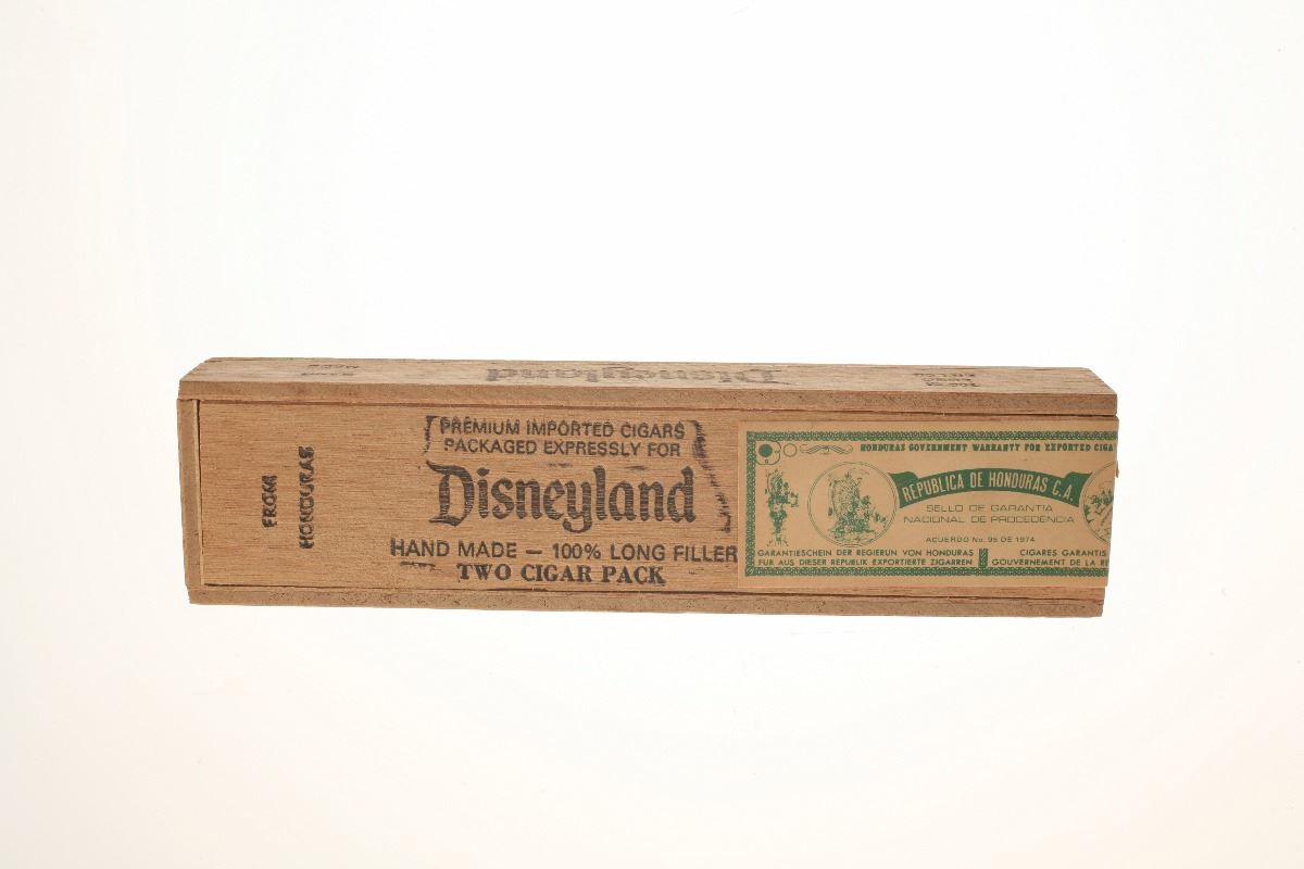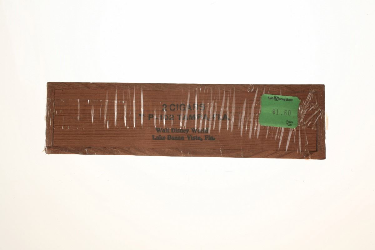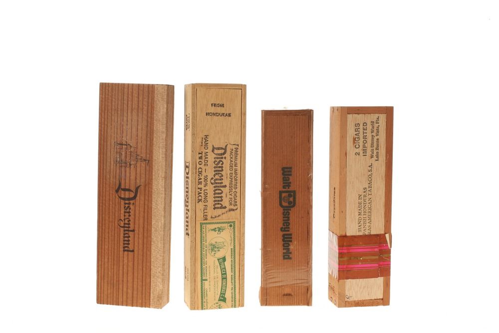 (Disneyland/Walt Disney World, 1970s) Beautiful set of (4) wooden cigar boxes containing two from Disneyland and two from Walt Disney World. One box from Walt Disney World is still in its wrapping and contains its original (2) cigars, the others are empty. Set is in good condition with minimal wear throughout.