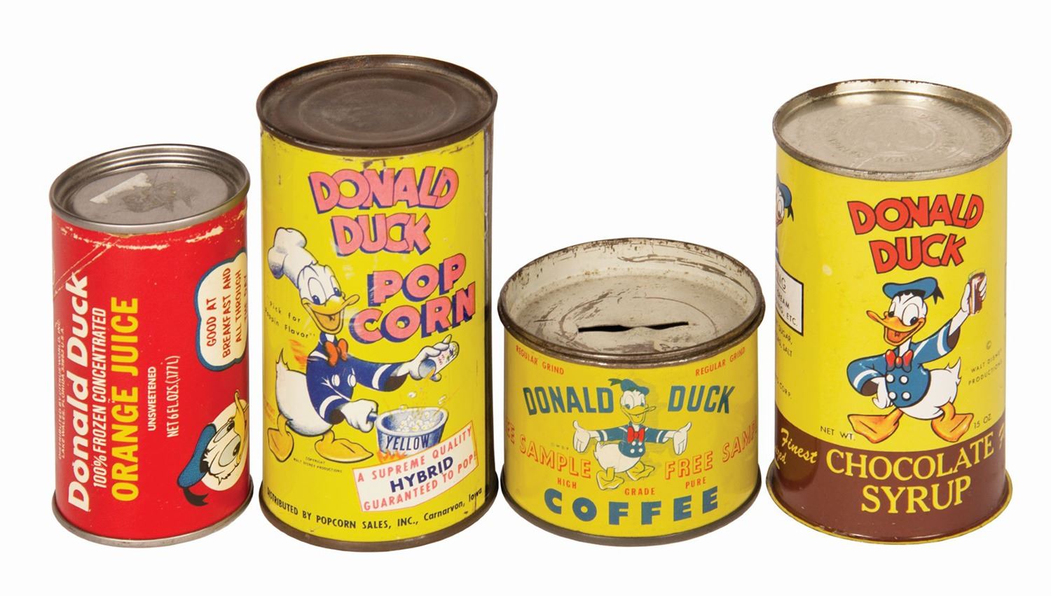 (Disney, c.1940s-50s) A collection of (4) vintage Donald Duck-branded canned goods. The collection includes an empty cardboard and tin Donald Duck Orange Juice can, an unopened tin lithograph Donald Duck Pop Corn can with kernels still inside, an empty tin lithograph Donald Duck Chocolate Syrup can with a missing bottom, and an empty tin lithograph sample size Donald Duck Coffee can. Slits have been cut in the orange juice can and coffee can to convert them into coin banks. Measuring from 2.25” tall and 3” in diameter to 5” tall and 2.75” in diameter, the cans range in condition from good to very good, exhibiting some denting, oxidation, and age.