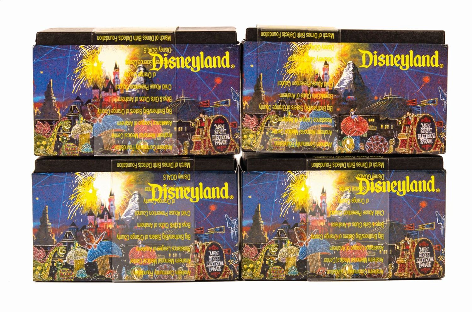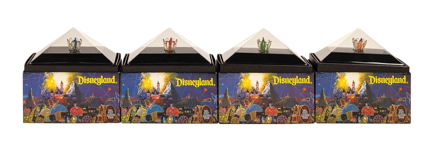 (Disneyland, 1996) A collection of (4) boxed light bulbs used for the Main Street Electrical Parade. These props were sold within the park following their initial use, with the proceeds benefiting various charity organizations. Each boxed light comes with its plastic sleeve that lists the charity organizations involved. All the lights are the same flower-like shape, with 2 red lights, one blue light and one purple light. Each box measures 5"x3" and 3" tall and the set is in very good condition with minimal wear.