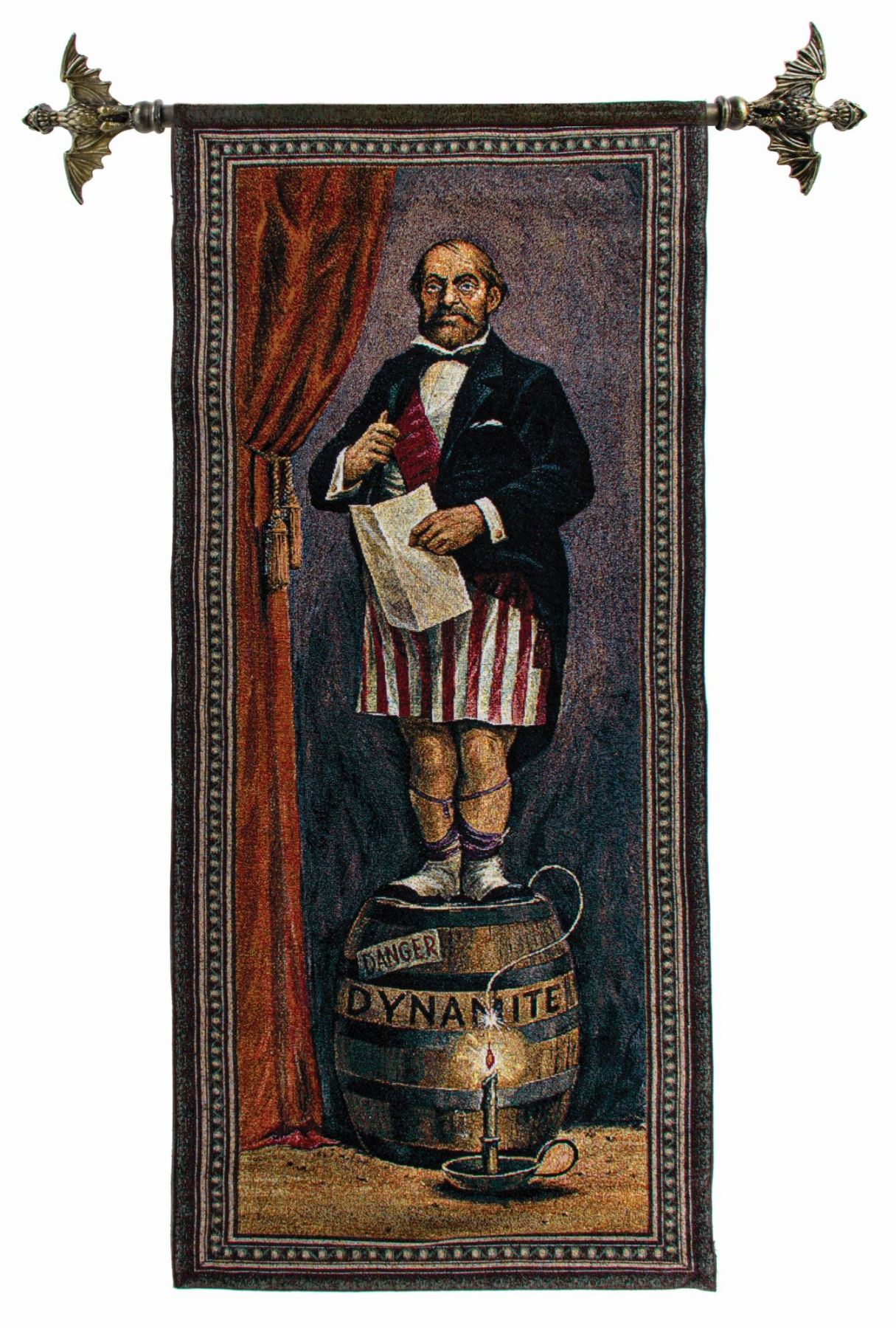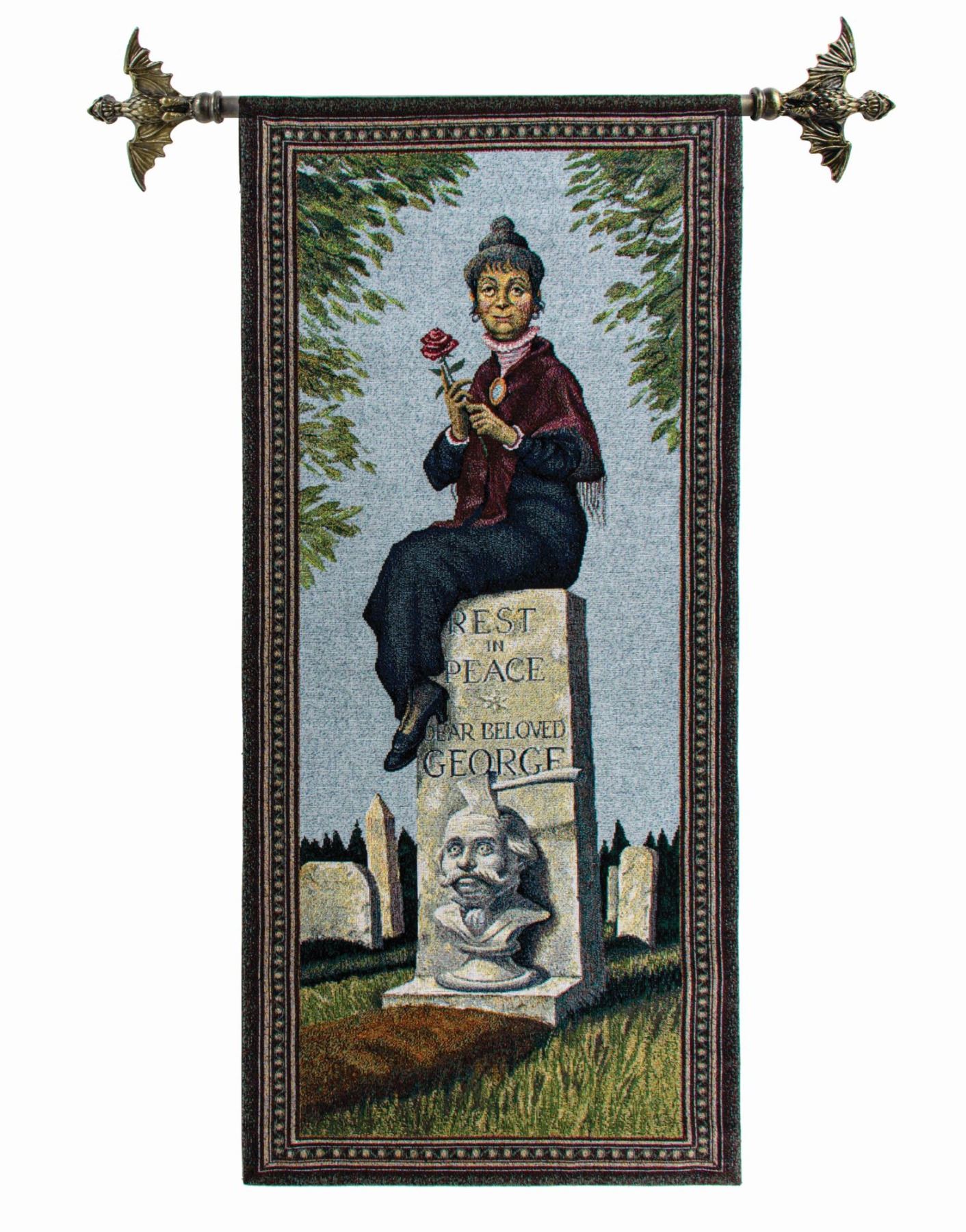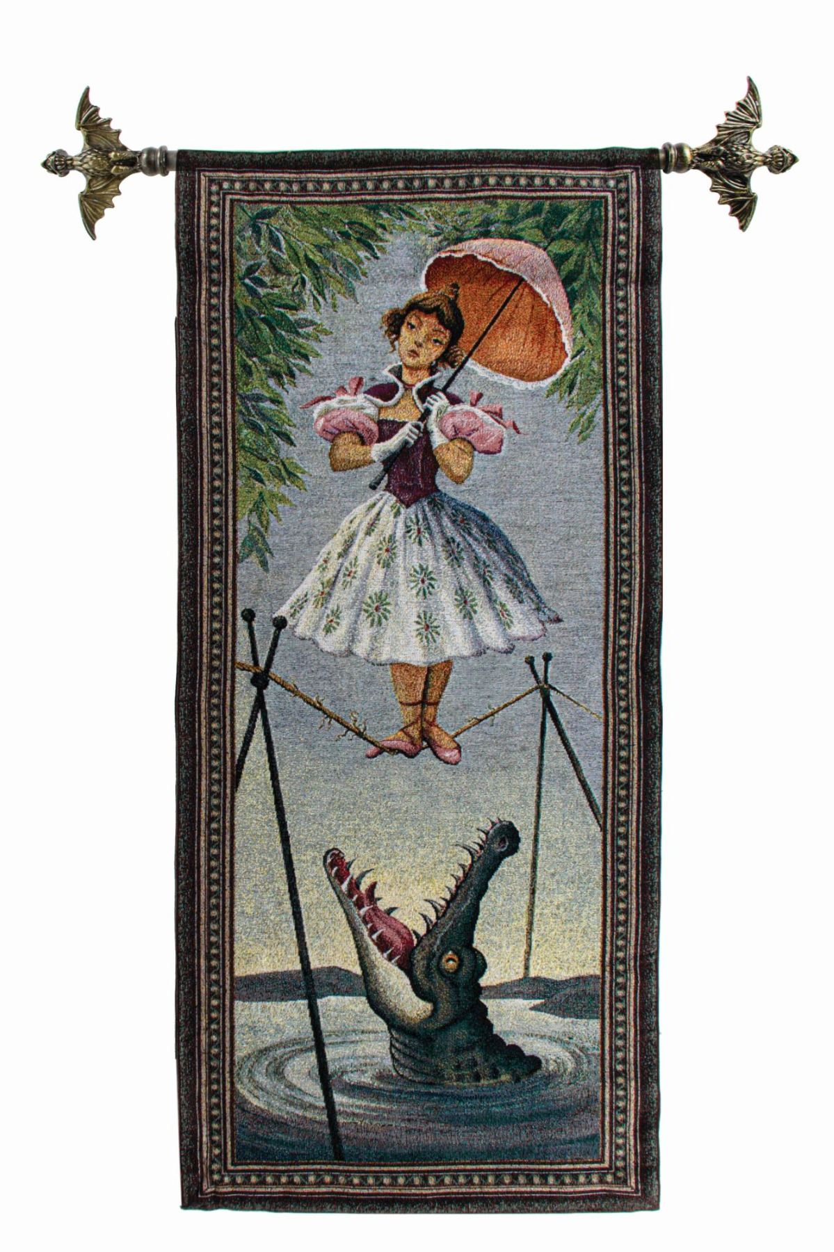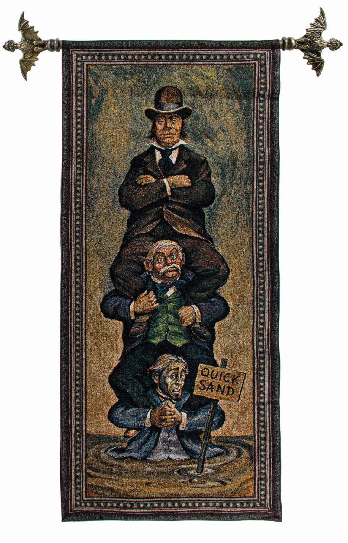 (Disneyland, 2005) A highly detailed set of (4) woven limited edition replicas of Disney Legend Marc Davis' "stretching portraits." The cotton tapestries come with iron hanging rods decorated with bat finials that were modeled after those found in the Portrait Corridor. These were released in an edition of 999 pieces and complete sets are extremely hard to find. The tapestries measure 37.5"x16.5" each, and the set is in fair to good condition overall. Two of the bat finials have broken wings, and one of those also has a break in the mouth.