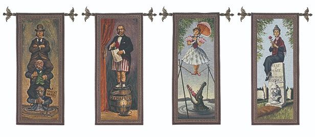 (Disneyland, 2005) An extremely rare complete set of four limited edition tapestries which replicate the "stretching portraits" designed by Marc Davis. The cotton tapestries come with iron hanging rods decorated with bat finials, and were released in an edition of 999 pieces. Complete sets of these desirable collectibles are extremely hard-to-find. The tapestries measure approximately 37.5''x16.5'' and the set is in very fine condition.