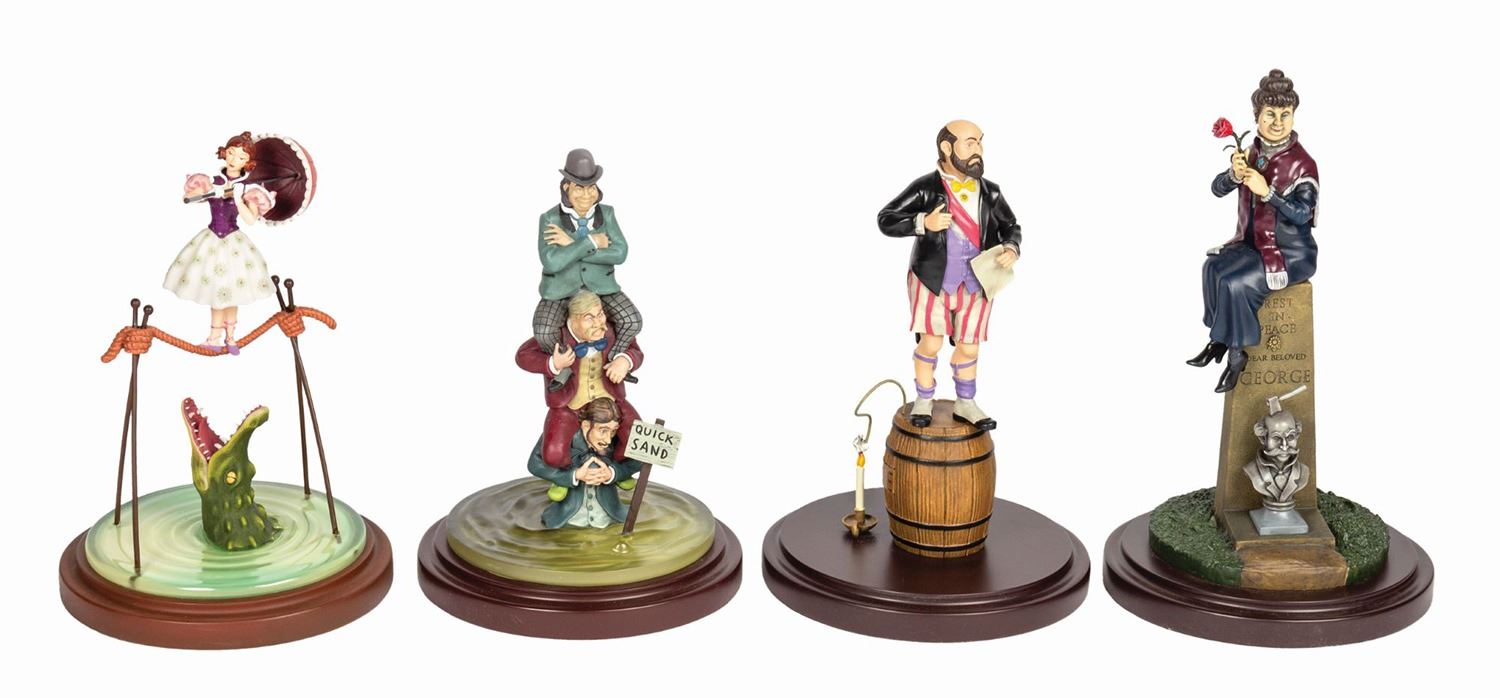 (Disneyland, c.2010s) A complete set of (4) Haunted Mansion figures depicting each of the popular stretching portraits. The figures are created in hand-painted resin with faux wood finish bases and were offered as part of The Art of Disney Theme Parks collection. Each figure measures approximately 6.75" in diameter and 10" tall. The condition is very fine overall, with a few small surface scratches.