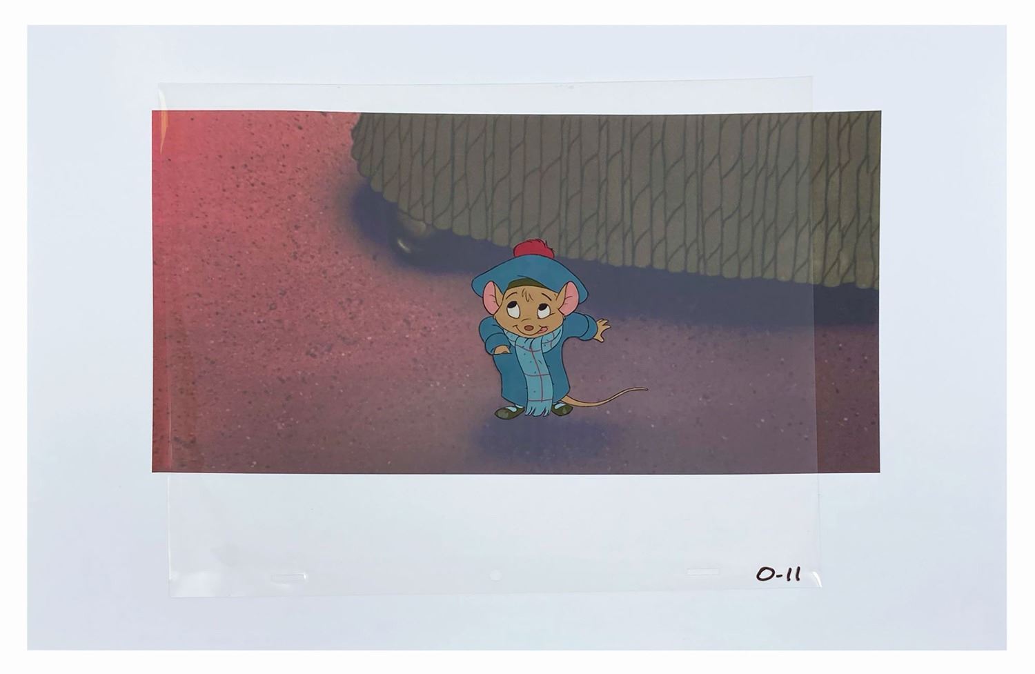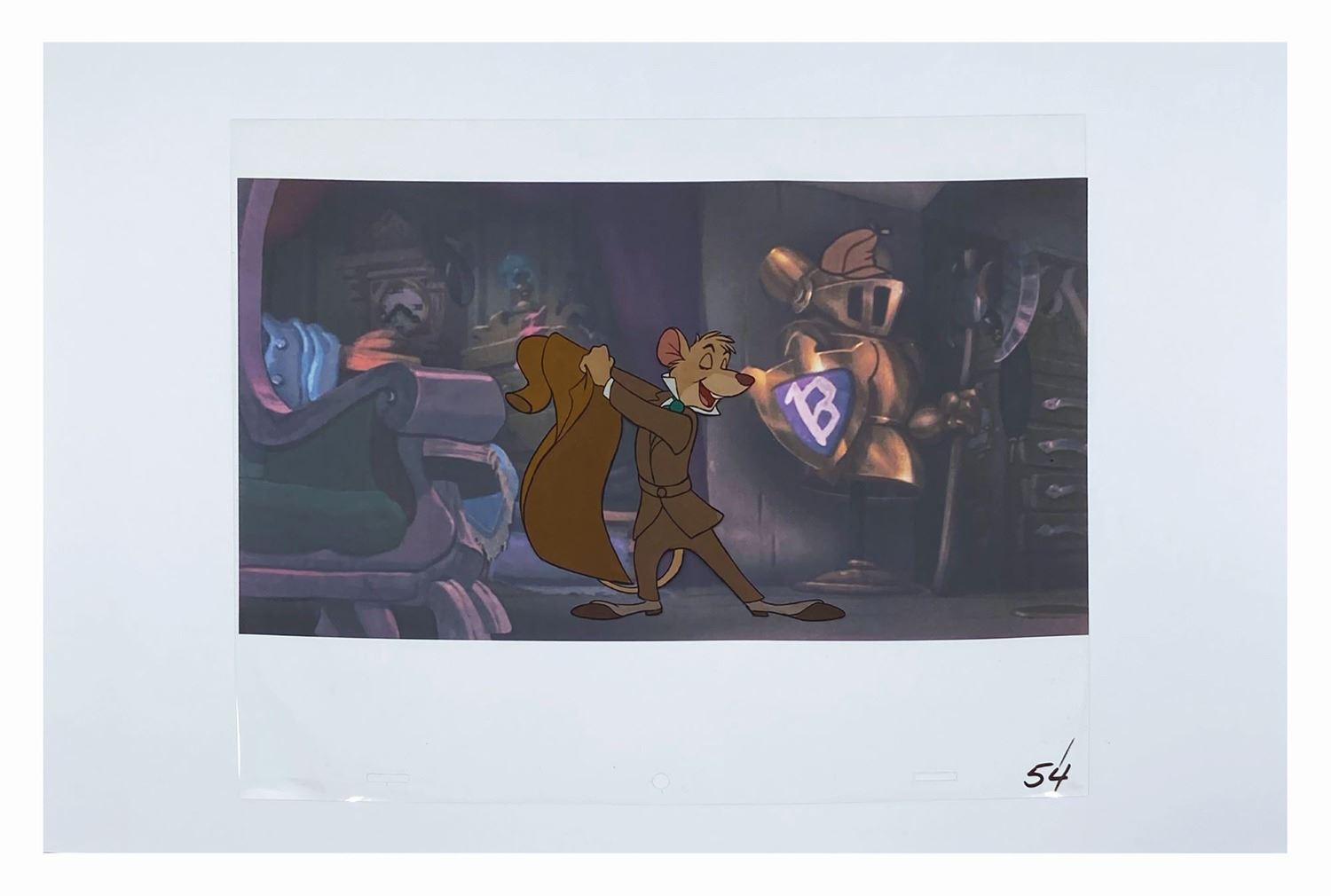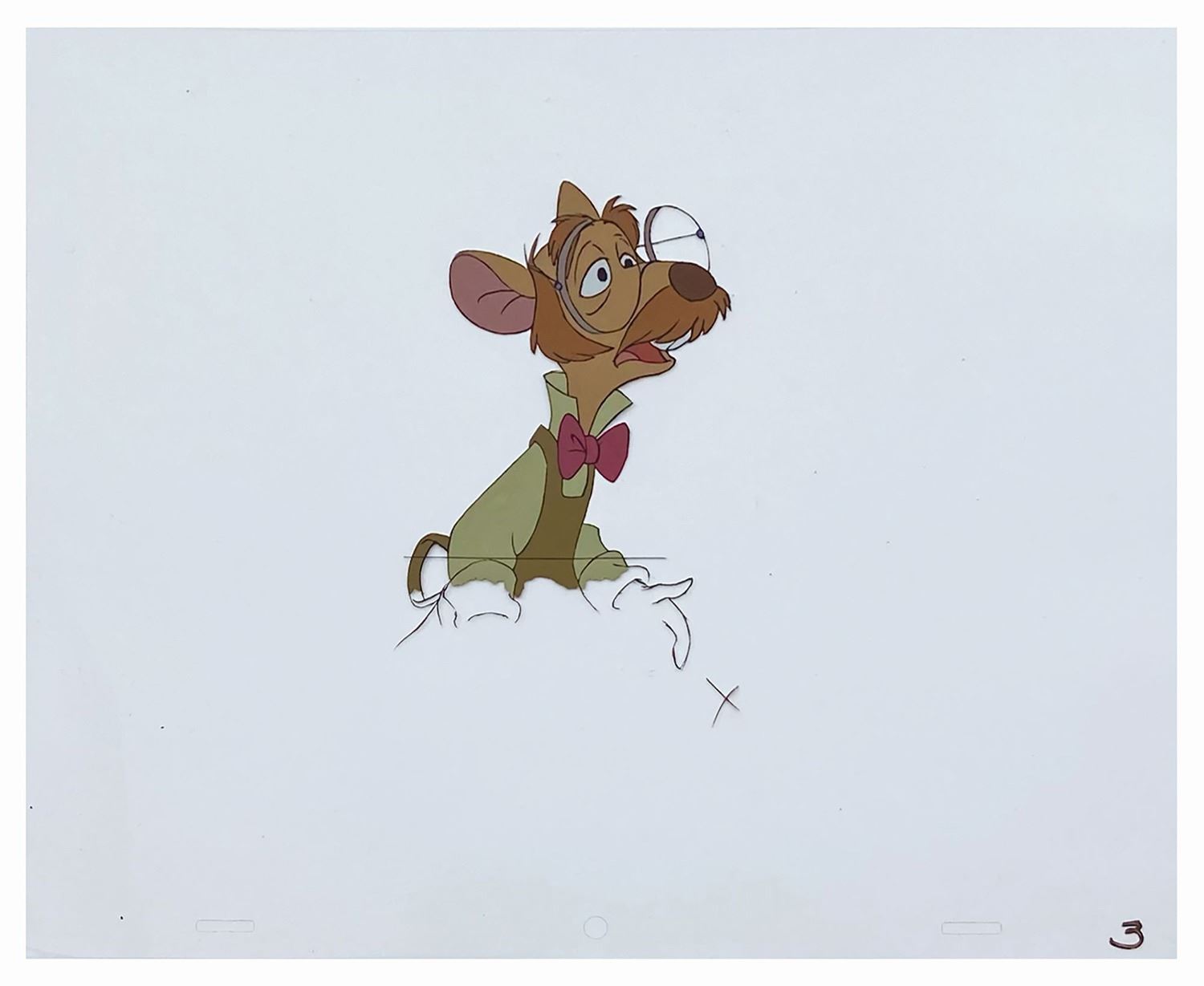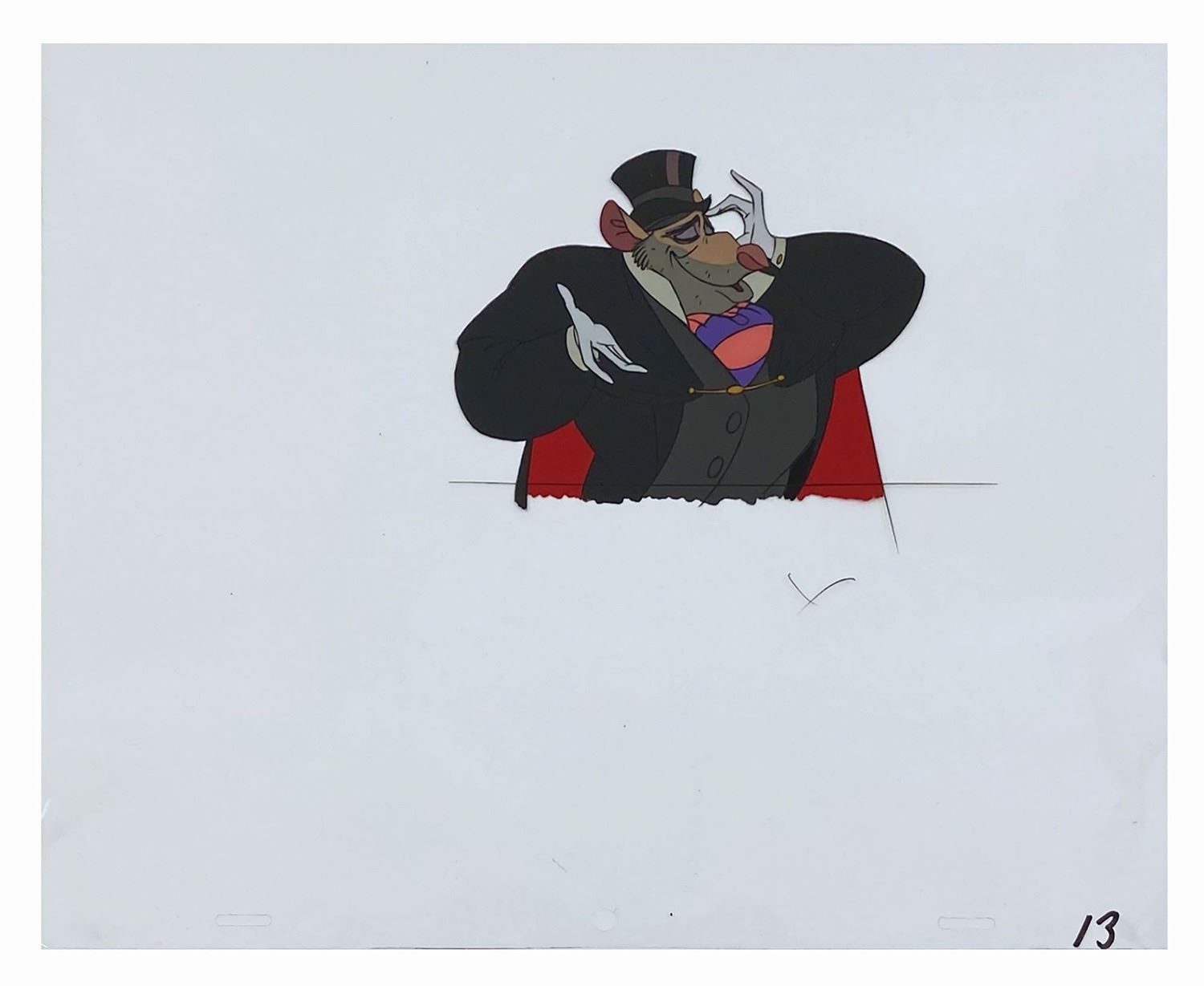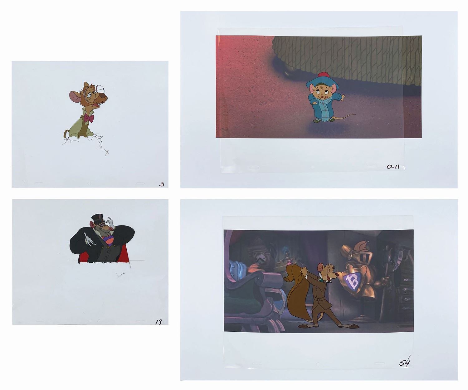 (Disney, 1986) A collection of (4) original production cels featuring Ratigan, Basil, Olivia, and Hiram from Walt Disney's The Great Mouse Detective. The cels measure 10.5"x12.5", and Basil and Olivia have been placed over reproduction printed backgrounds that measure 13"x19". The cels are in very good condition overall, with Hiram having his paint professionally restored.