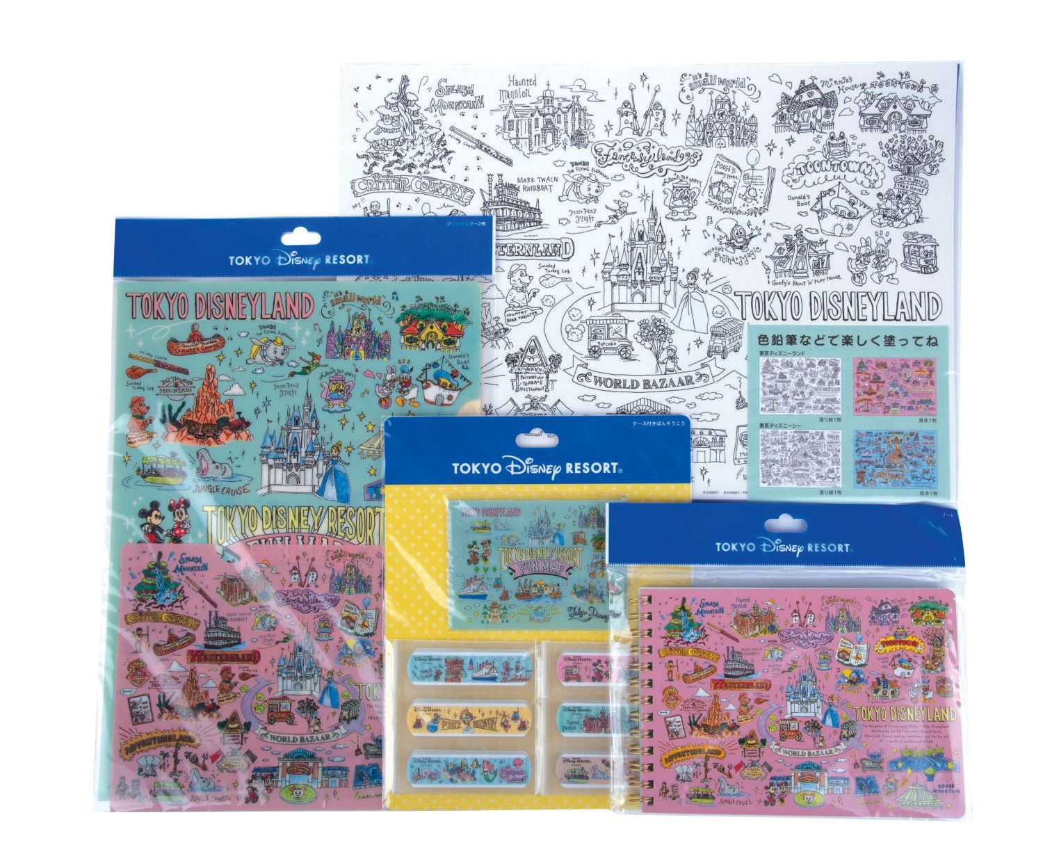 (Tokyo Disney Resort, 2000s) A lot of souvenir coloring sheets, plastic holders, band aid set, and 160-page notebook from Tokyo Disney Resort. The collection is in fine unused condition in original packaging.