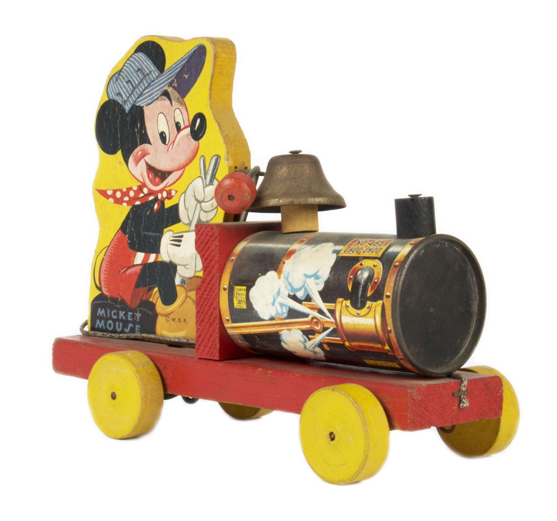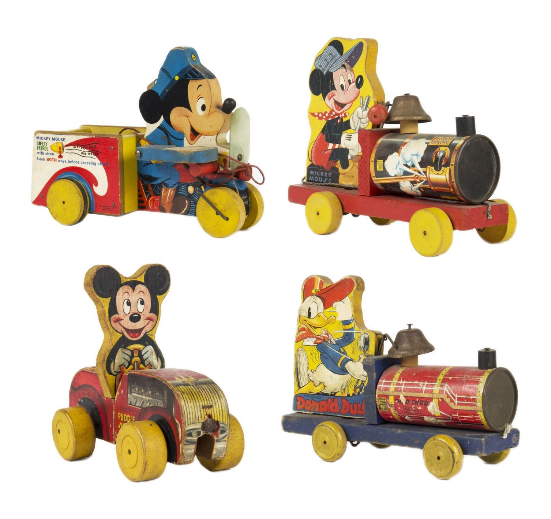 (Fisher Price, c.1940s-50s) A collection of (4) wooden pull toys from Fisher Price featuring Mickey and Donald. The set includes two locomotive style toys with bells, a Mickey Mouse Safety Patrol toy with a cart, and a Mickey Puddle Jumper toy that can rotate in the center. The toys range in size from 5.5" to 7" tall. The condition varies throughout the pull toys but is fair to good overall with expected wear throughout from use. Some toys are missing small pieces such as the pull cord or the padded portion that would ring the bell.