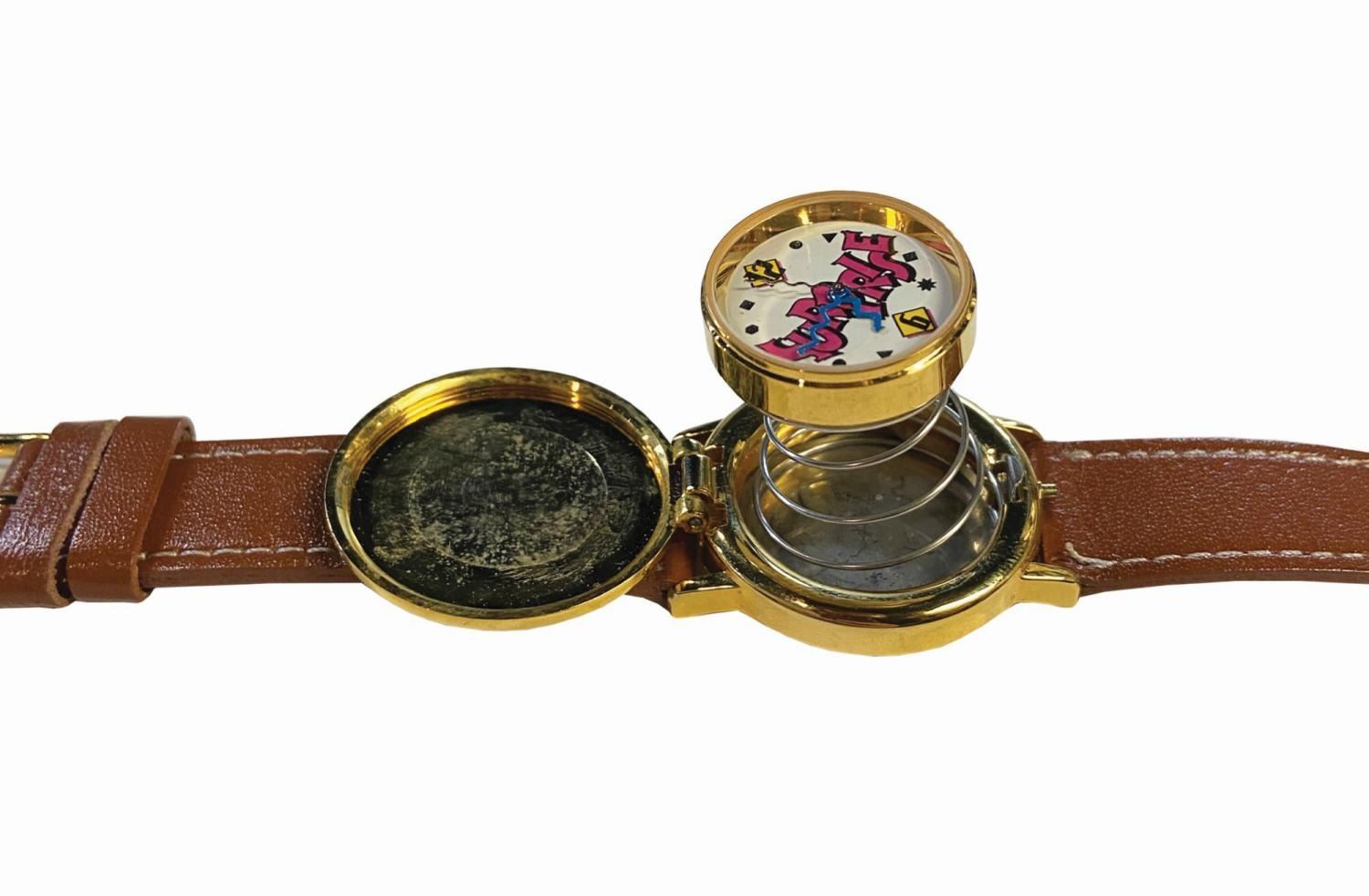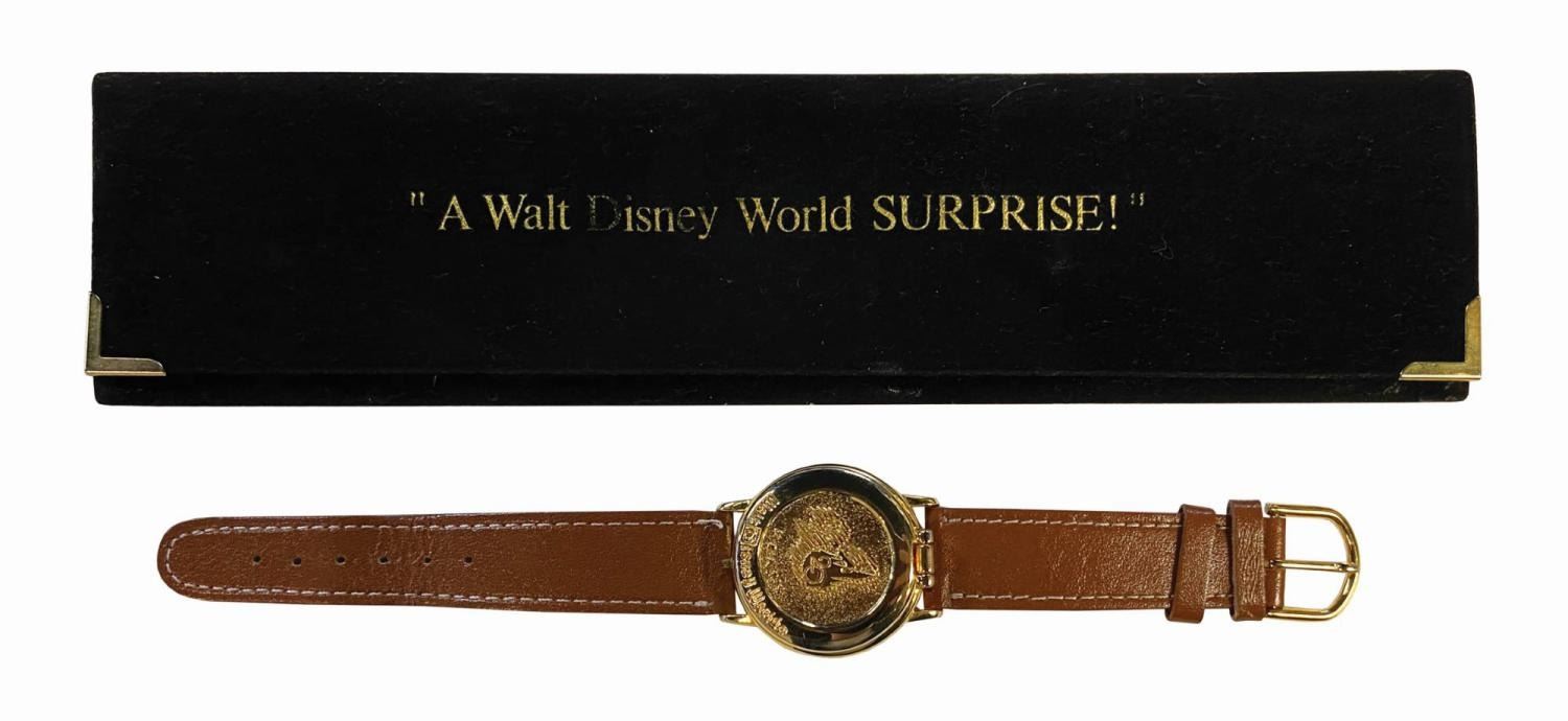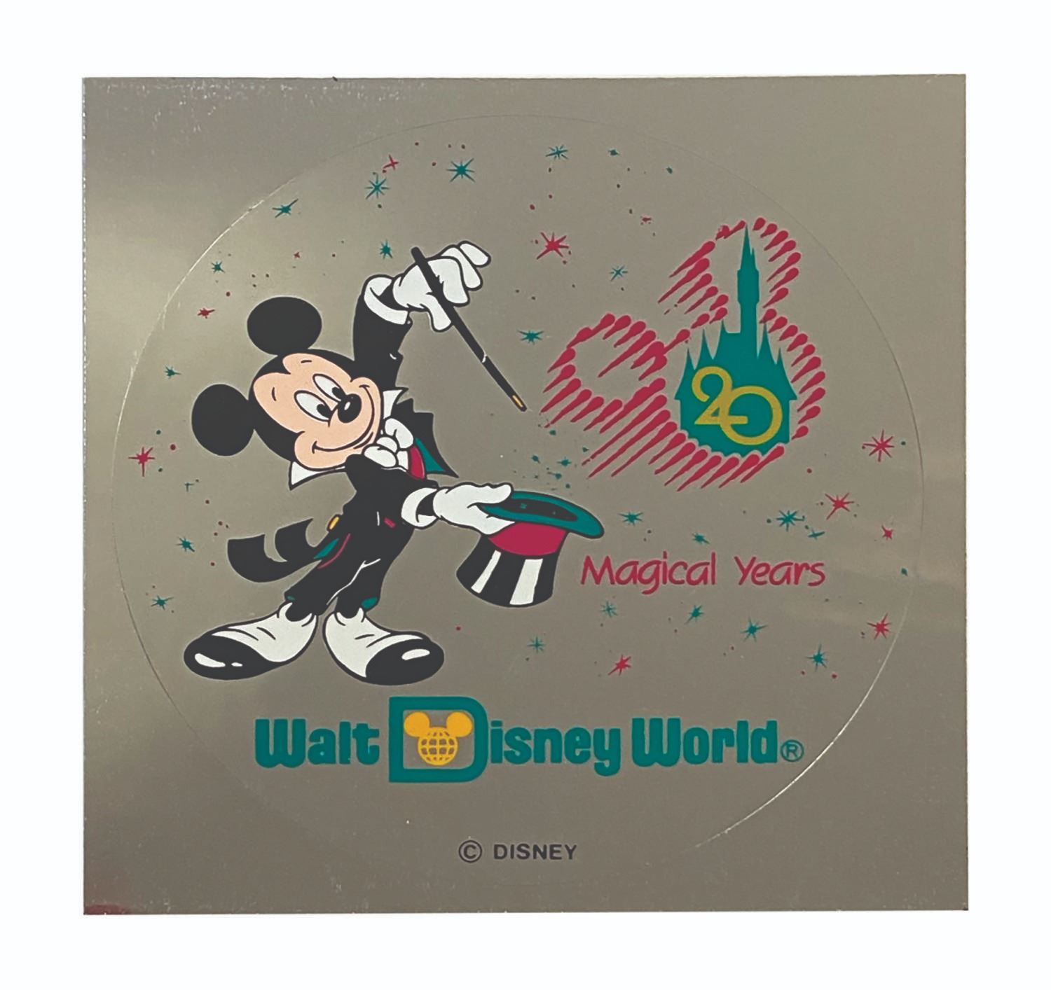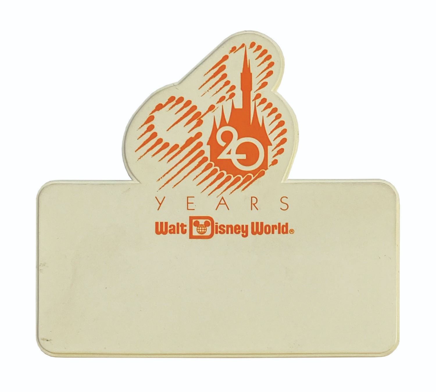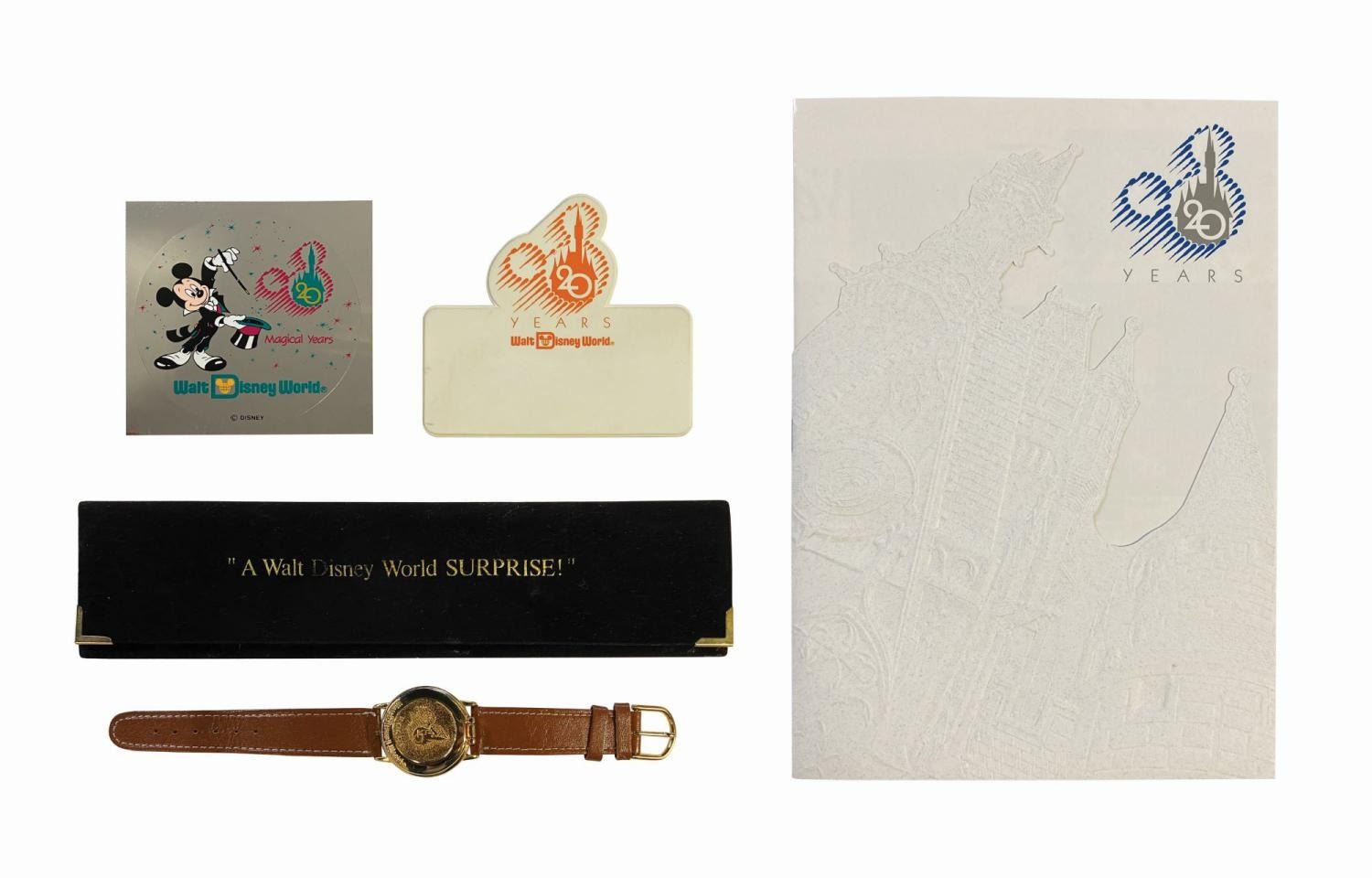(Walt Disney World, 1991) A collection of (4) items from Walt Disney World's 20th anniversary celebration. Included is a press invitation booklet with an itinerary, a 20th anniversary sticker, a press badge nametag, and a pop-up watch. The 20th anniversary was billed as a "Surprise!" party, and this theme is reflected in the invitation and watch. Ranging from the 3.25"x3.75" badge to the 9"x6.5" invitation, the items are in very good condition with minor wear. The watch shows mild tarnishing on the interior of the casing and may require a new battery to function.