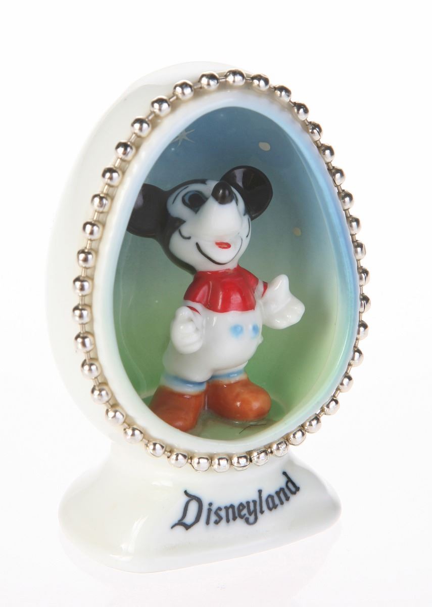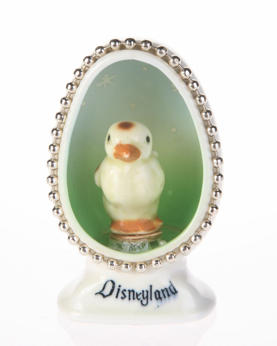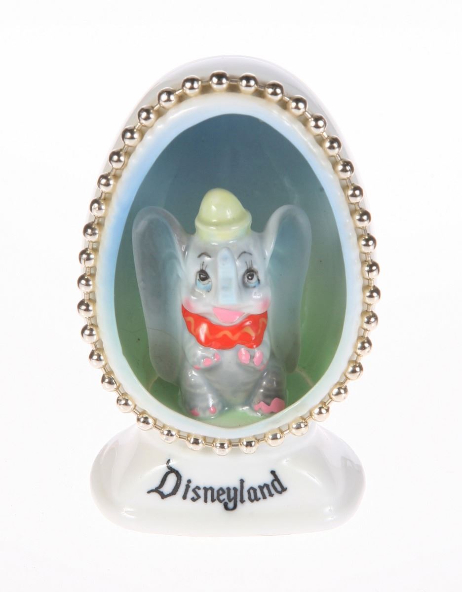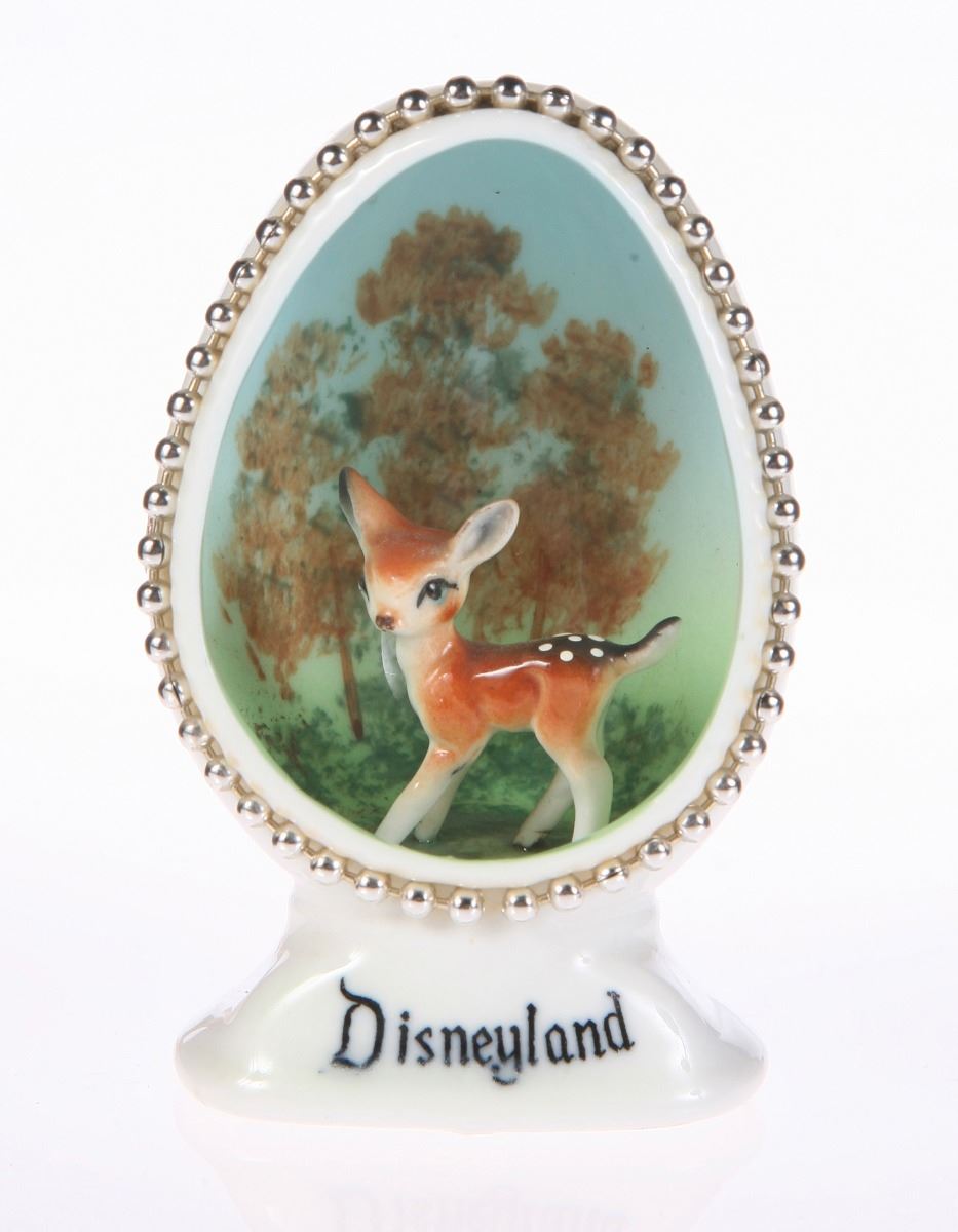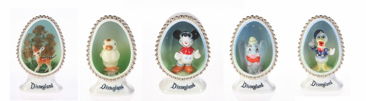 (Disneyland, 1960s) Set of (5) souvenir bone china figurines in egg-shaped displays. with "Disneyland" painted on the base. Set includes Mickey, Donald, Dumbo, Bambi, and a Bird. Measures 1.25"x1.75" and 2.75" tall, each. In good condition with minimal wear. "Disneyland" is slightly smudged on the Bird figurine.