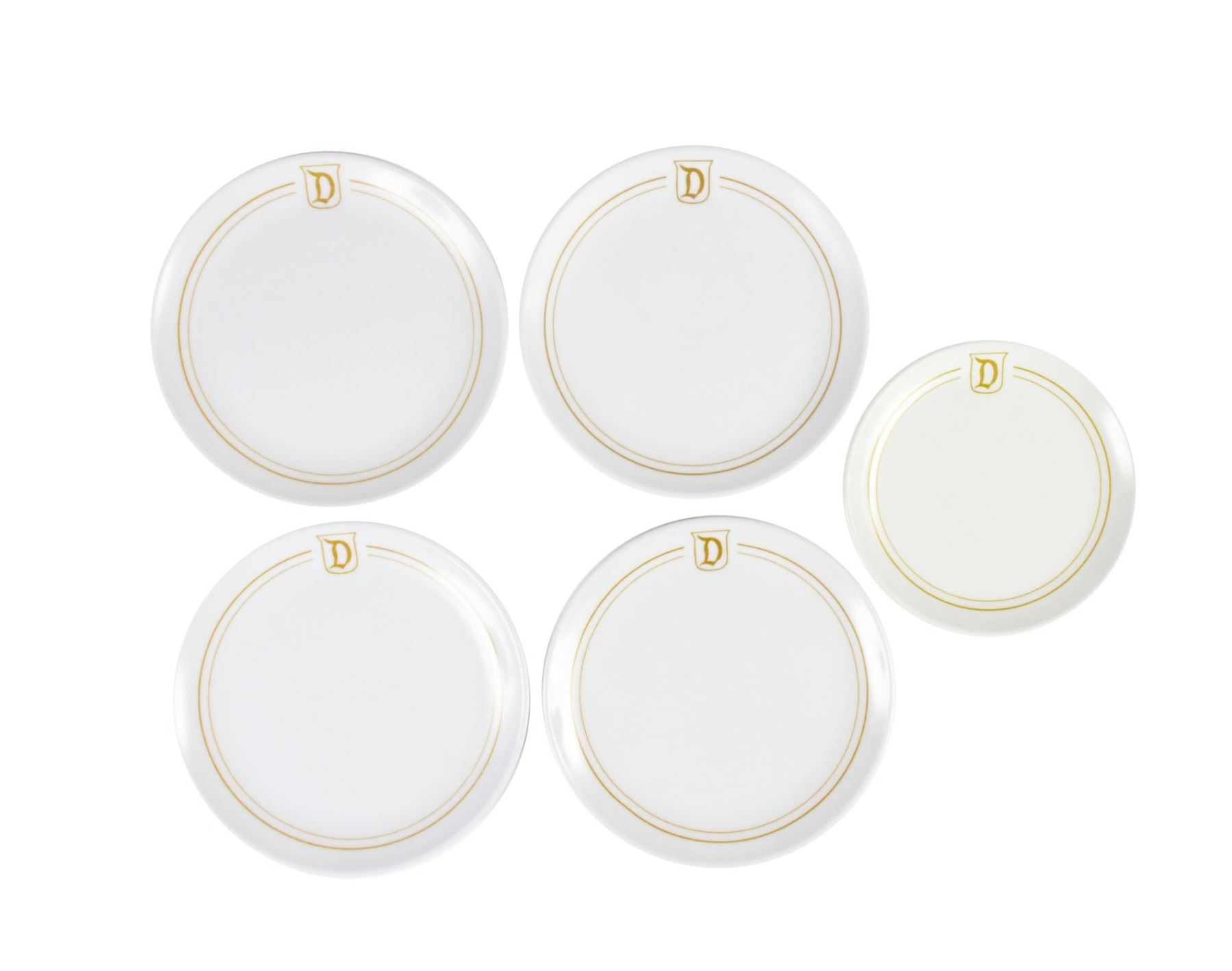 (Disneyland, c.1970s-80s) A set of (5) dishes from the Disneyland Hotel that featuring matching "D" logos. The dishes include four larger and one smaller plate. Measuring 7" in diameter and 6" in diameter, the plates are in good condition with some minor wear from use.