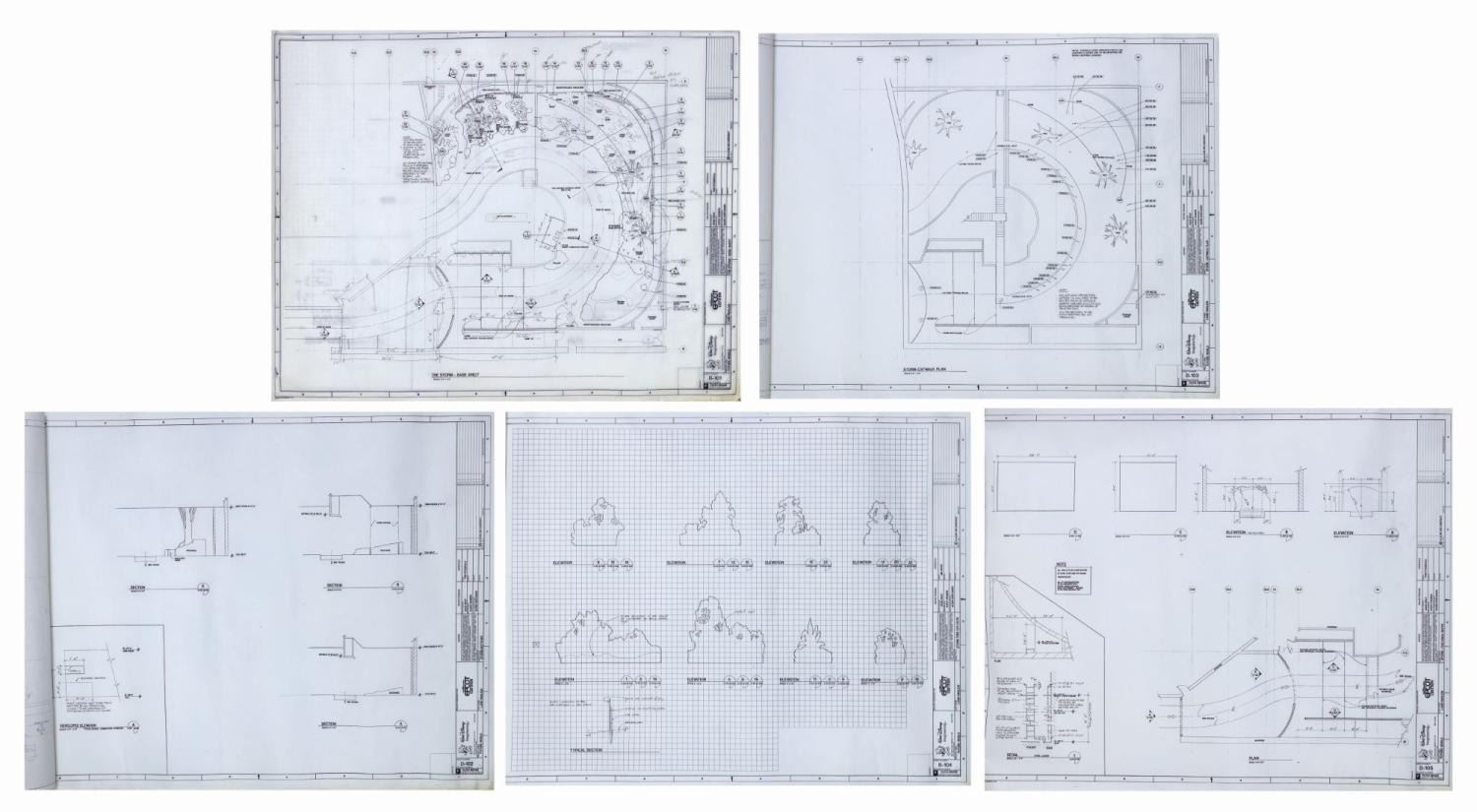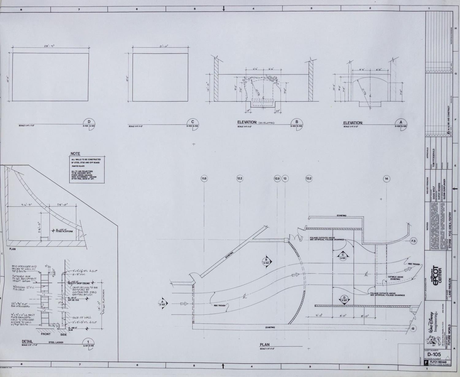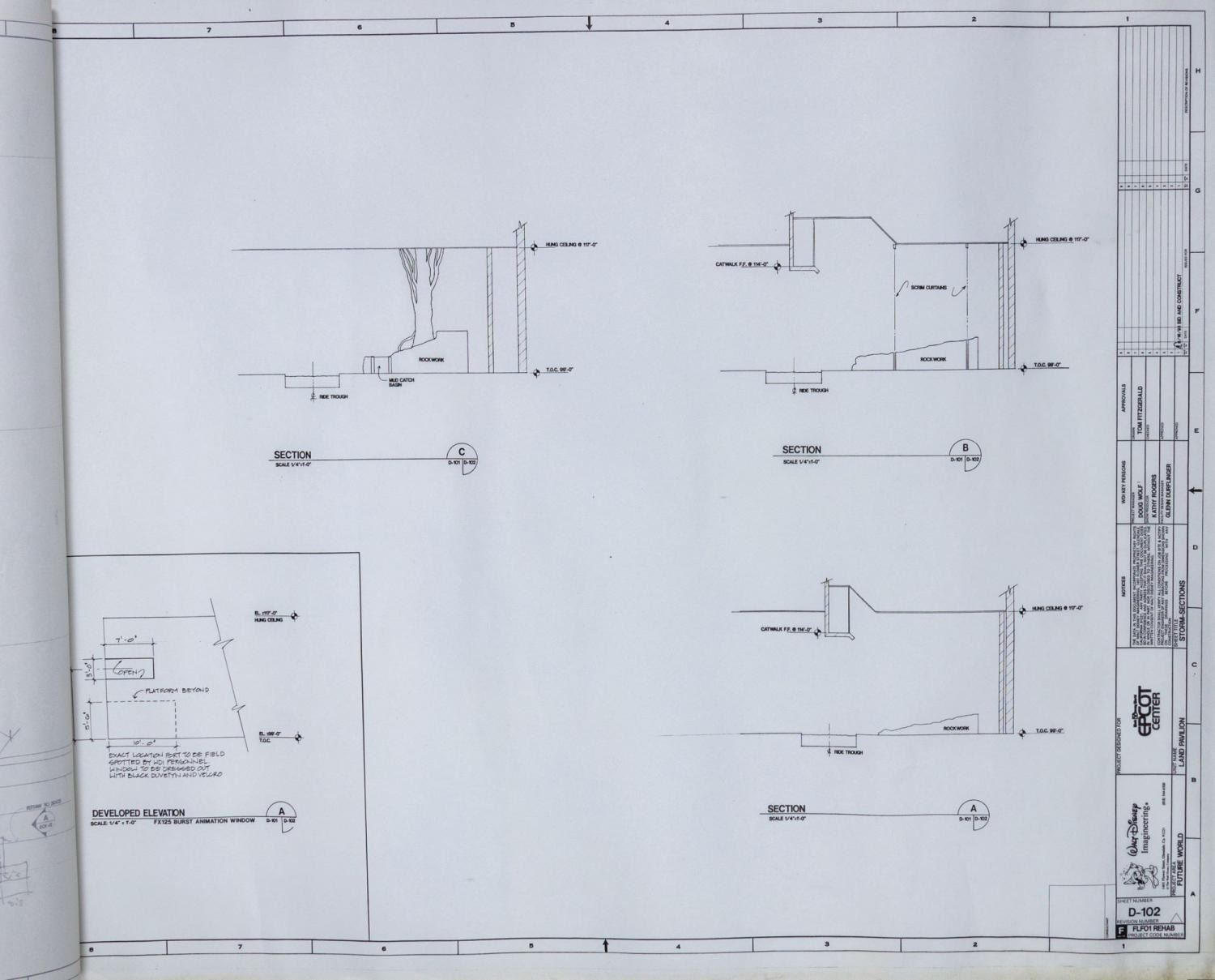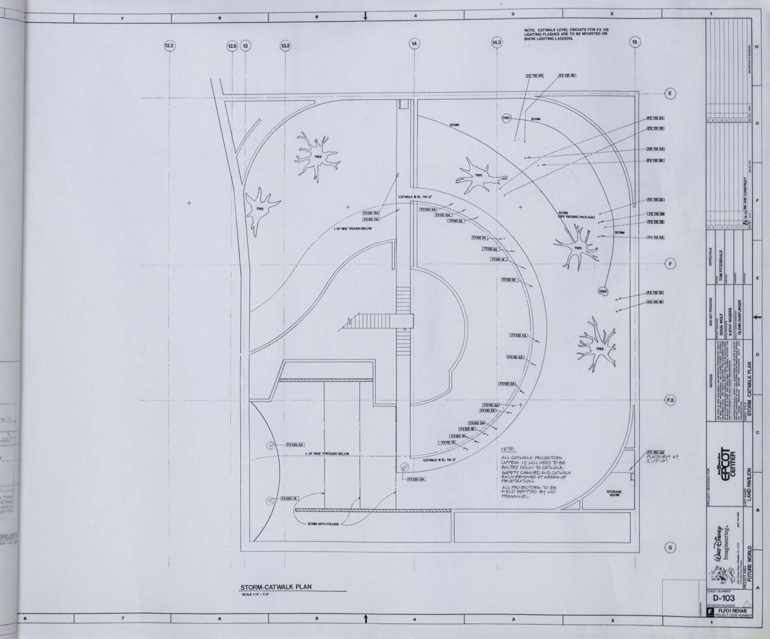 (Epcot, 1993) A set of (5) architectural plans for the simulated storm section of the Living with the Land ride in The Land Pavilion at Epcot. Dating from the 1993 refurbishment, these designs show an overview of the thunderstorm in a deciduous forest section of the dark ride boat tour, highlight sections of this ride segment, delineate the catwalks on which the special effects projectors are placed, provide elevation details of specific scenic elements, and designate placement of atmospheric fog machine devices. Staple-bound at the left edge, the prints bear some Imagineer hand-annotation in pencil and generally measure 18.5"x22.25". They are in very good condition with some handling wear.