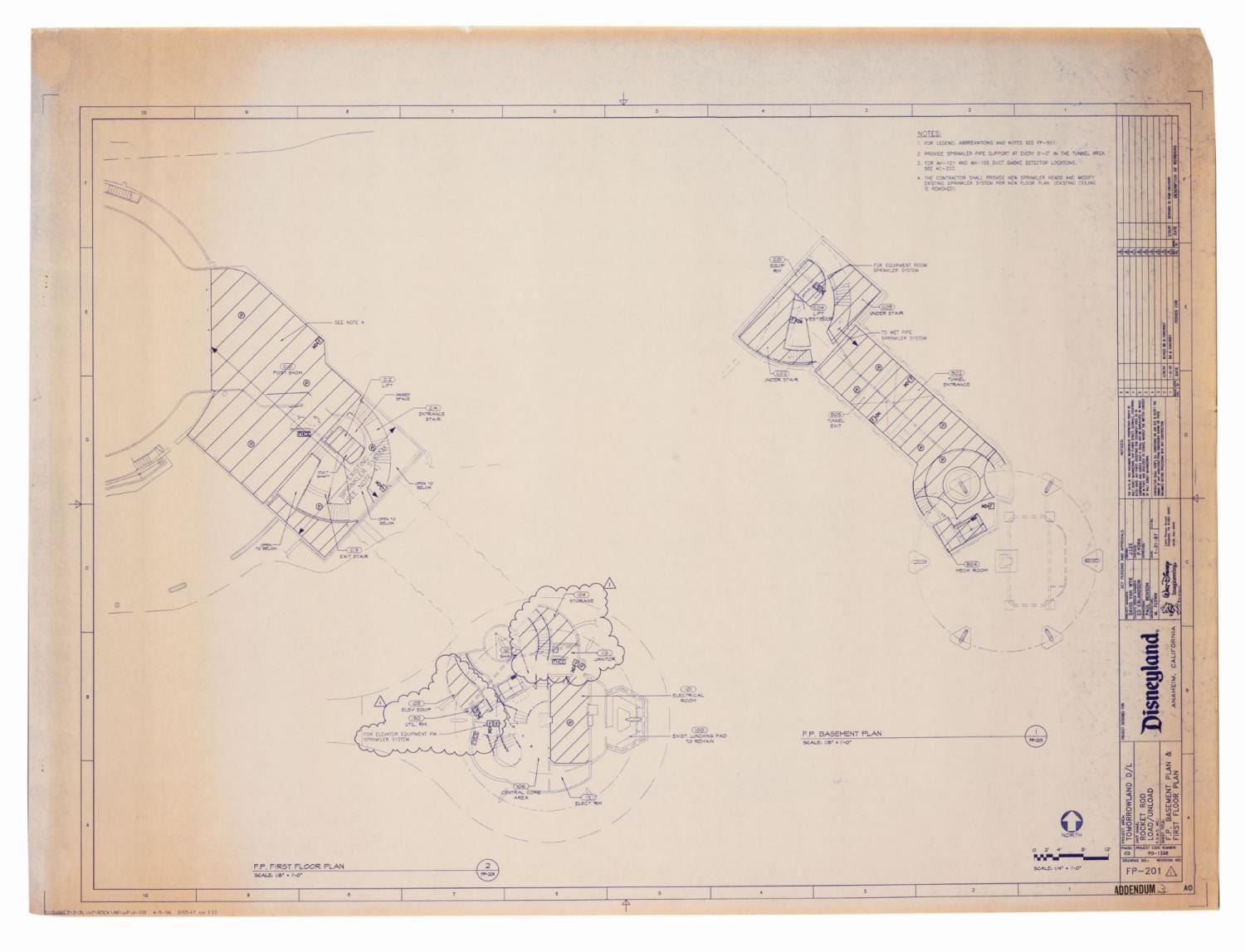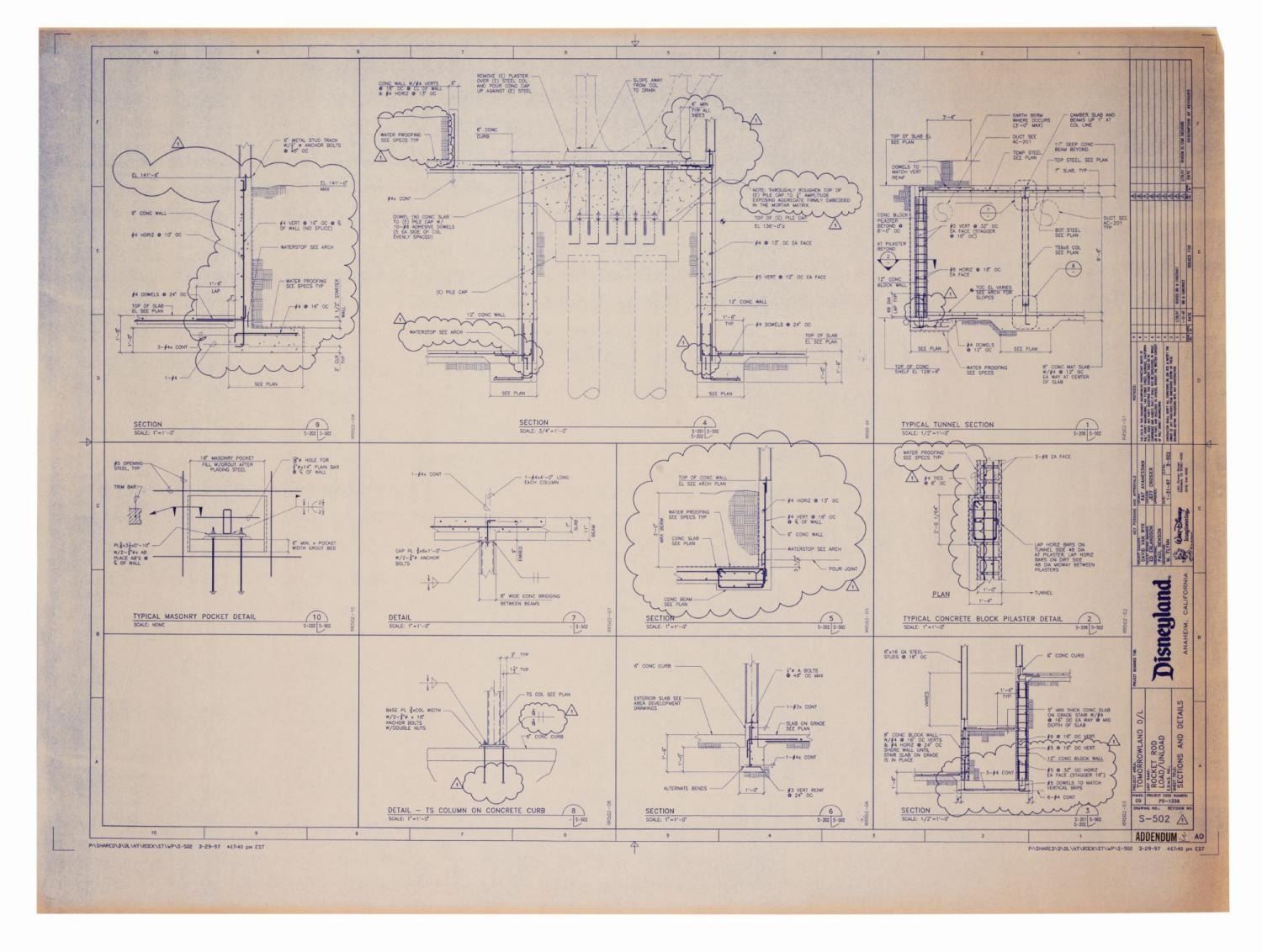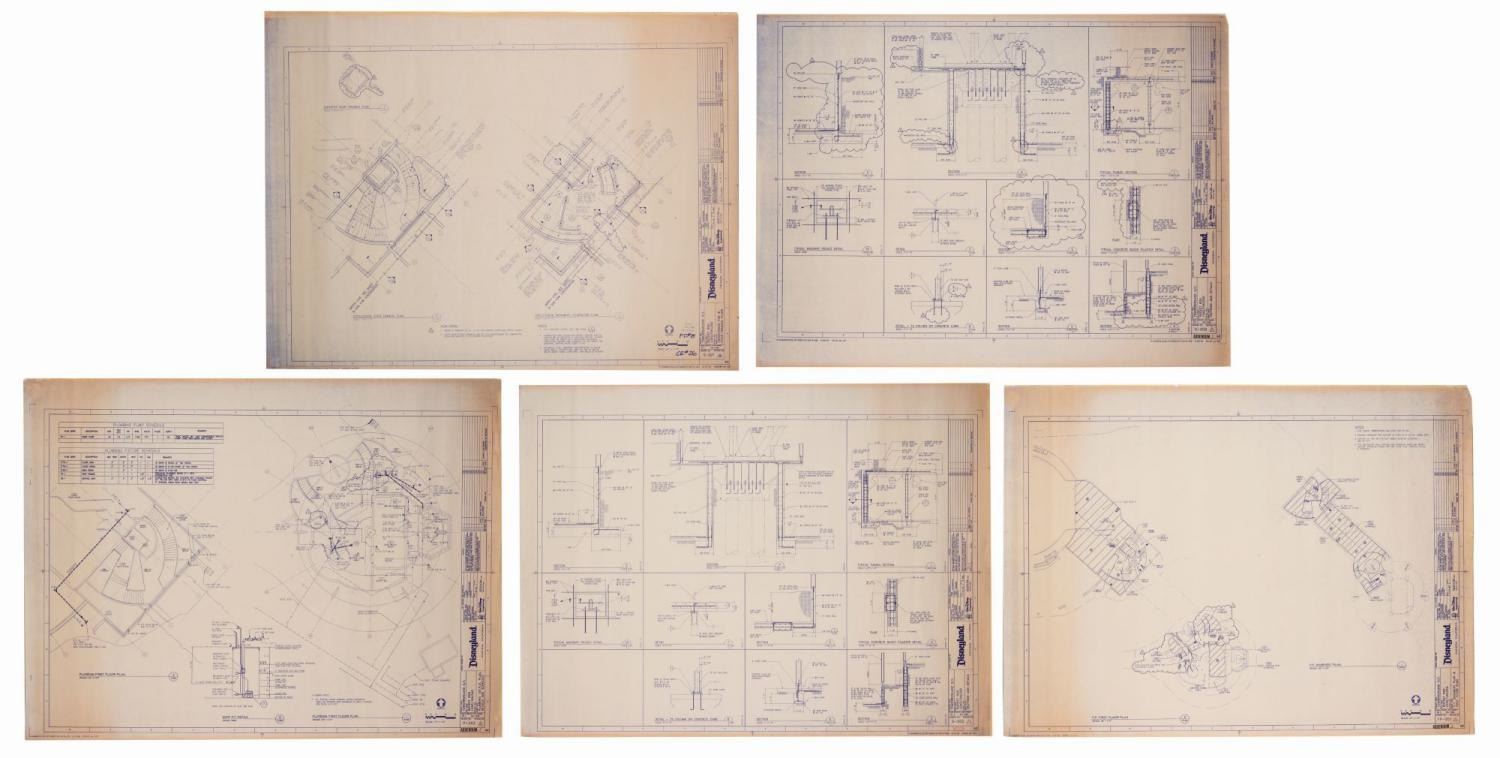 (Disneyland, 1997) A set of (5) blueline construction prints used in the development of the short-lived Rocket Rods attraction. The successor to the PeopleMover, it debuted on its same track as part of the 1998 New Tomorrowland project. These blueline prints depict various details of the loading and unloading areas, and include a few minor hand-written notes on one sheet. Each print measures 36"x46" and the set is in overall good used condition with handling wear, including small creases and tears along the edges.