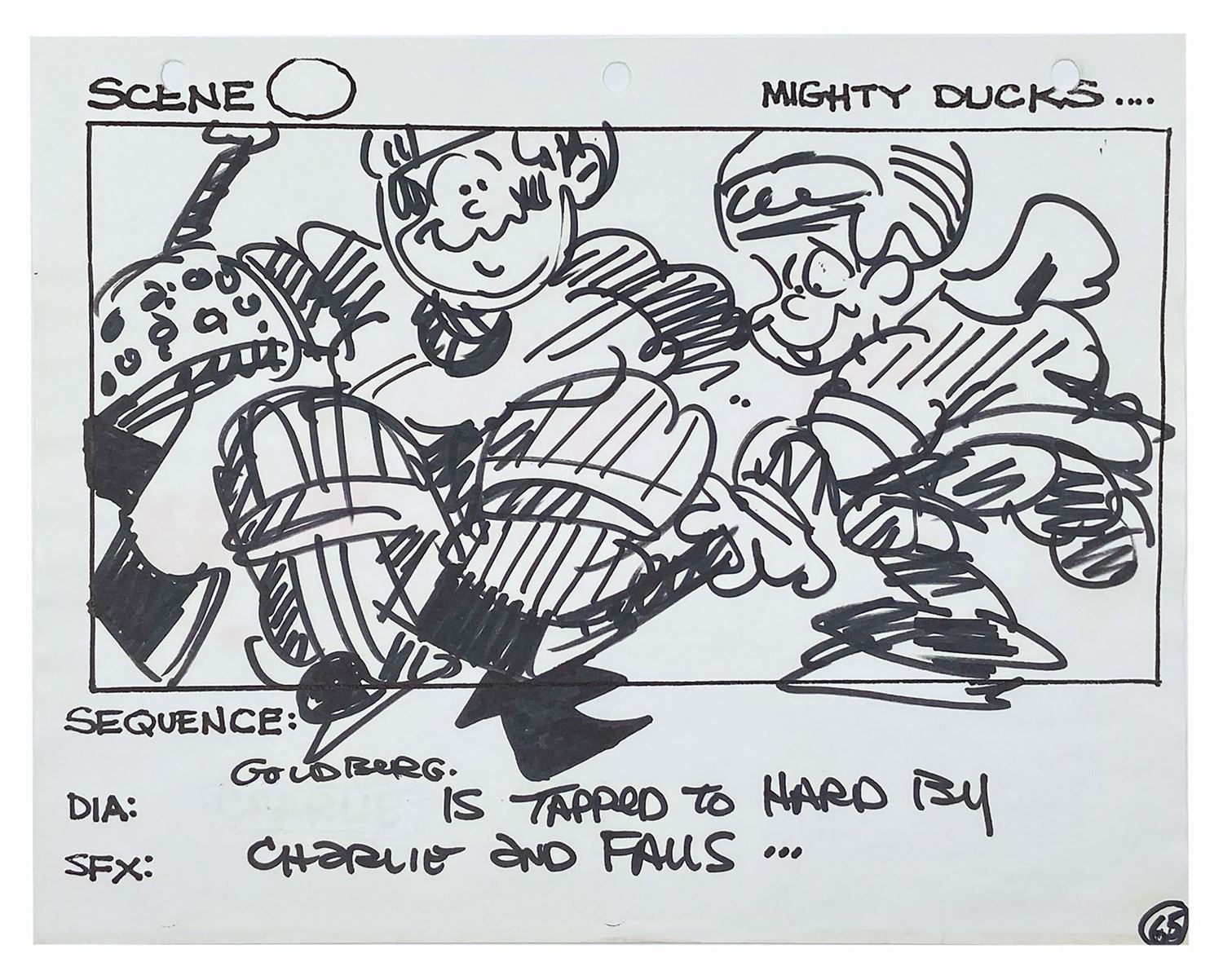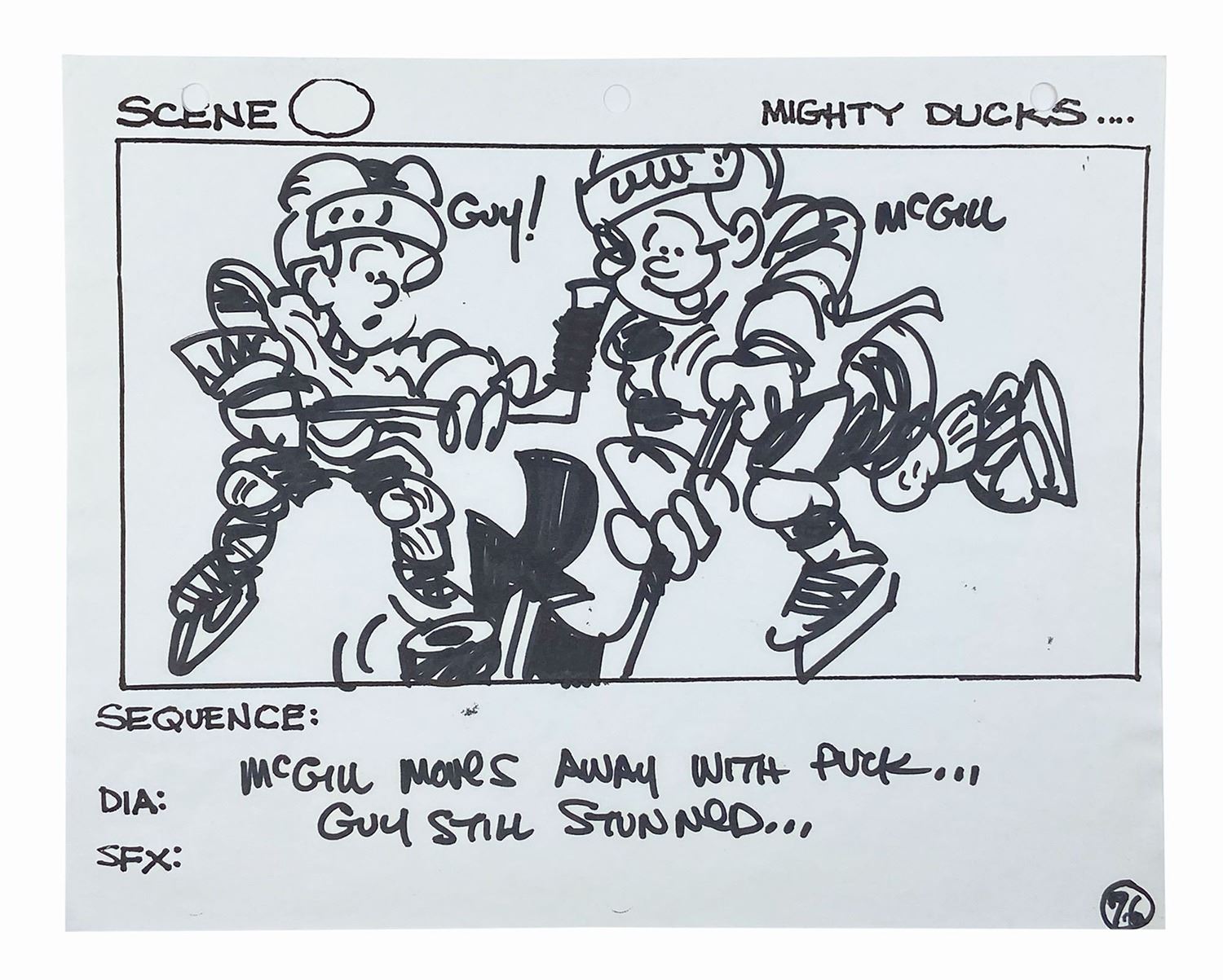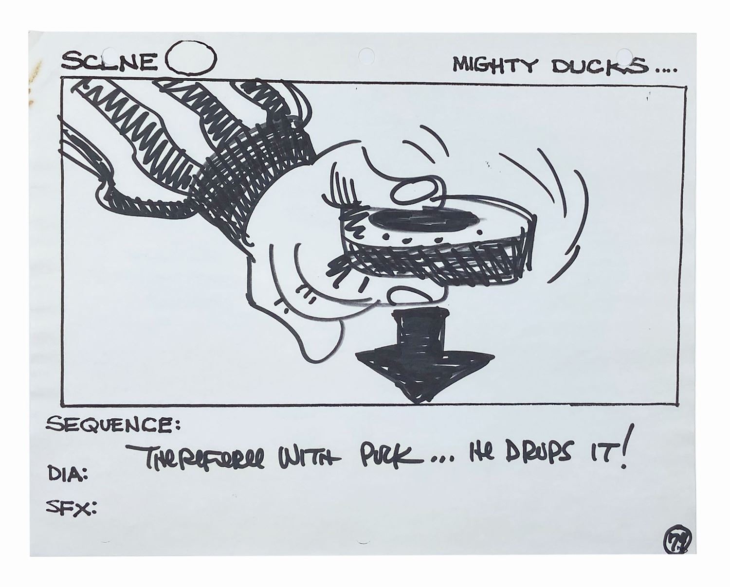 (Disney, 1992) A set of (5) storyboards from the hockey sequences in The Mighty Ducks. Each storyboard is accomplished in black felt pen on 8.5"x11" white 3-hole punch paper with an image area of roughly 5.25"x10". The artwork is notable for its cartoonish style and quality and depicts on-rink action during a game between the Ducks and their chief rival, the Hawks. A production call sheet for the depicted scenes is included with the lot. The storyboards are in fine condition and exhibit only minor wear from production handling. The call sheet is in good condition with bent corners and a few small tears at the punch holes.