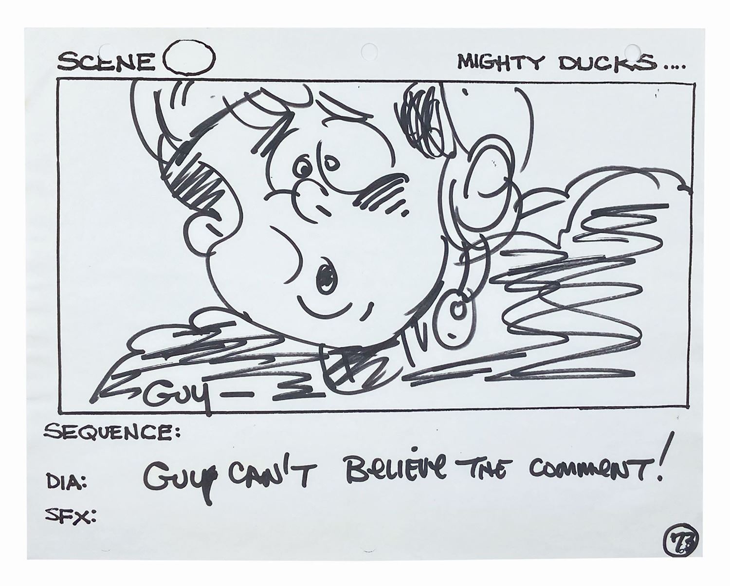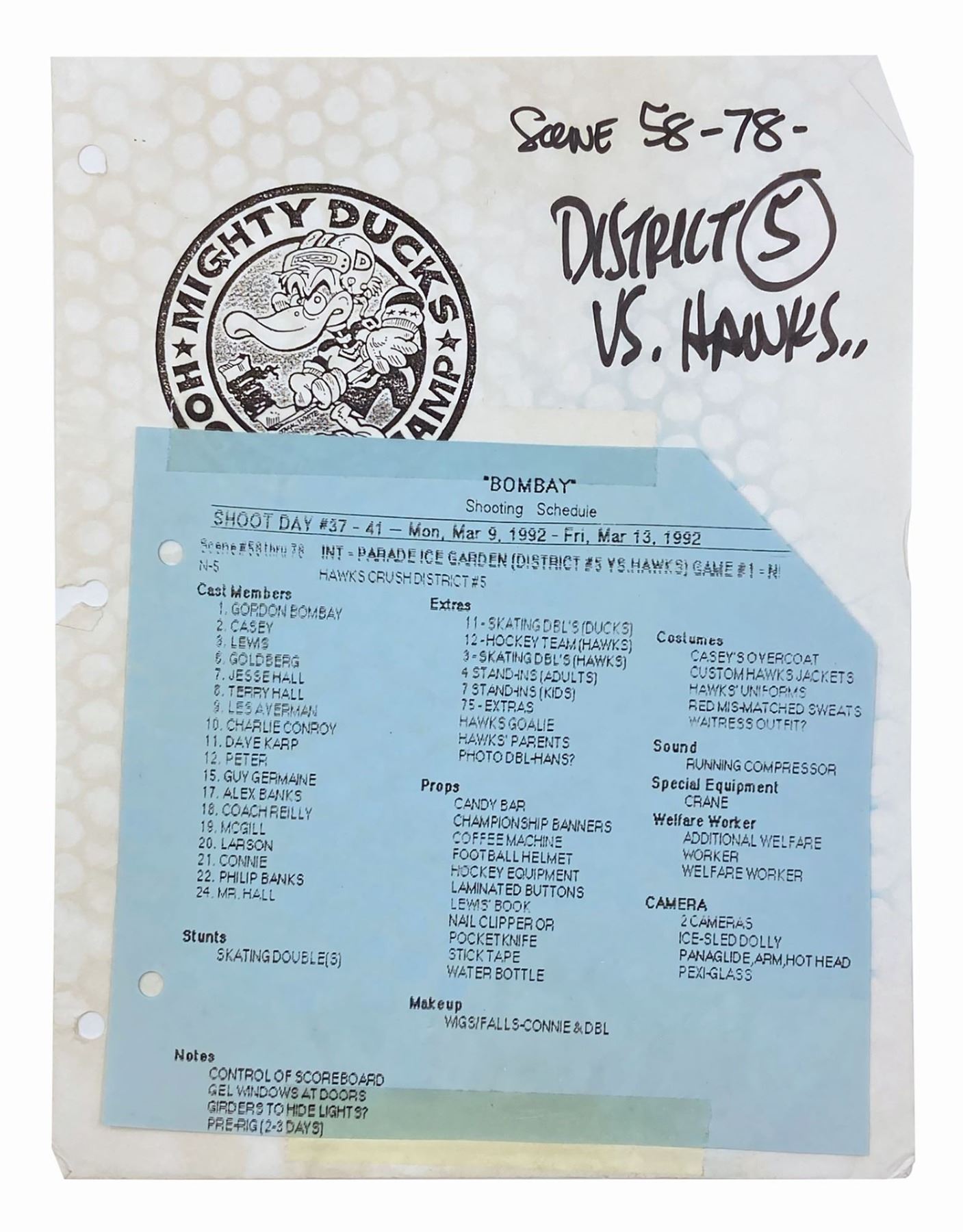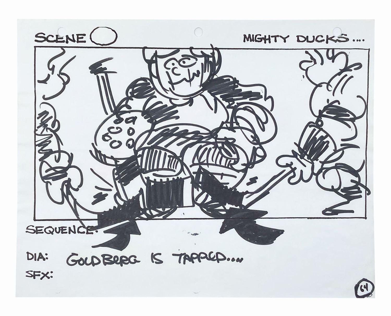 (Disney, 1992) A set of (5) storyboards from the hockey sequences in The Mighty Ducks. Each storyboard is accomplished in black felt pen on 8.5"x11" white 3-hole punch paper with an image area of roughly 5.25"x10". The artwork is notable for its cartoonish style and quality and depicts on-rink action during a game between the Ducks and their chief rival, the Hawks. A production call sheet for the depicted scenes is included with the lot. The storyboards are in fine condition and exhibit only minor wear from production handling. The call sheet is in good condition with bent corners and a few small tears at the punch holes.