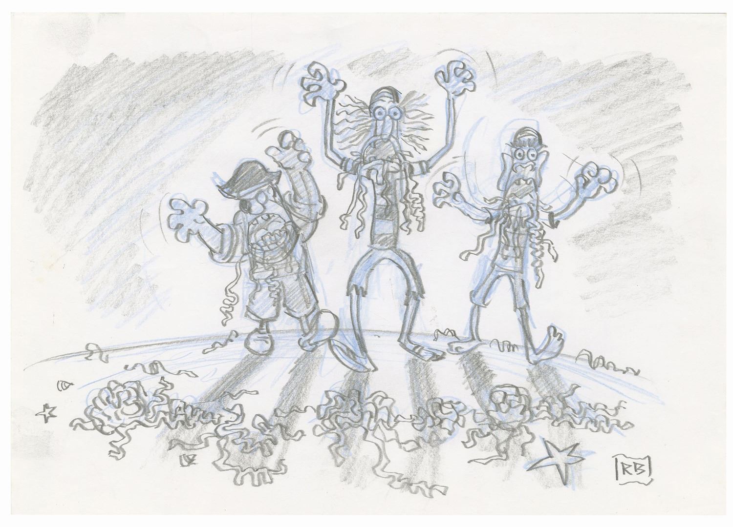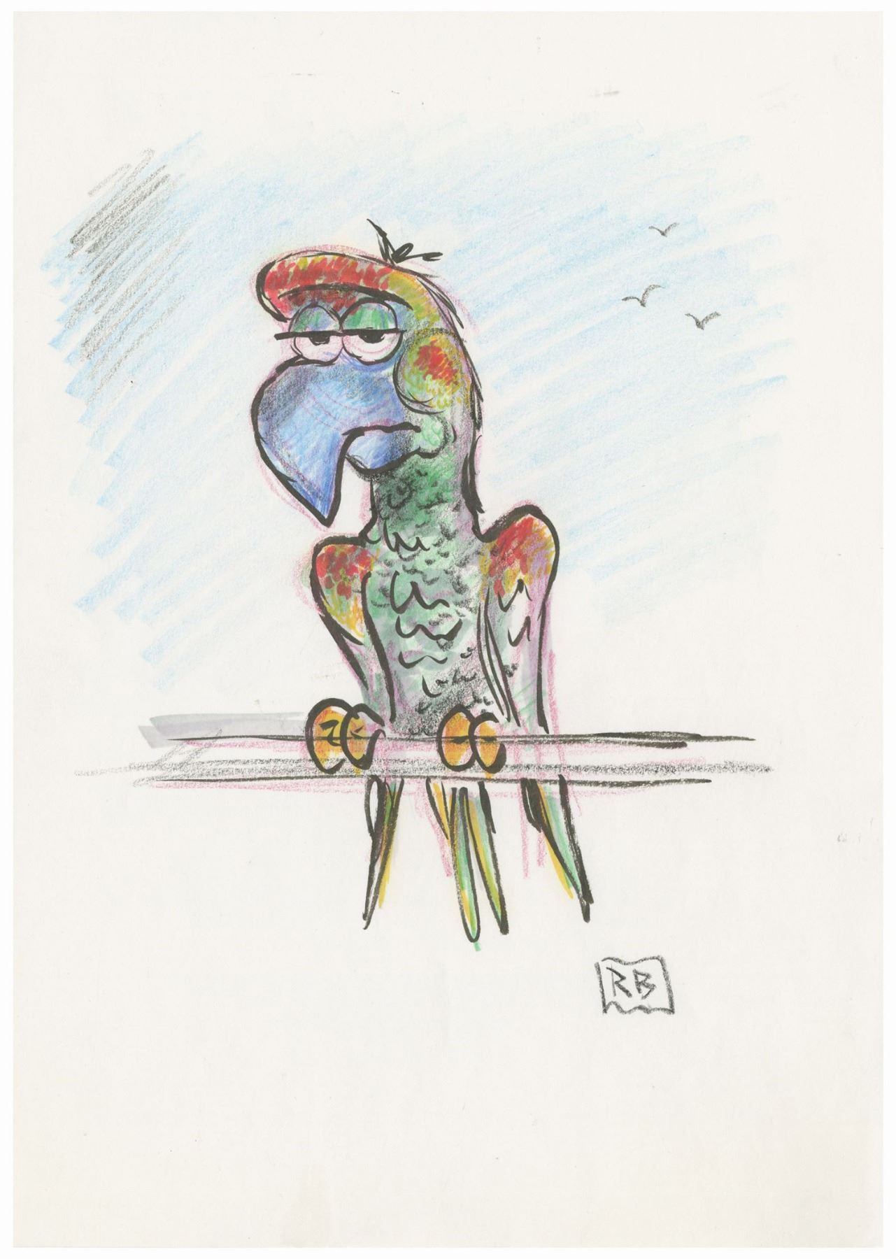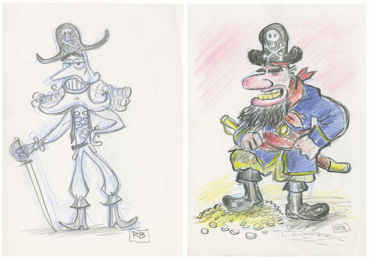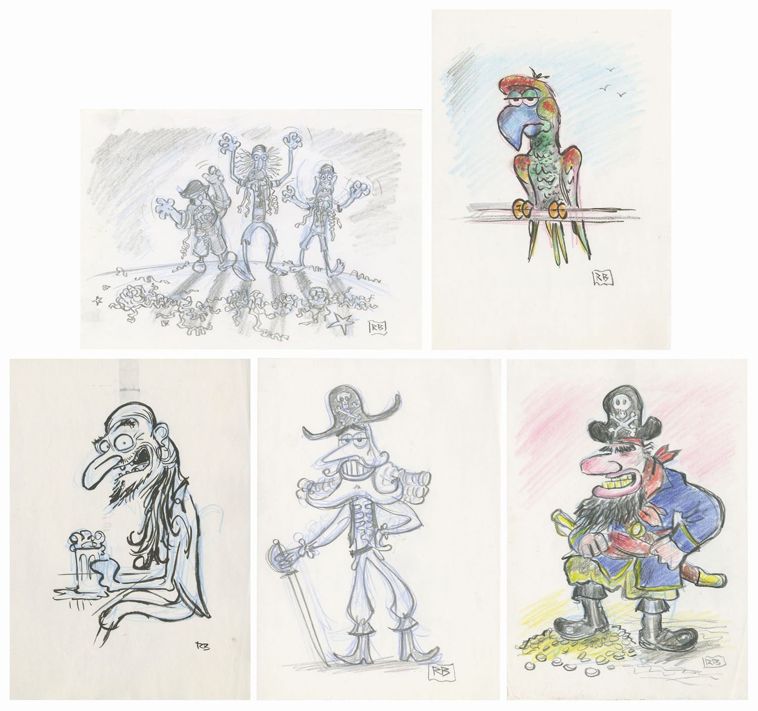 (Aardman, c.2010) A set of (5) hand-colored concept drawings by Richard Bazley for The Pirates! Band of Misfits. The drawings are accomplished in pencils and ink on thin art paper and depict a variety of pirate characters as well as the pirate captain's parrot. Each drawing is initialed by Bazley, and the sheets of paper measure 11.75"x8.25" each. The condition is very good with little wear.