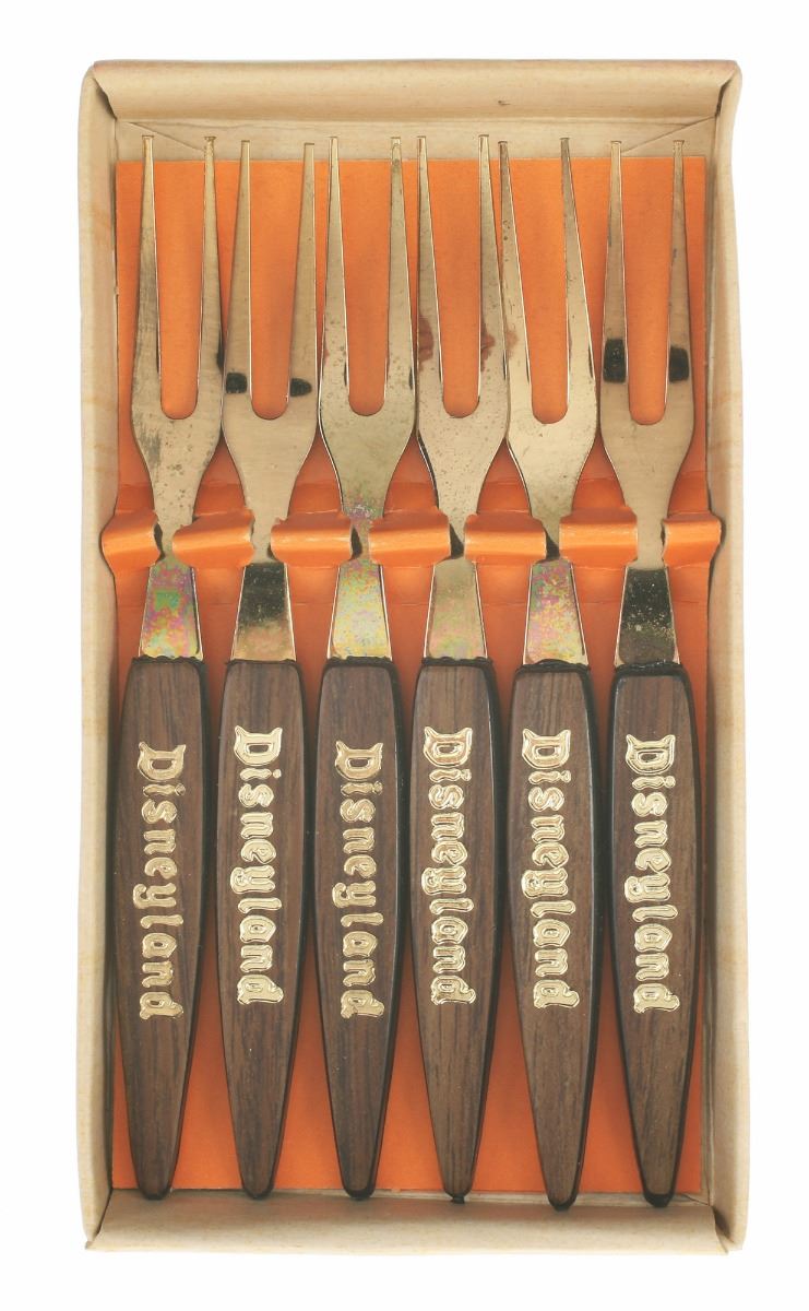 (Disneyland, 1960s) Boxed set of (6) bronze-plated mini forks from Disneyland, featuring brown wood-like handles with "Disneyland" written in gold. Box measures 4.5"x2.6" and 0.5" tall. Each fork measures 4.2"x0.4". Set is in good condition with minor wear to the box.