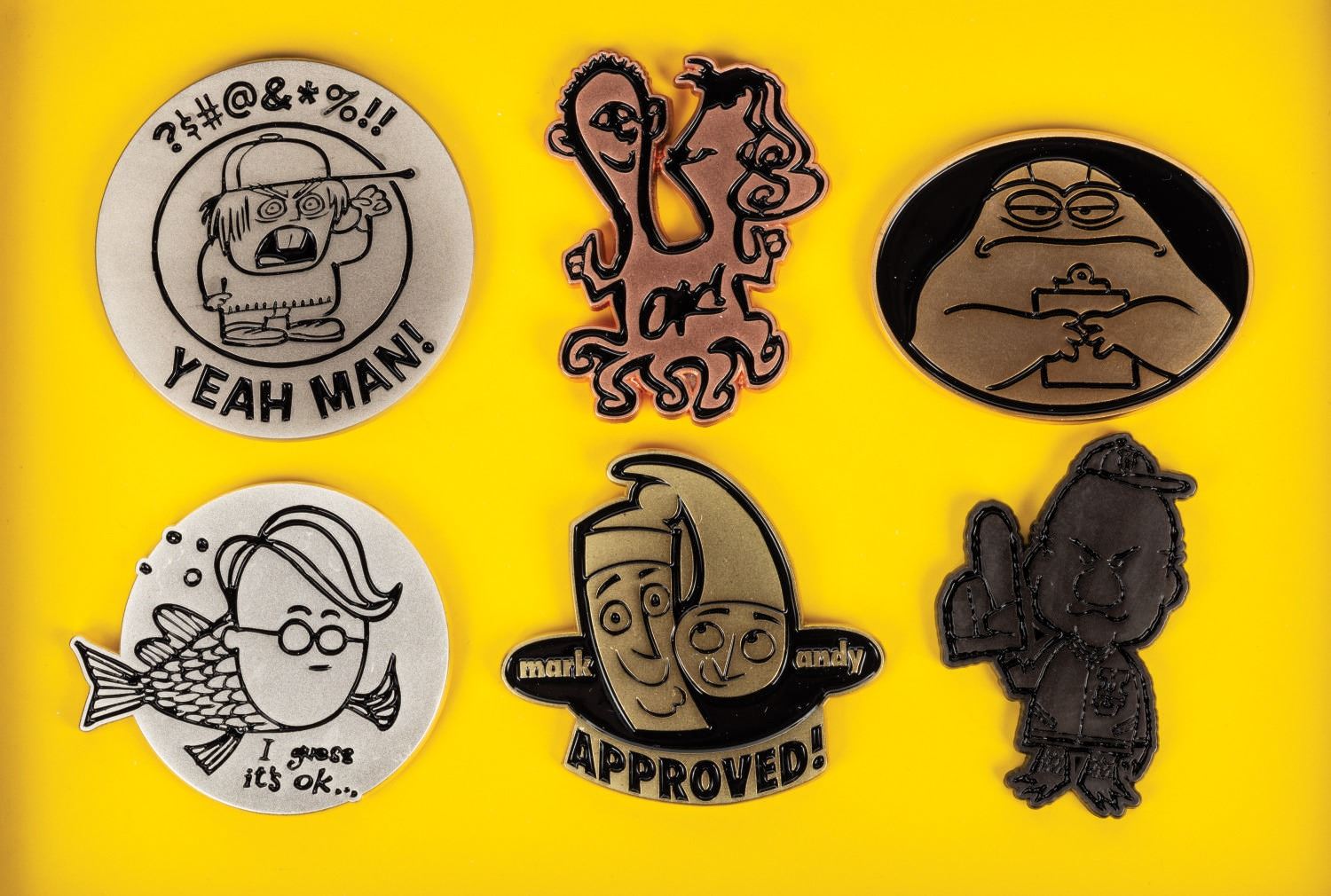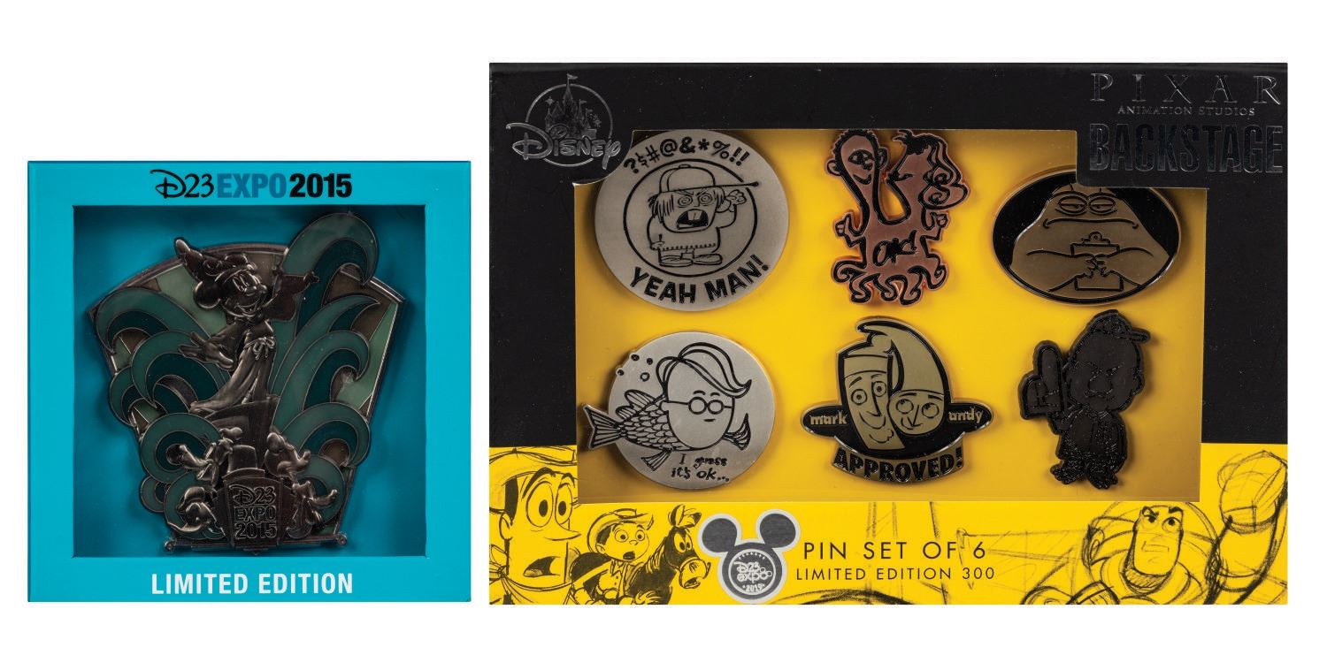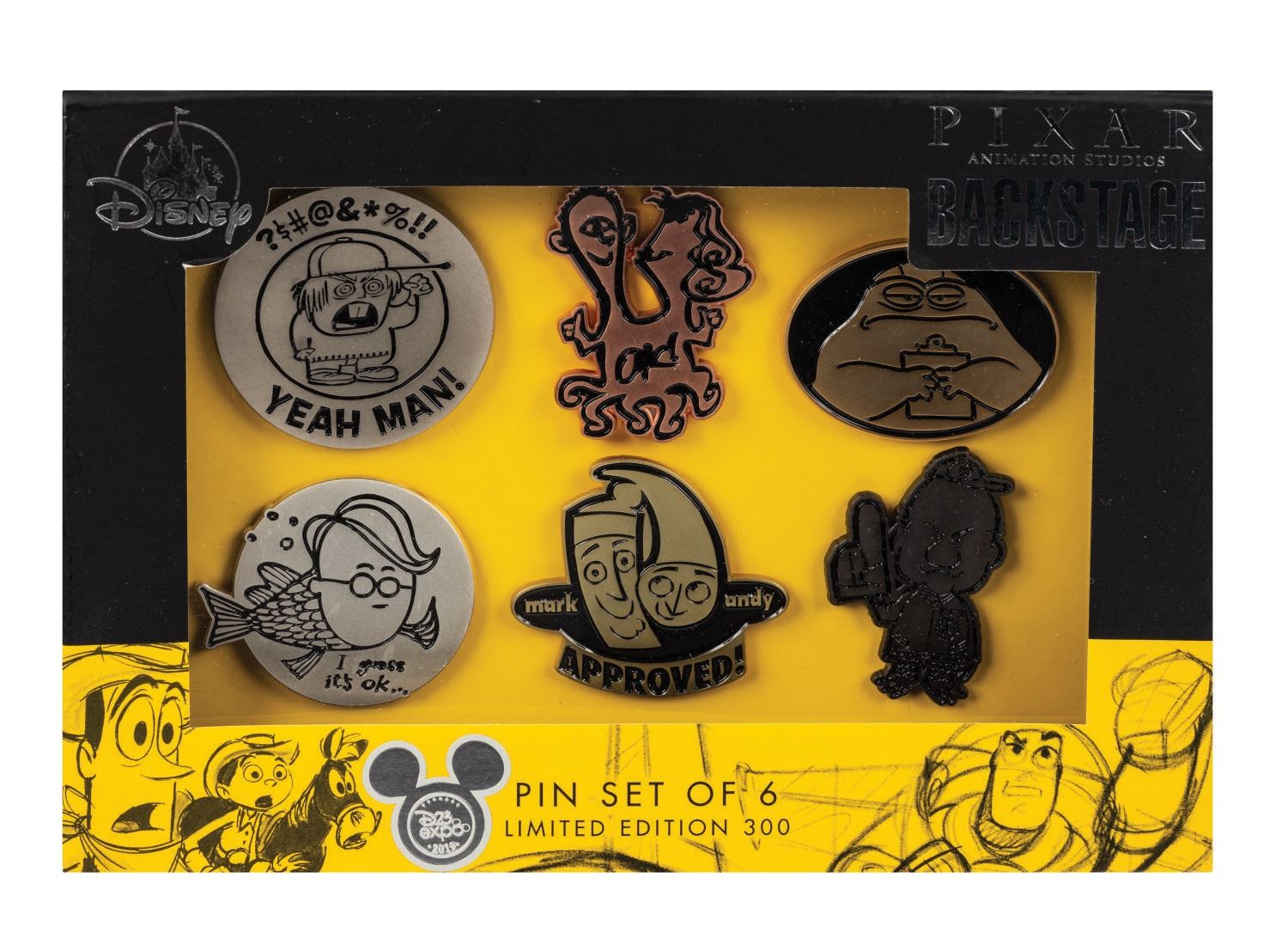 (Disney/Pixar, 2019) A set of six pins based on Pixar director approval stamps, released as a limited edition of 300 at the 2019 D23 convention in Anaheim. This set displays the creativity and humor of the incredibly inventive Pixar team. Each Pin measures approximately 1.75" in diameter, and are still in the original 5"x7" display box. The box and contents are in fine condition.
