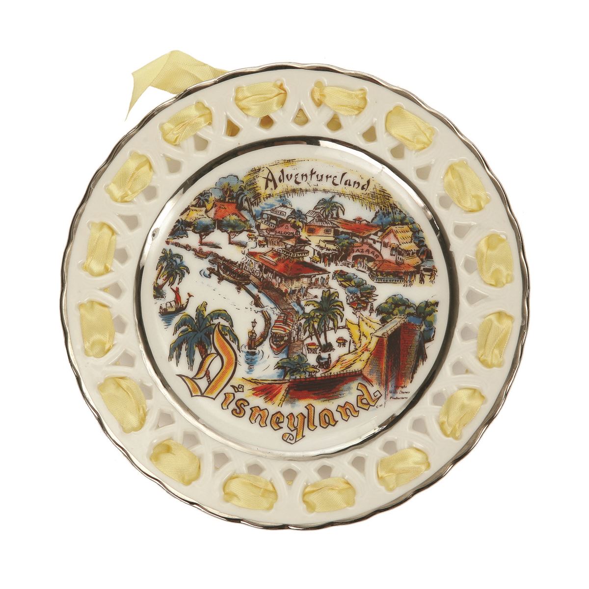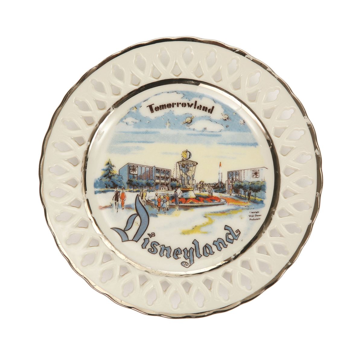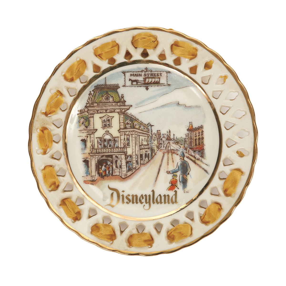 (Disneyland, 1950s) A beautiful collection of 6 Disneyland laced plates by Eleanor Welborn Art Productions featuring Adventureland, Tomorrowland, Frontierland, Fantasyland, and two different but related Main Street plates. Each plate measures 6.5" in diameter. In good condition, with some plates missing their ribbons or portions of their ribbons. Some areas of minor wear and scuffing throughout.