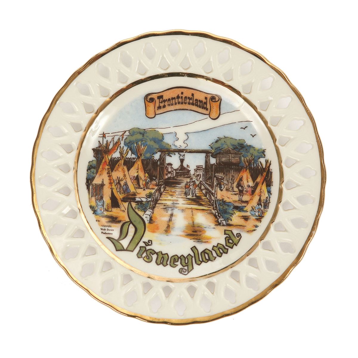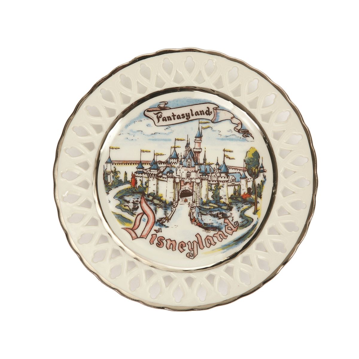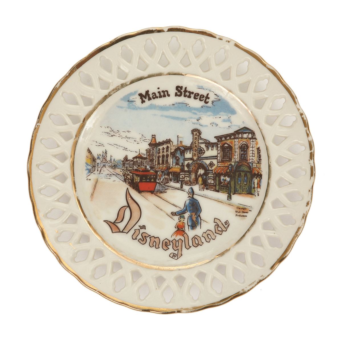 (Disneyland, 1950s) A beautiful collection of 6 Disneyland laced plates by Eleanor Welborn Art Productions featuring Adventureland, Tomorrowland, Frontierland, Fantasyland, and two different but related Main Street plates. Each plate measures 6.5" in diameter. In good condition, with some plates missing their ribbons or portions of their ribbons. Some areas of minor wear and scuffing throughout.