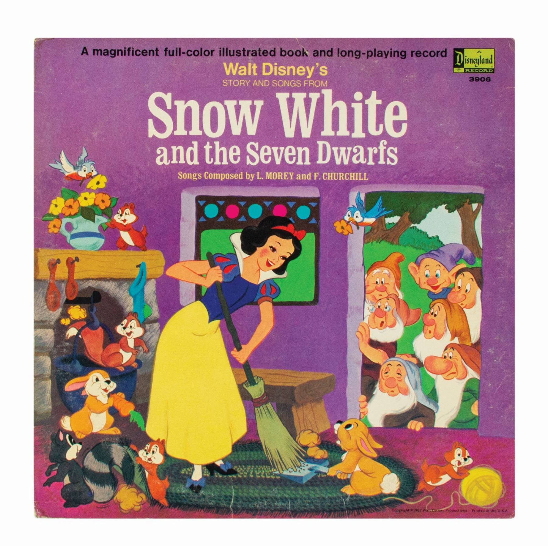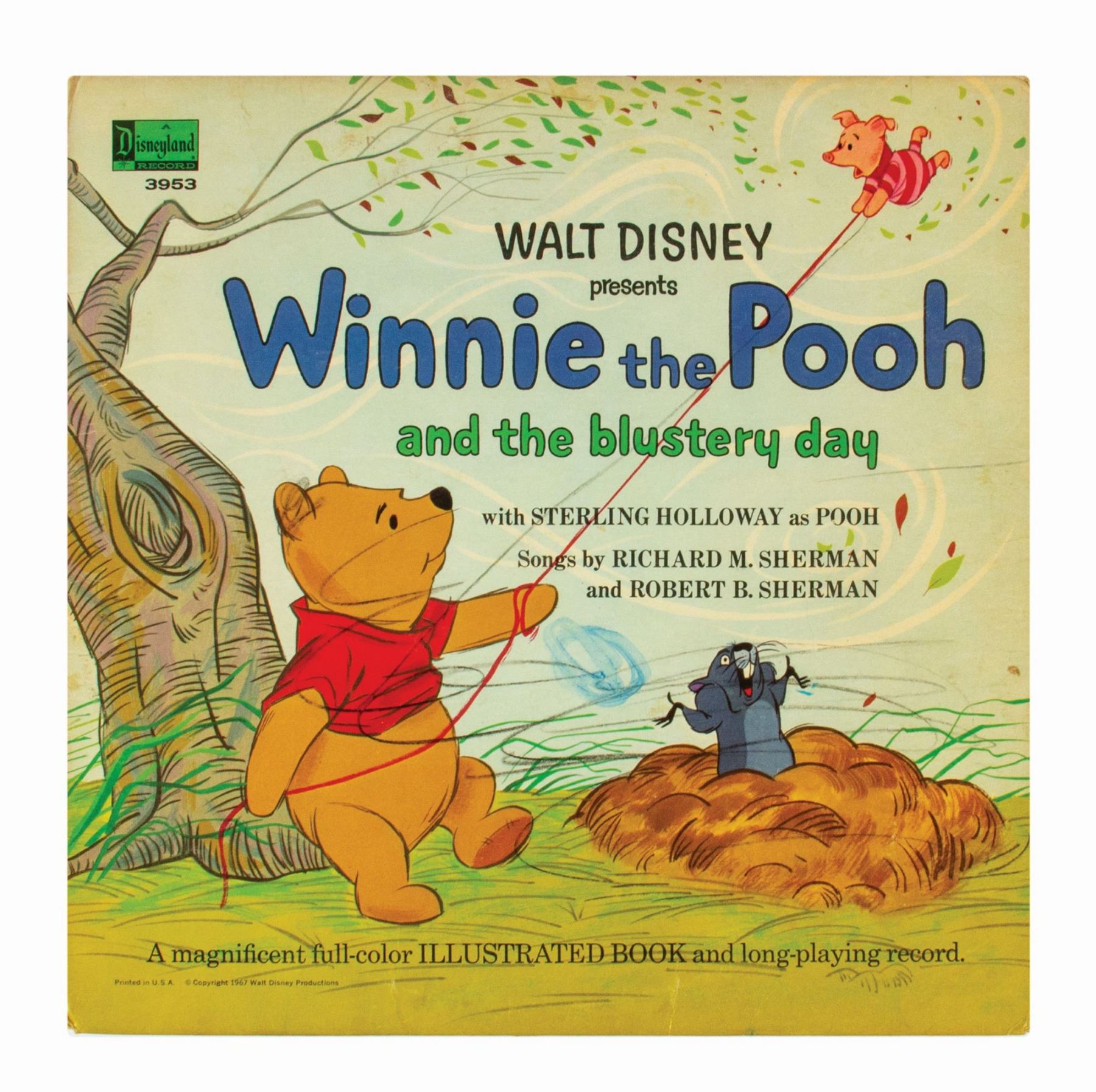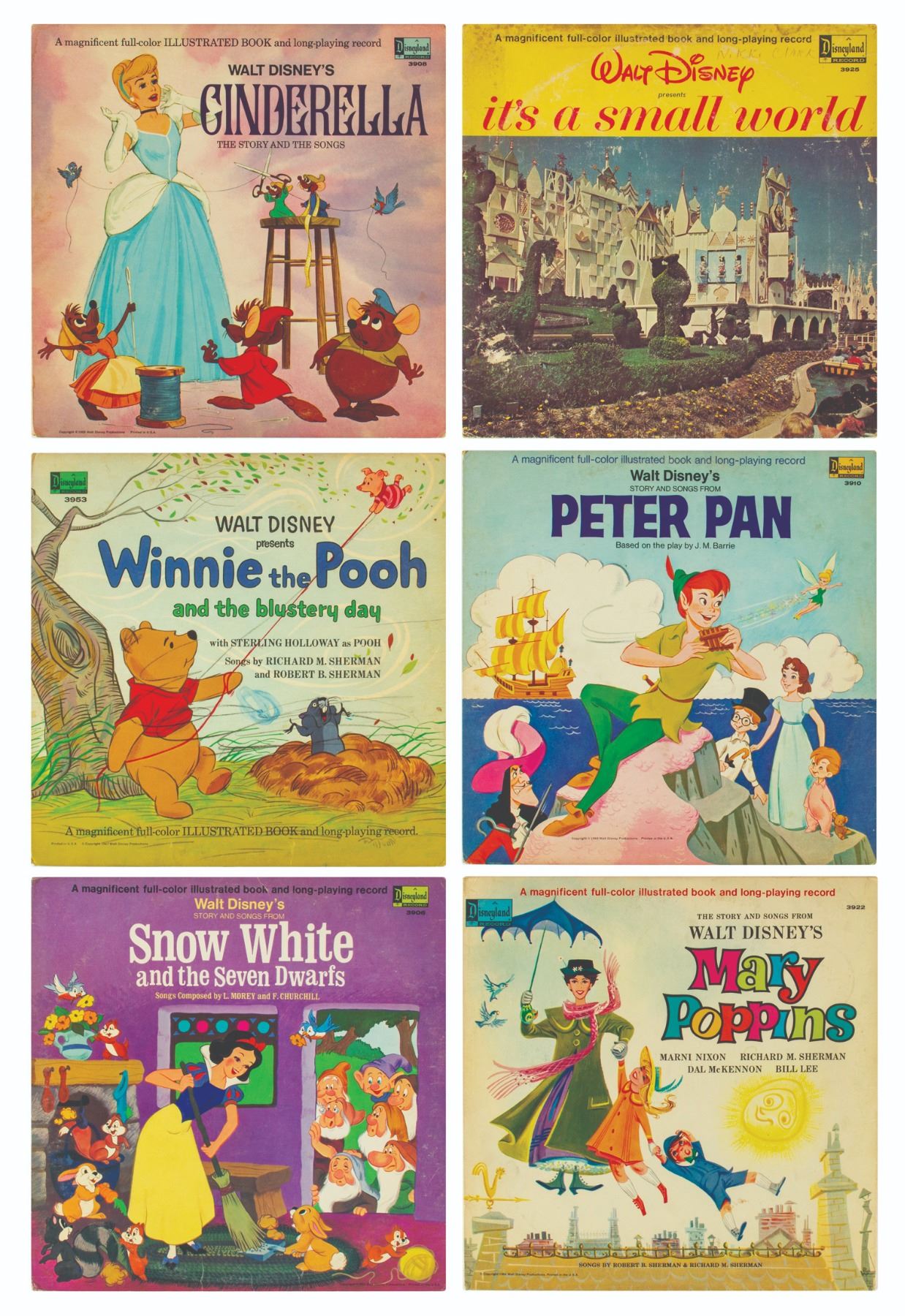 (Walt Disney Studios, 1960s) A collection of (6) Disney records with attached storybooks based on the films: Snow White and the Seven Dwarfs, Winnie the Pooh and the Blustery Day, Peter Pan, Mary Poppins, and Cinderella, as well as the Disneyland attraction It's a Small World. The records each measure 12.25"x12.25" within their storybook covers. The condition is fair to good overall with some minor surface scratches to the records from previous use. The Snow White record has a thin crack through half of record, but is still intact. The album covers have some surface and edge wear, and the Winnie the Pooh cover has been drawn on by the original owner. Several of the Mary Poppins storybook pages are missing.