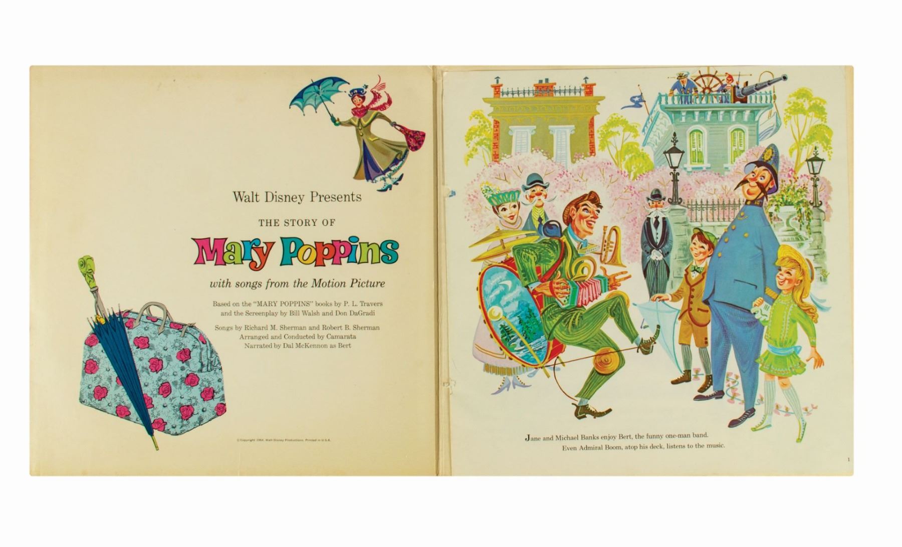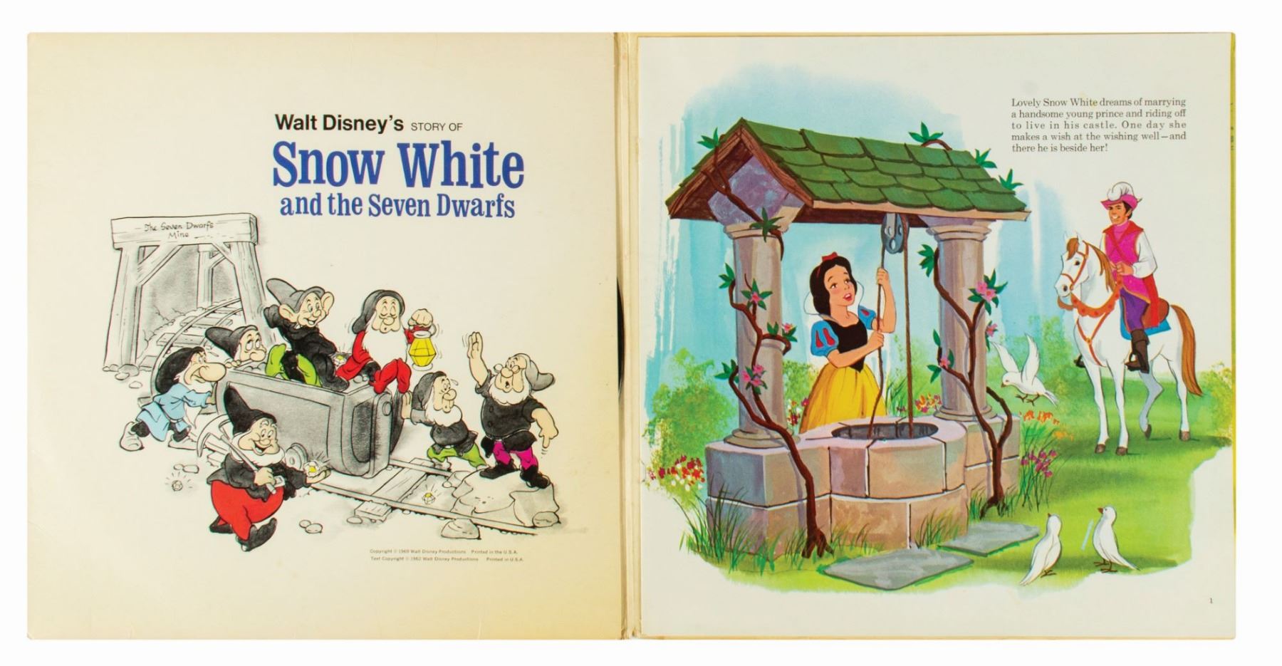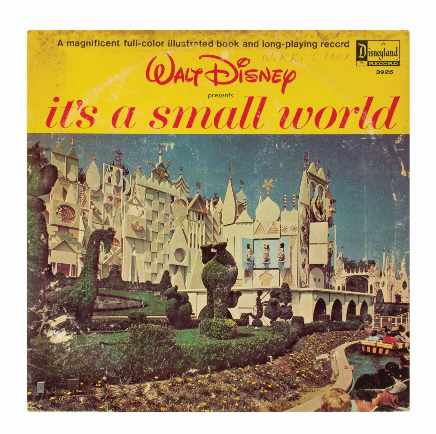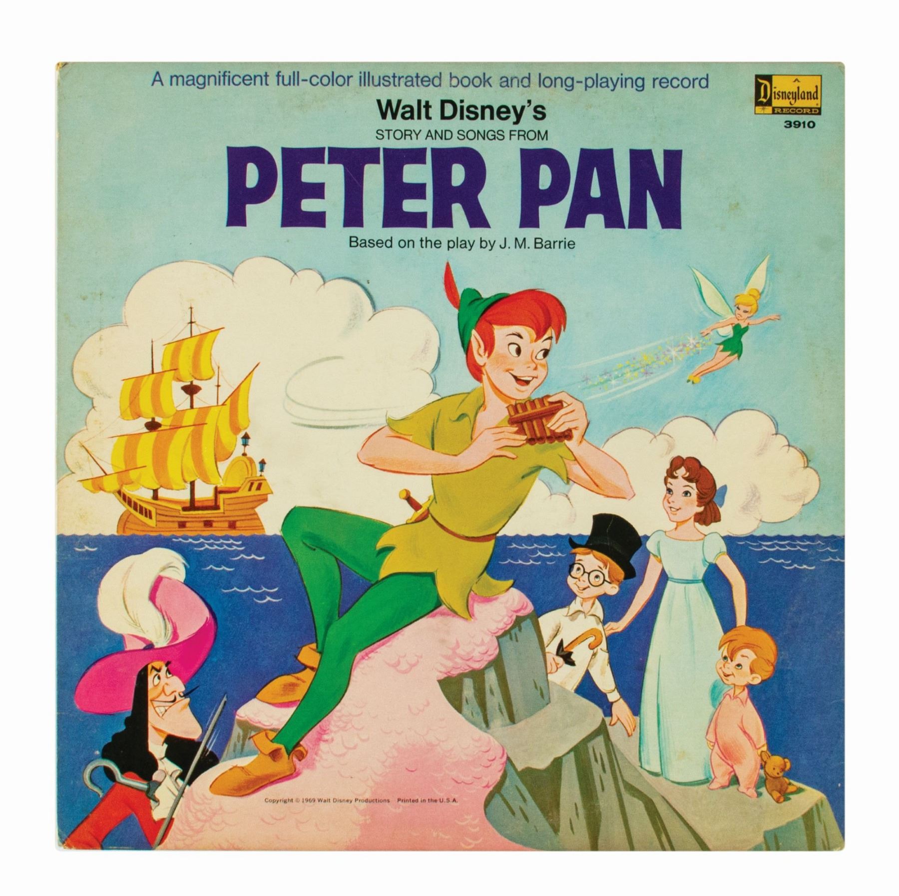 (Walt Disney Studios, 1960s) A collection of (6) Disney records with attached storybooks based on the films: Snow White and the Seven Dwarfs, Winnie the Pooh and the Blustery Day, Peter Pan, Mary Poppins, and Cinderella, as well as the Disneyland attraction It's a Small World. The records each measure 12.25"x12.25" within their storybook covers. The condition is fair to good overall with some minor surface scratches to the records from previous use. The Snow White record has a thin crack through half of record, but is still intact. The album covers have some surface and edge wear, and the Winnie the Pooh cover has been drawn on by the original owner. Several of the Mary Poppins storybook pages are missing.