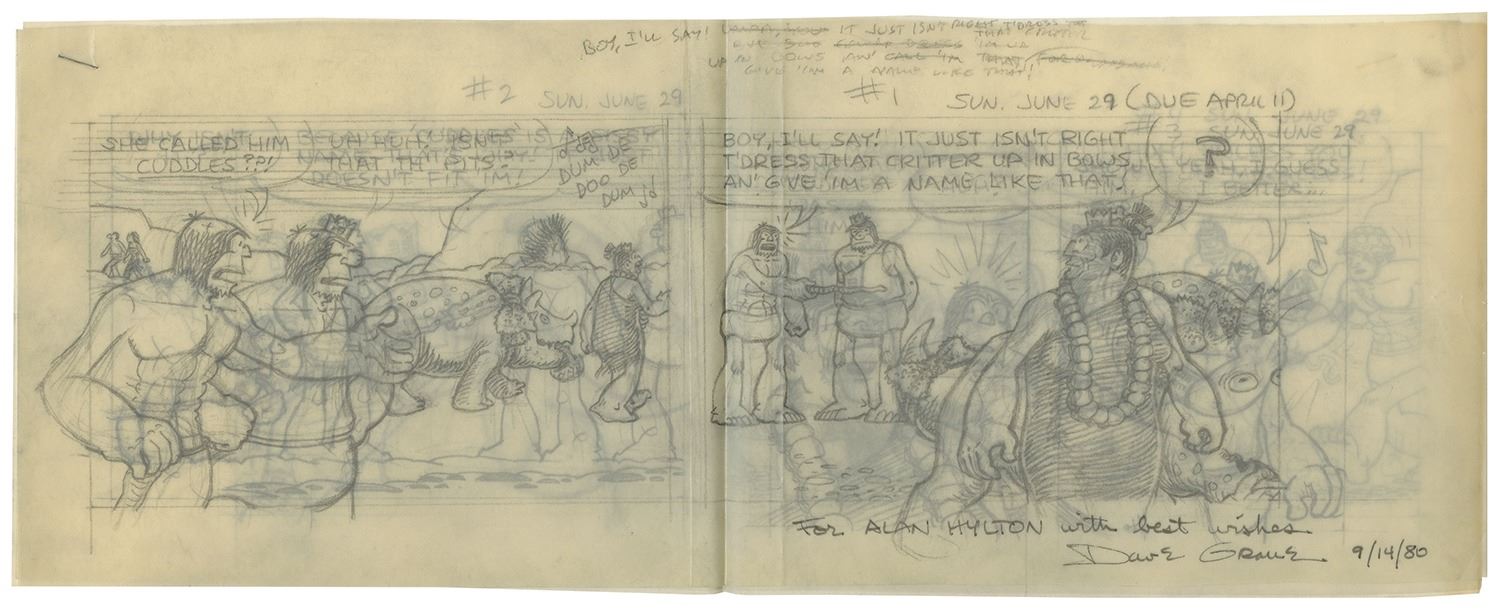 (Graue, 1980) A collection of (6) sheets of hand-drawn comic strip panels by artist Dave Graue for the popular comic series, Alley Oop. Each sheet is accomplished in pencil on vellum, and Graue personalized and signed one of the panels to a fan, Alan Hylton. Each vellum sheet measures 7.5"x17", and the set is in overall very good condition with minor wear from use, and a vertical fold in the center from being mailed. Three of the sheets are stapled together in the top-left corner.