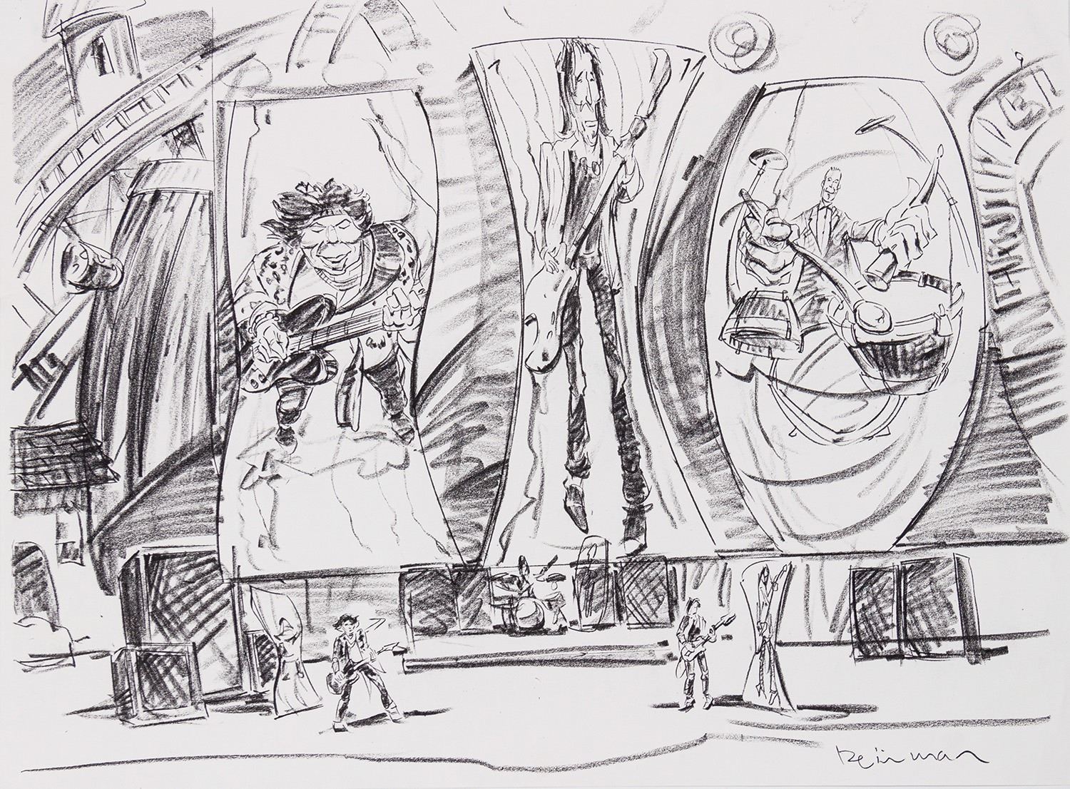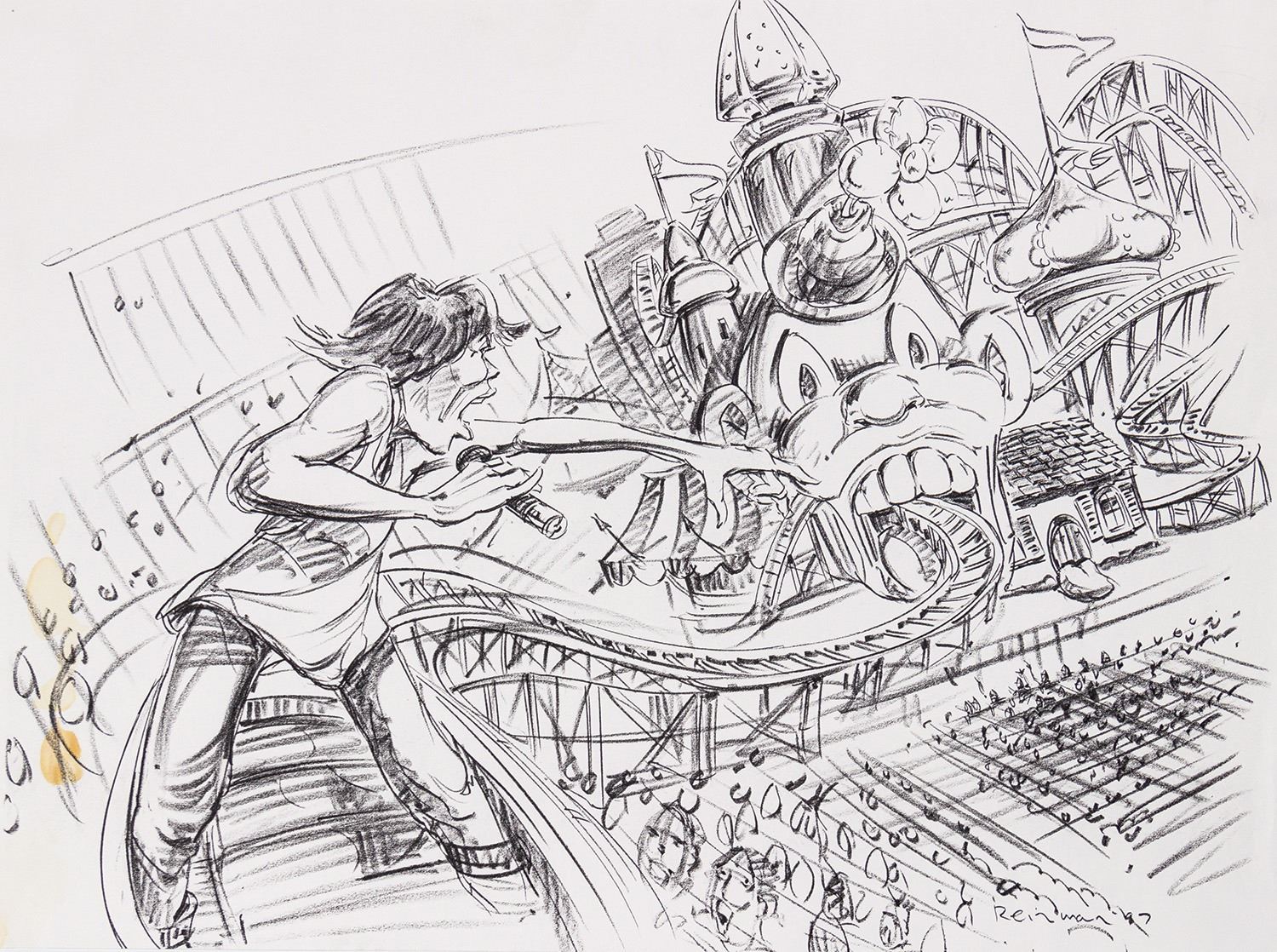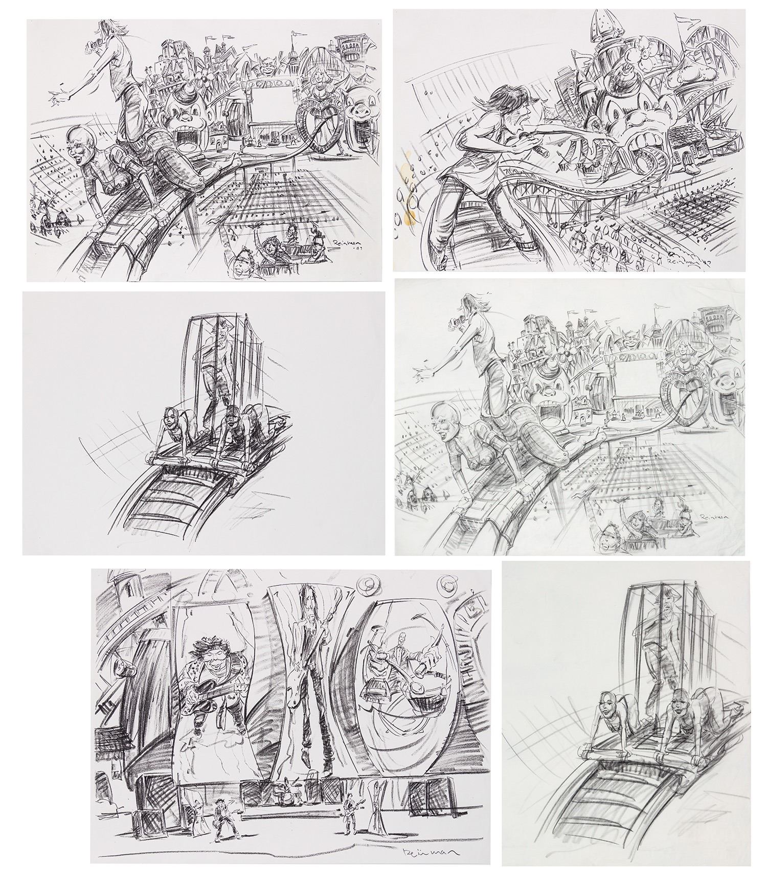 (Landmark Entertainment, c.1997) A collection of (2) original concept art drawings and (4) xerox prints for a potential Rolling Stones theme park style attraction. These concepts feature a carnival-like stage setup, featuring a "Tunnel of Love" which has a roller coaster-like track to take Mick Jagger out into the crowd. Ranging in size from 17"x14" to 19"x24", the pencil drawings and xerox prints are in very good condition with expected wear from age and use, including some spots of creasing along the edges.